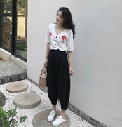 花の刺繍が可愛いトップスとジョガーパンツの2点セットです。