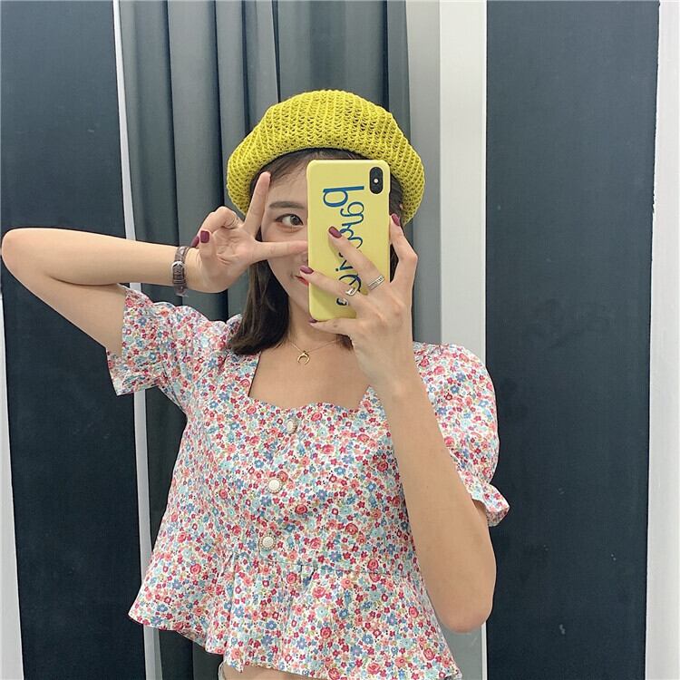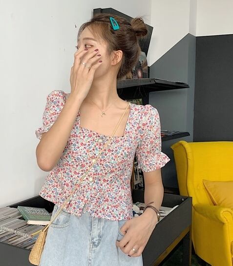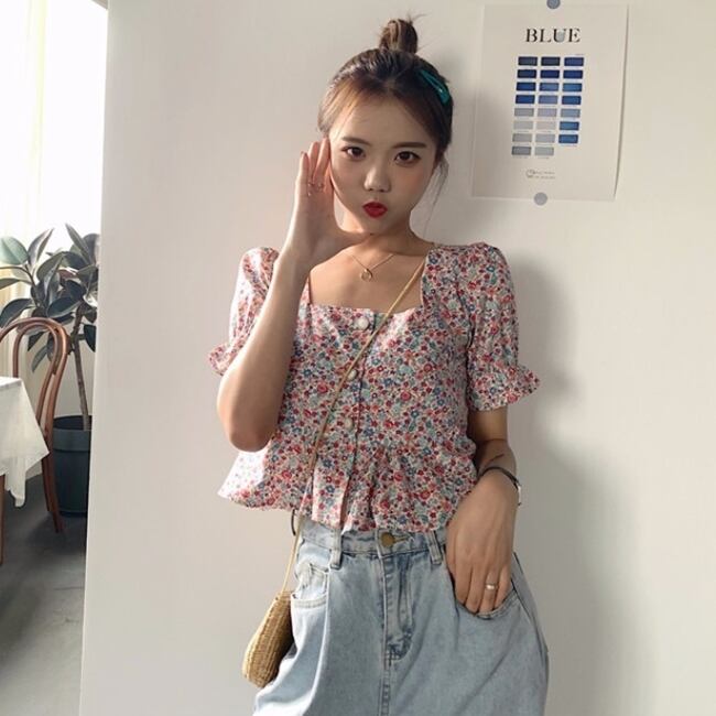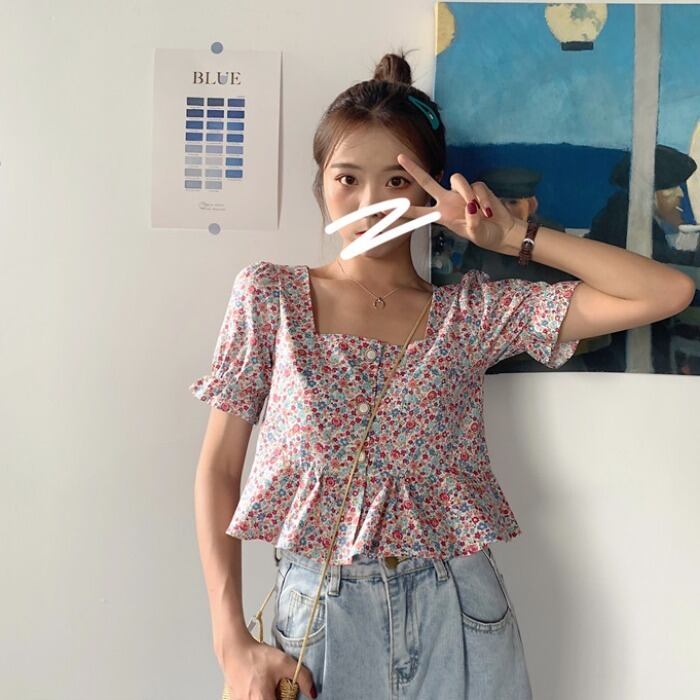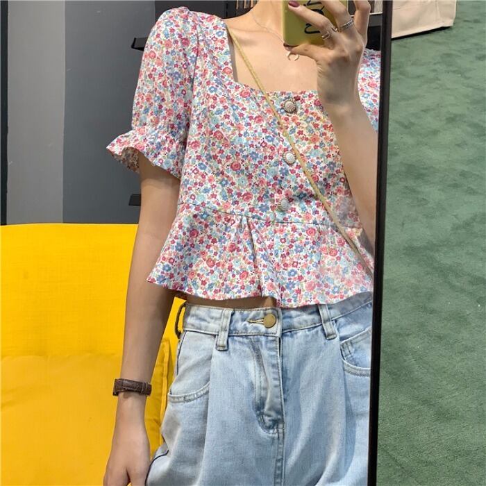 トップス 小花柄 ペプラム ブラウス ショート丈 フリル 半袖 スクエアネック フロントボタン カジュアル ガーリー 可愛い デート 春 夏