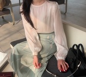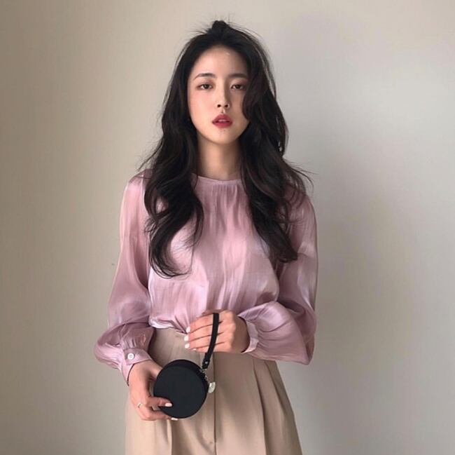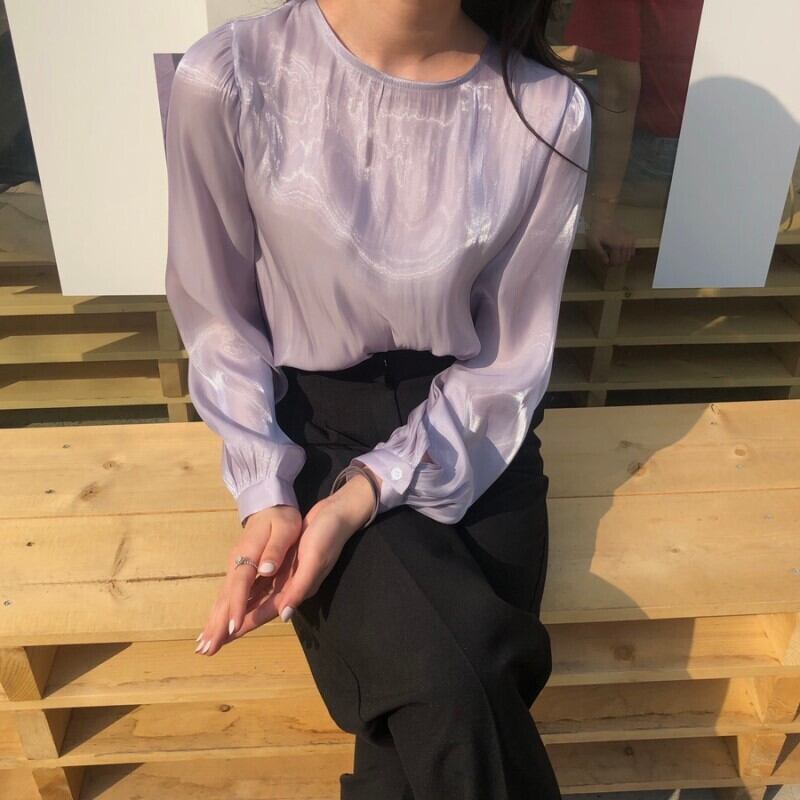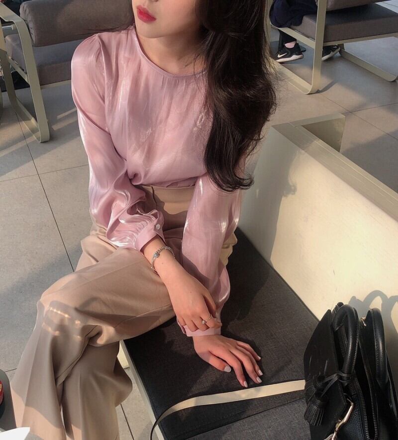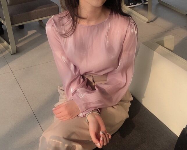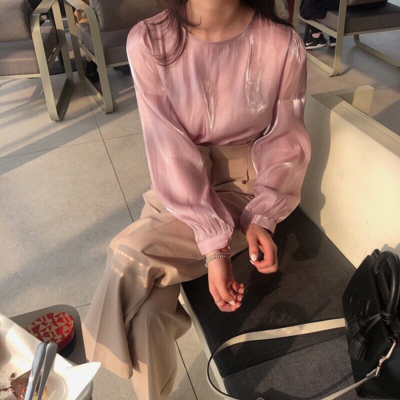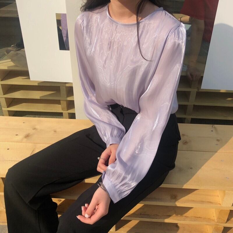 全3色 トップス ブラウス 光沢 ゆったりめ ラウンドネック 長袖 メタリック カジュアル きれいめ 上品 大人可愛い デート 女子会 韓国ファッション 春 夏