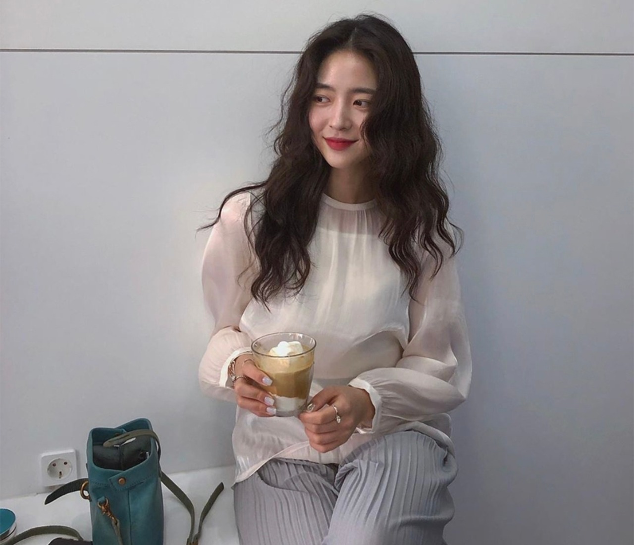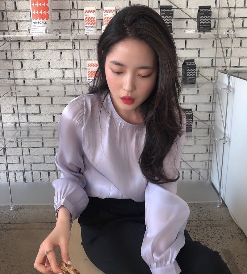 光沢のある生地がフェミニンで上品な印象のブラウスです。