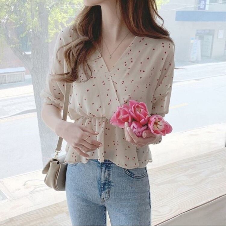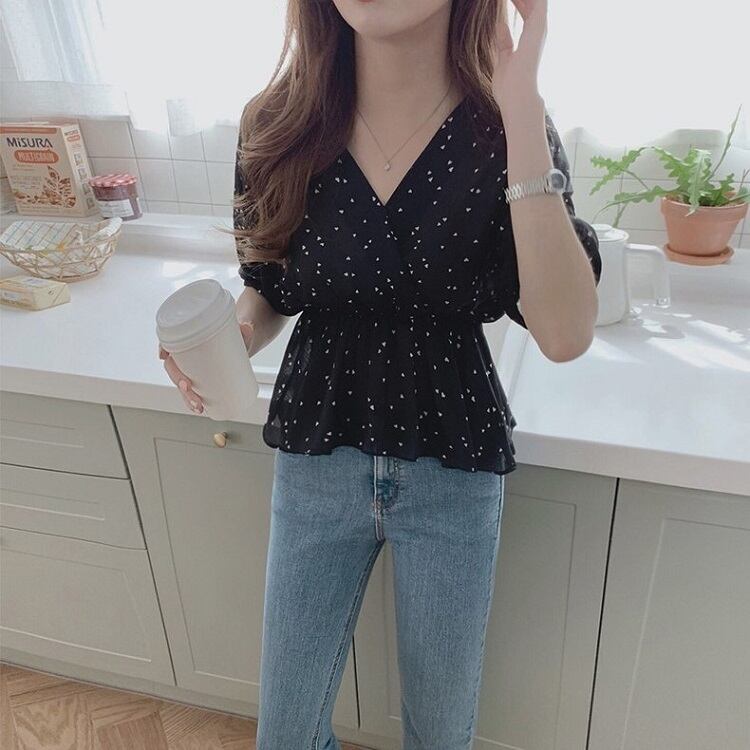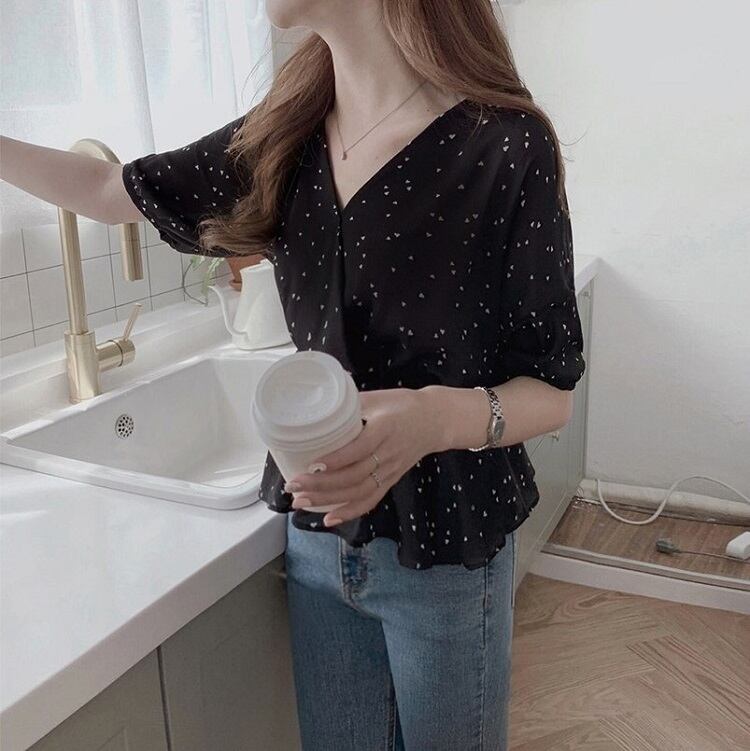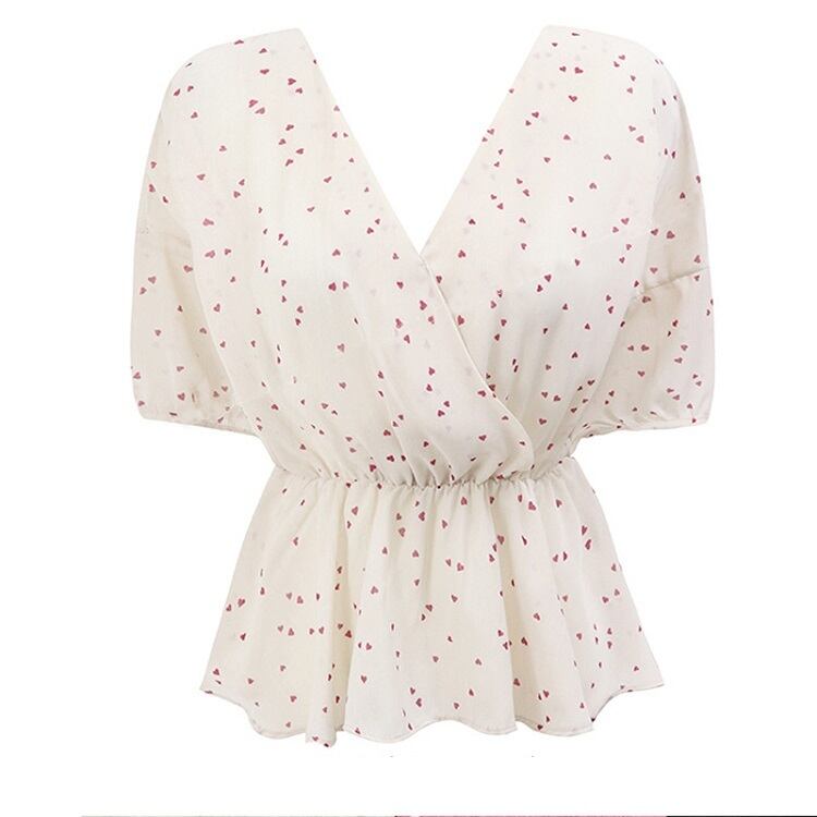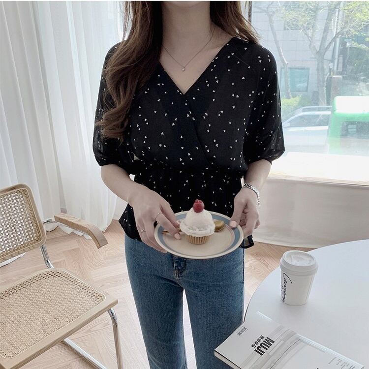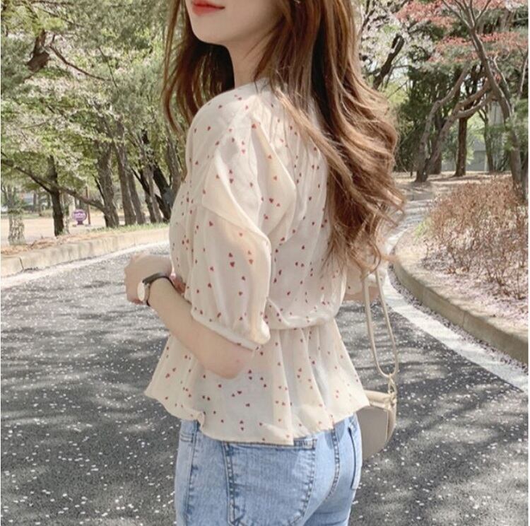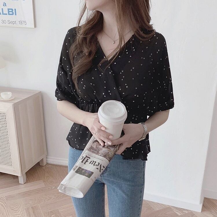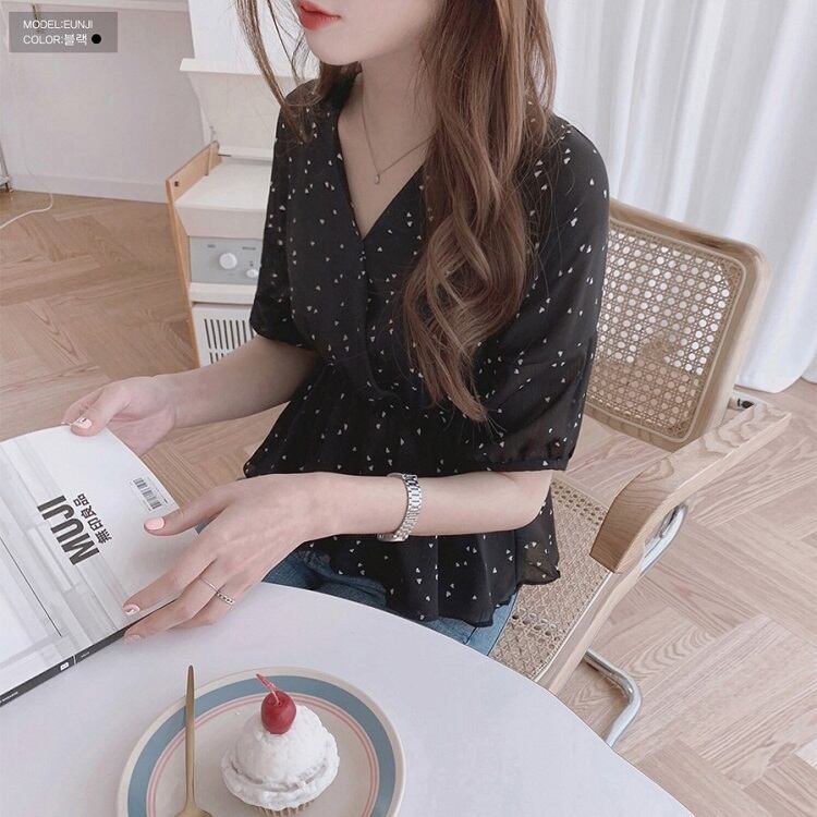【一部即納】全2色 シフォンブラウス オーバーブラウス 半袖 Vネック 花びら柄 ハート柄 フリル ハイウエスト ゆったり きれいめ レトロ カジュアル お出かけ アプリコット ブラック