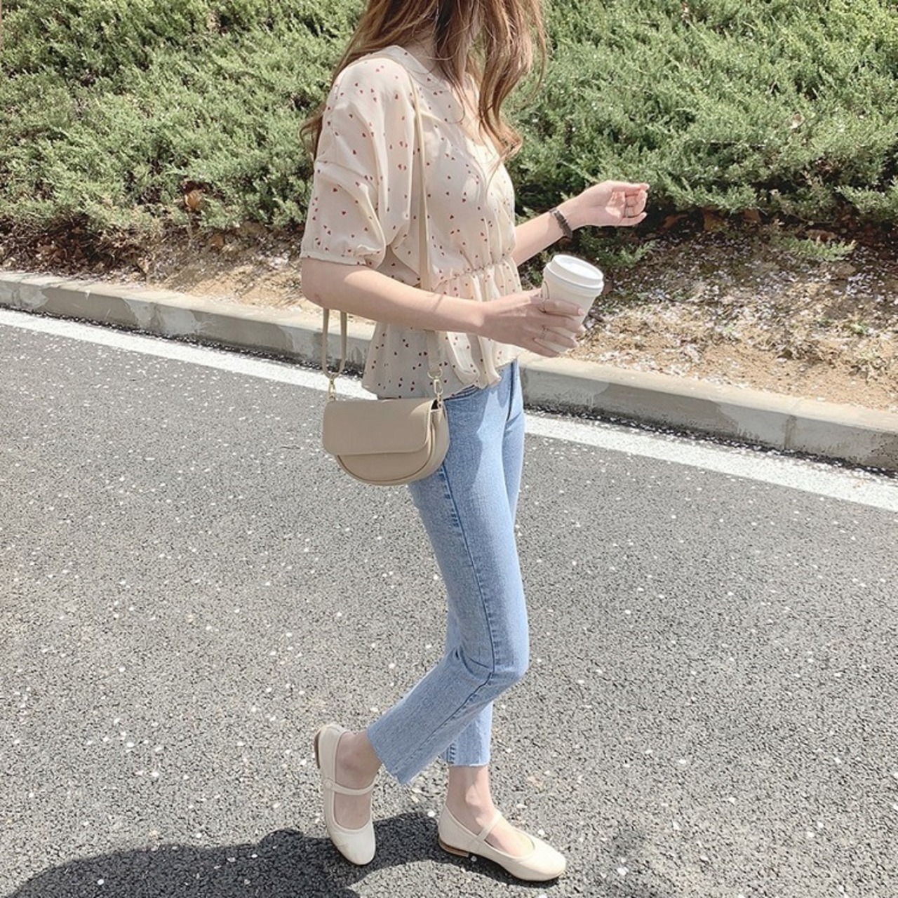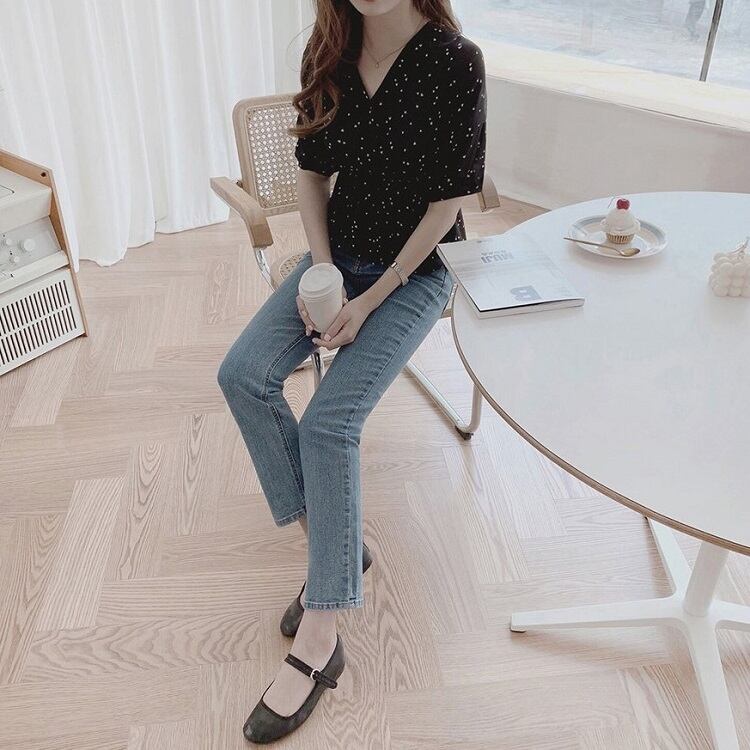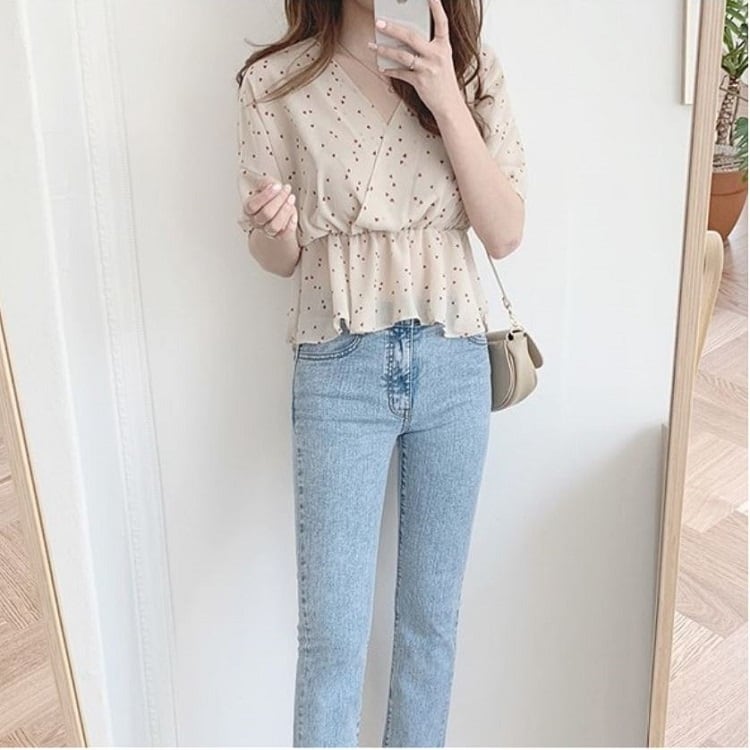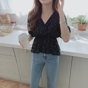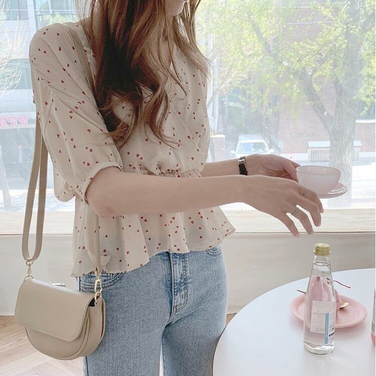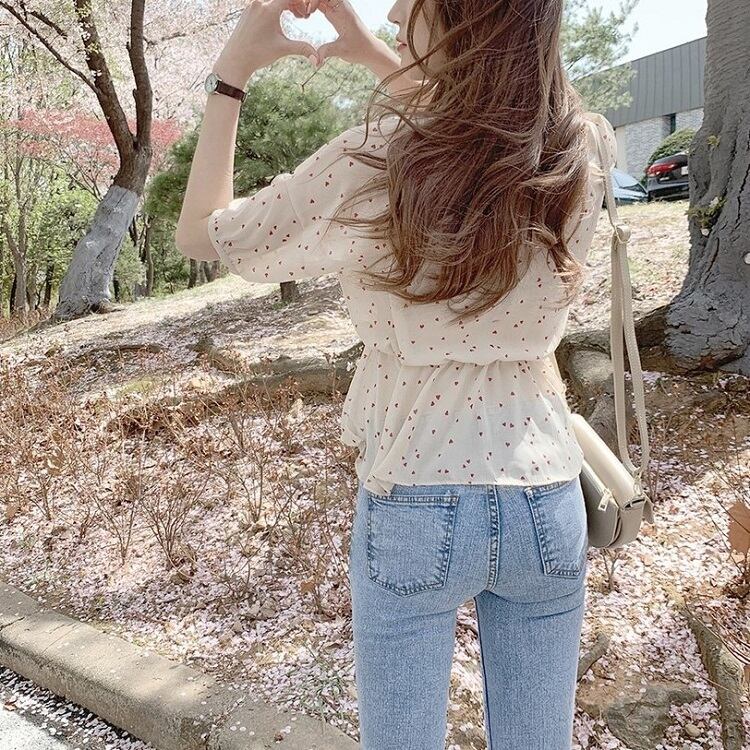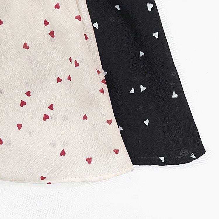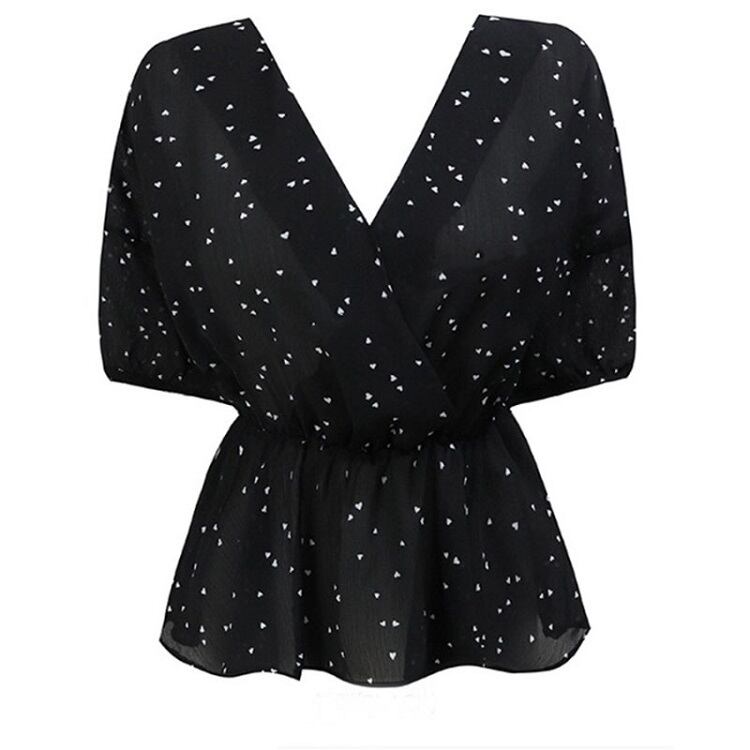 【一部即納】全2色 シフォンブラウス オーバーブラウス 半袖 Vネック 花びら柄 ハート柄 フリル ハイウエスト ゆったり きれいめ レトロ カジュアル お出かけ アプリコット ブラック
