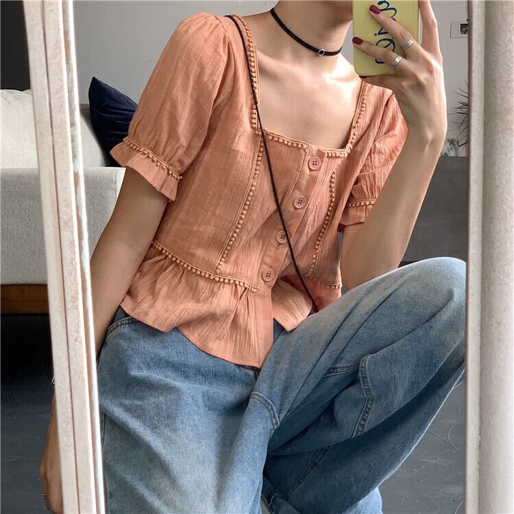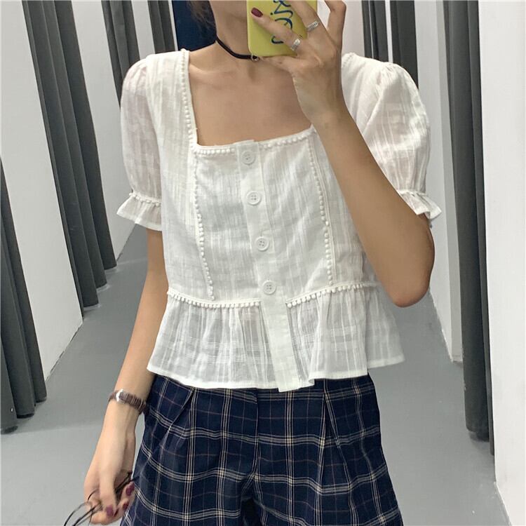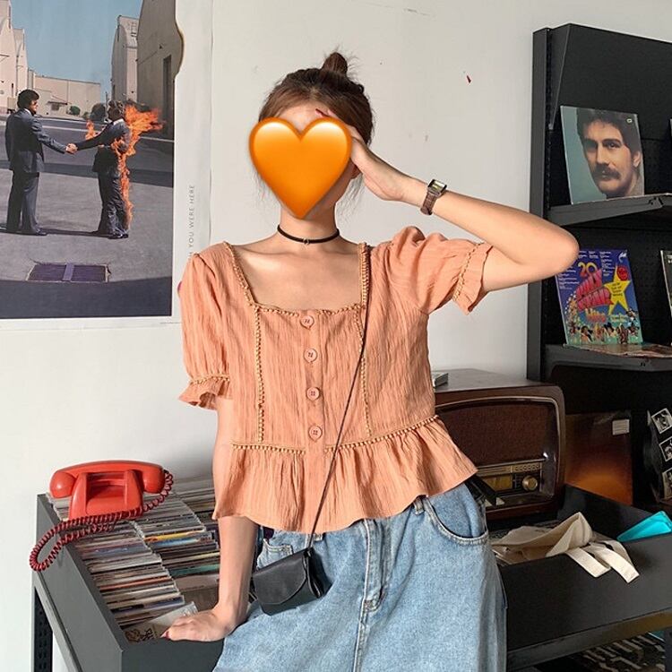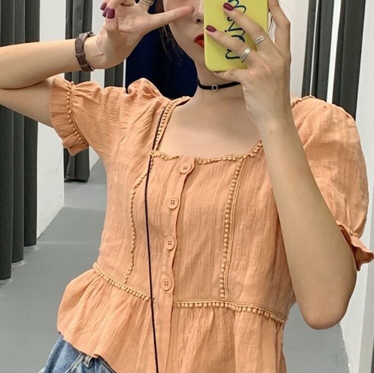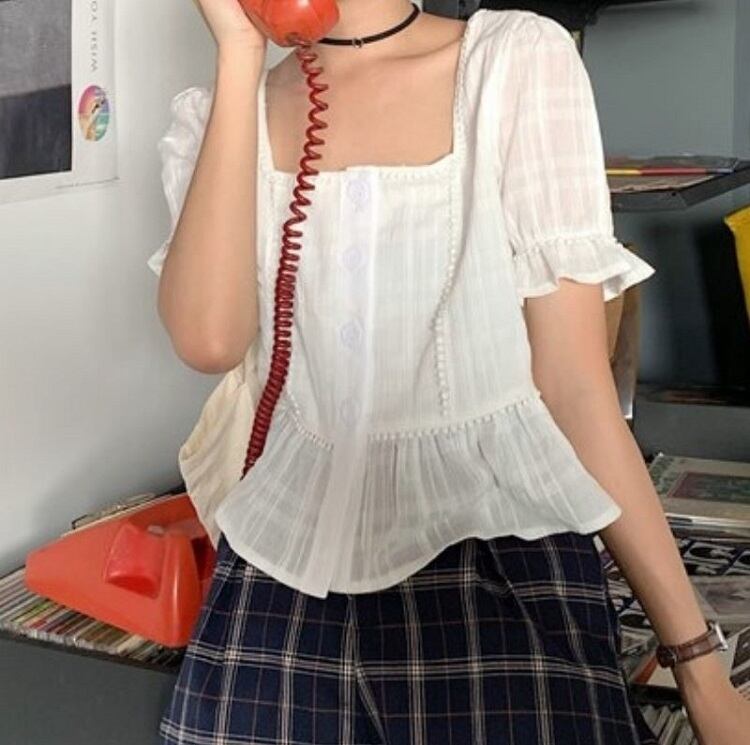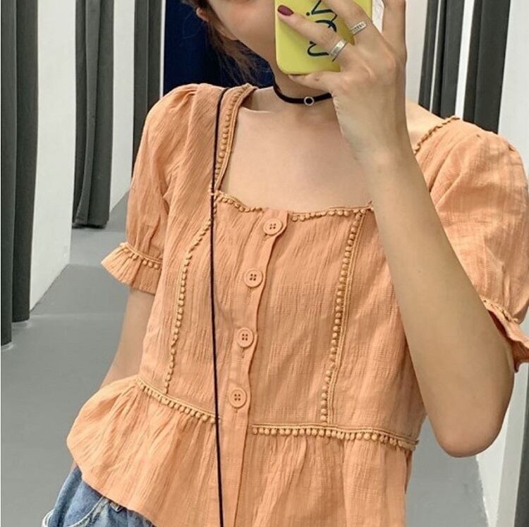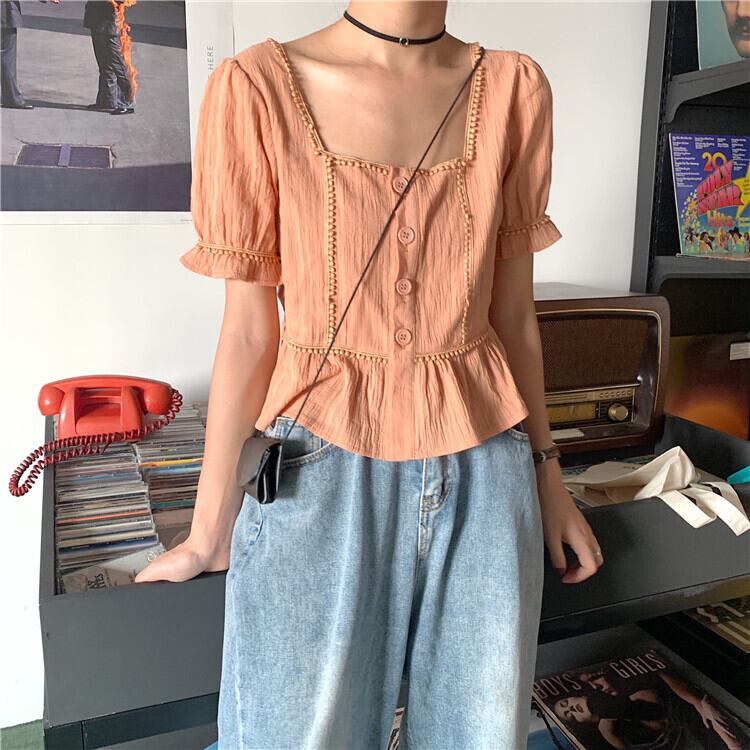 全2色 オーバーブラウス 半袖 スクエアネック 無地 フリル ハイウエスト ゆったり きれいめ レトロ カジュアル お出かけ ホワイト オレンジ
