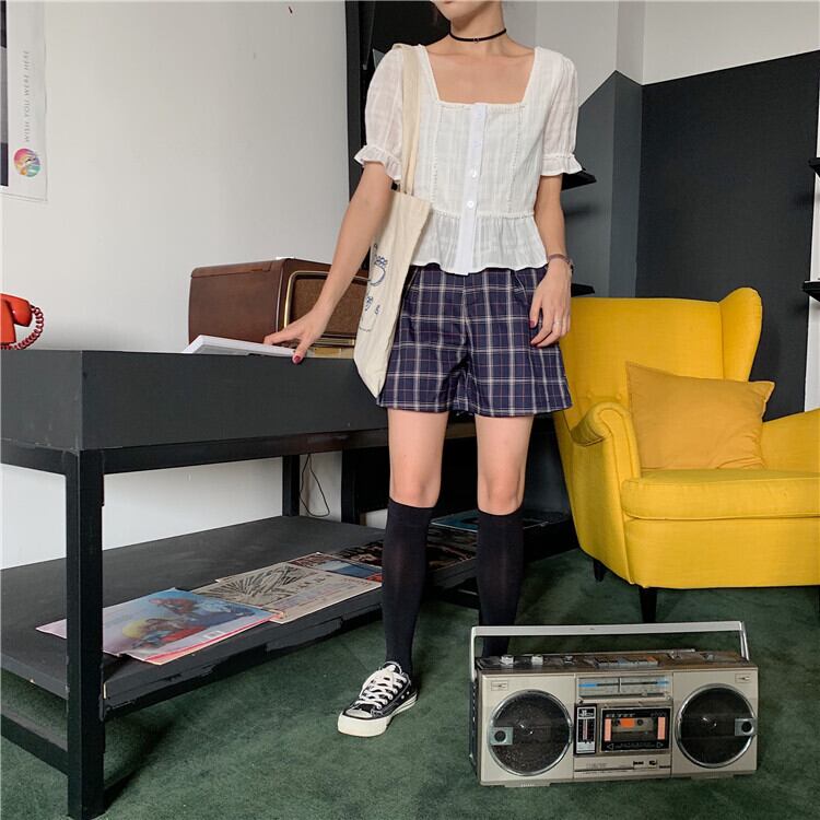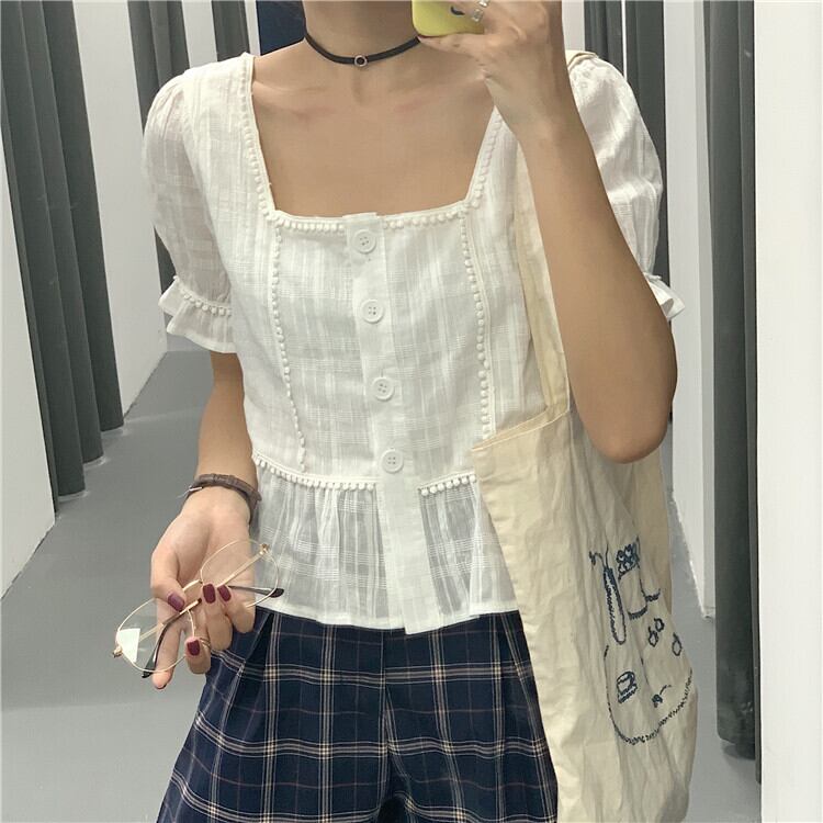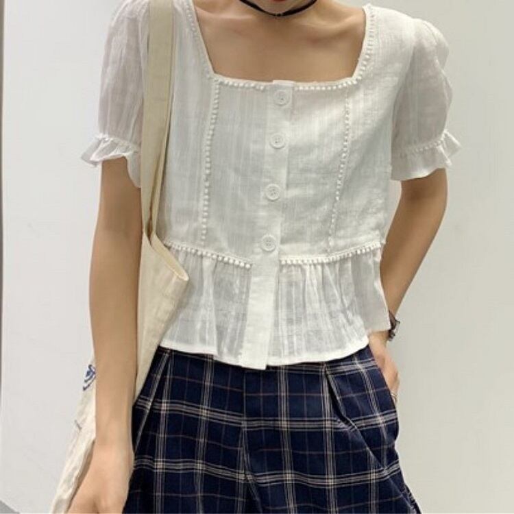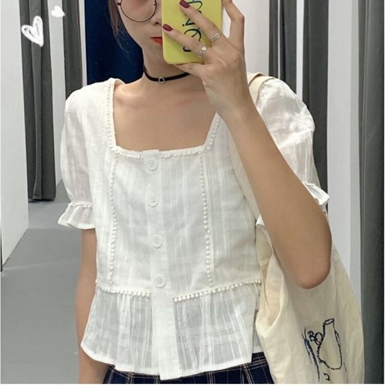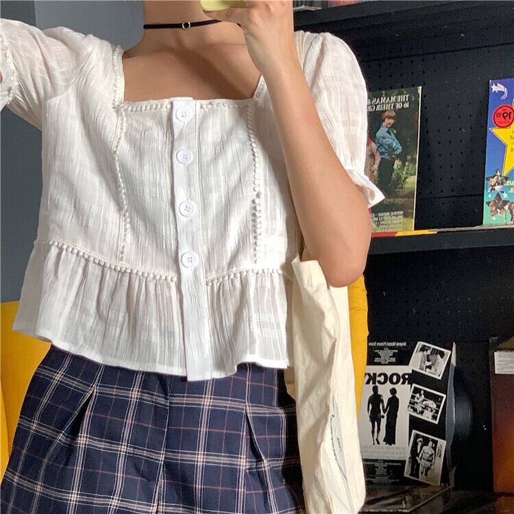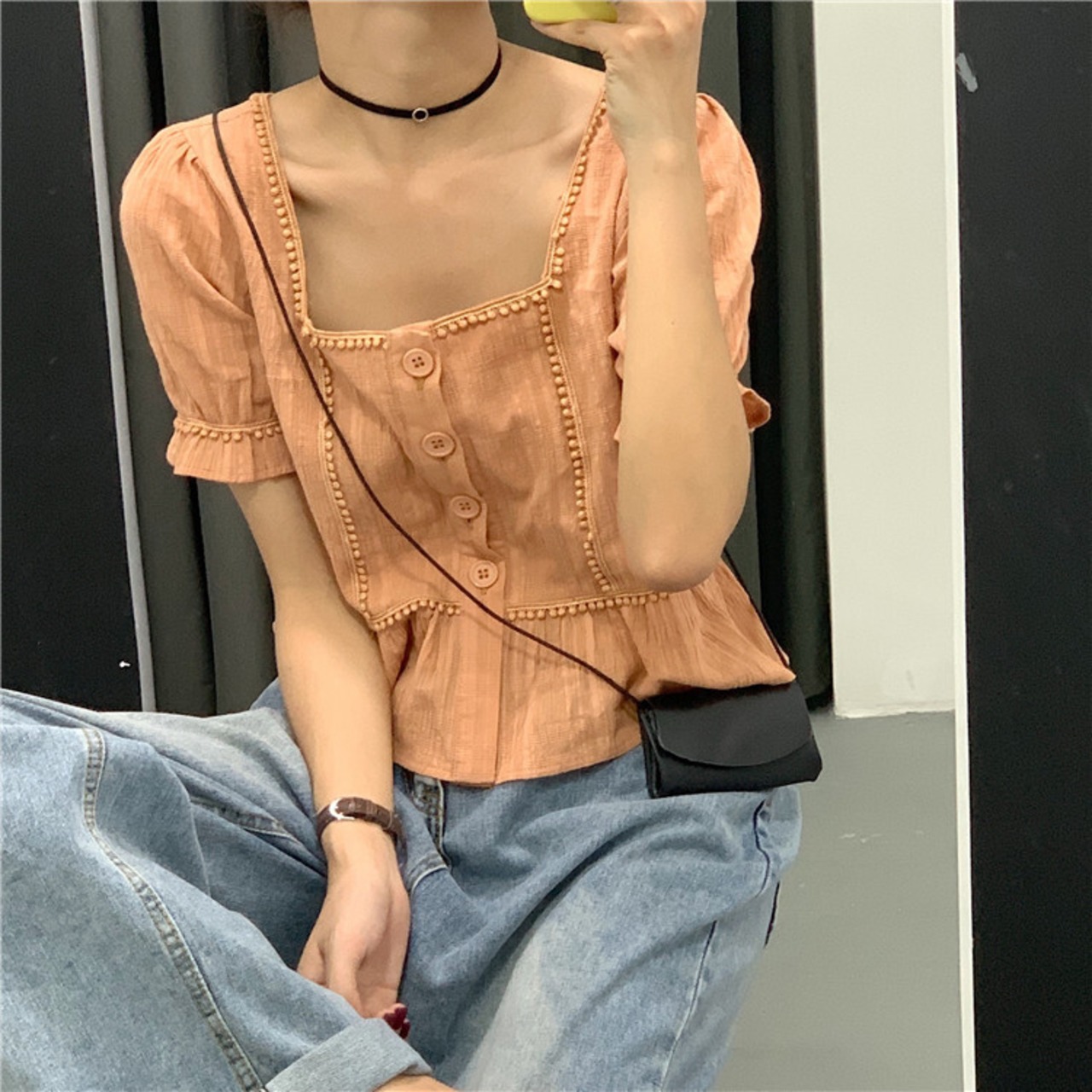 全2色 オーバーブラウス 半袖 スクエアネック 無地 フリル ハイウエスト ゆったり きれいめ レトロ カジュアル お出かけ ホワイト オレンジ