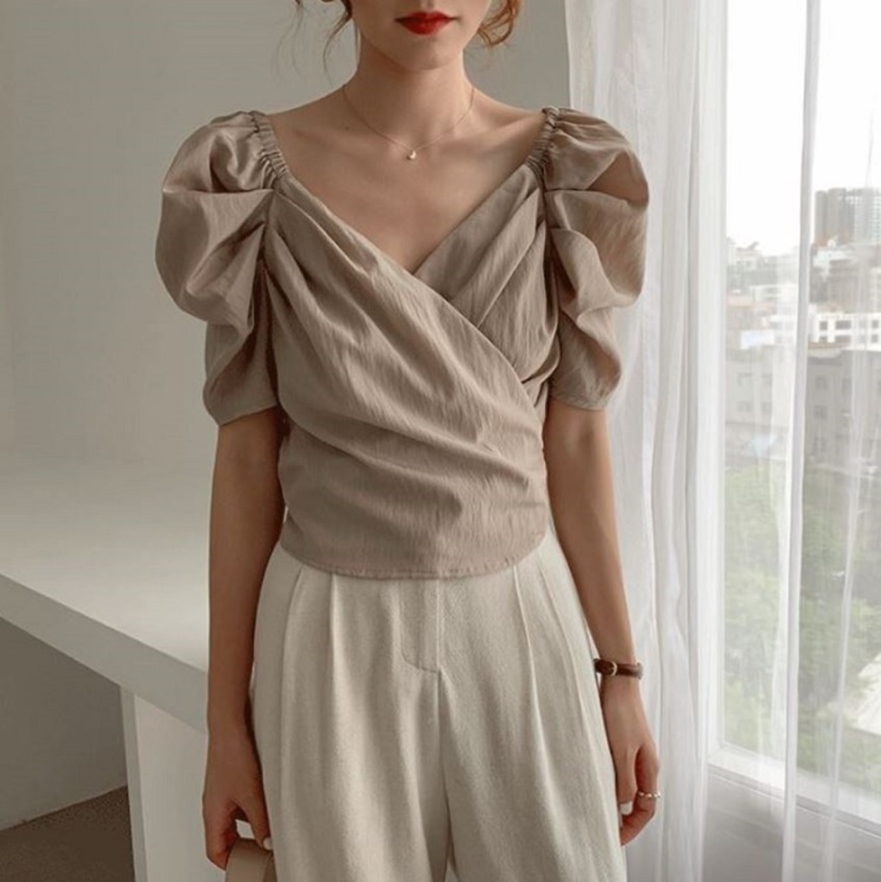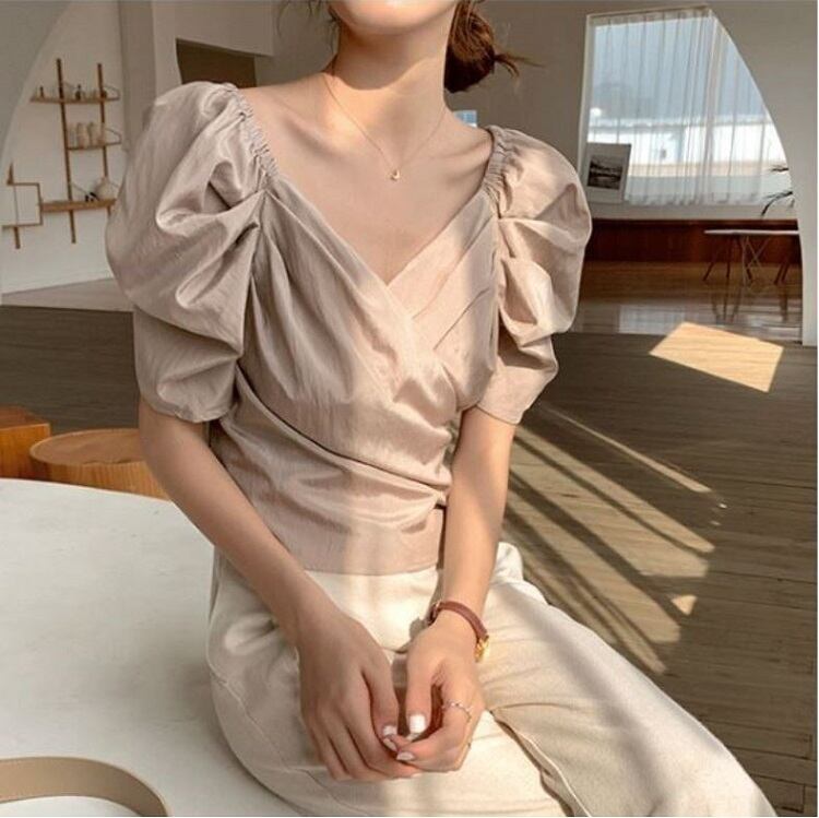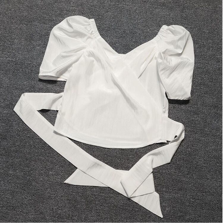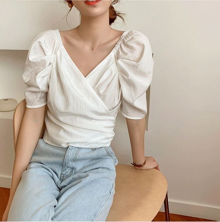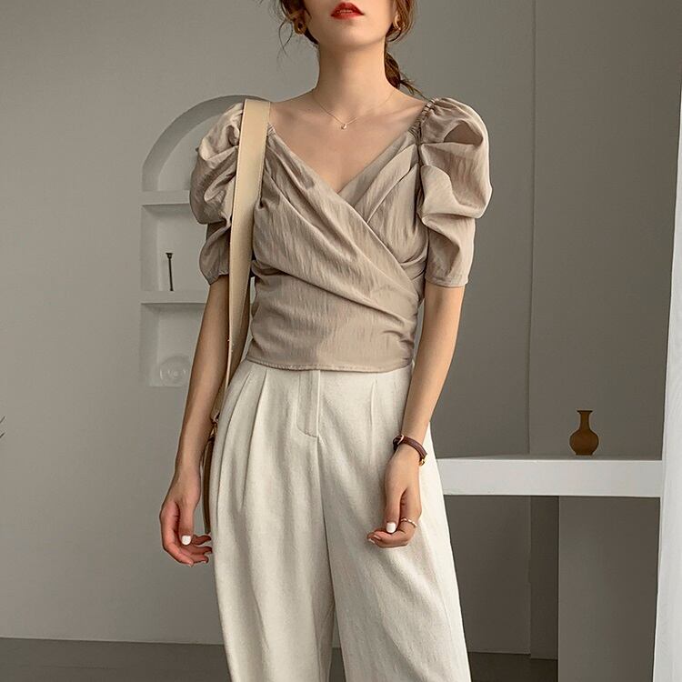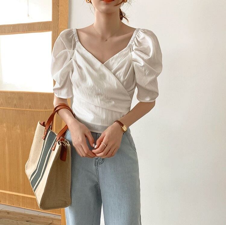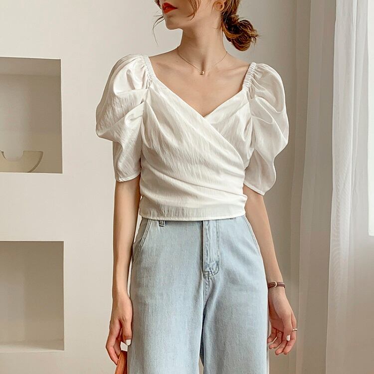 全2色 シフォンブラウス ショート丈 半袖 パフスリーブ Vネック バックリボン 無地 ハイウエスト きれいめ レトロ カジュアル お出かけ デート ホワイト ブラウン