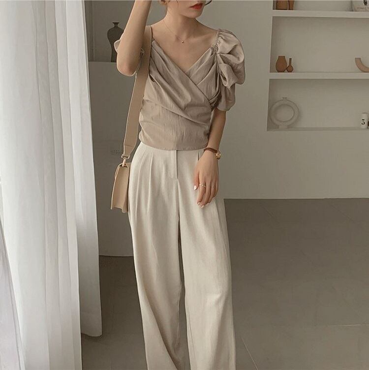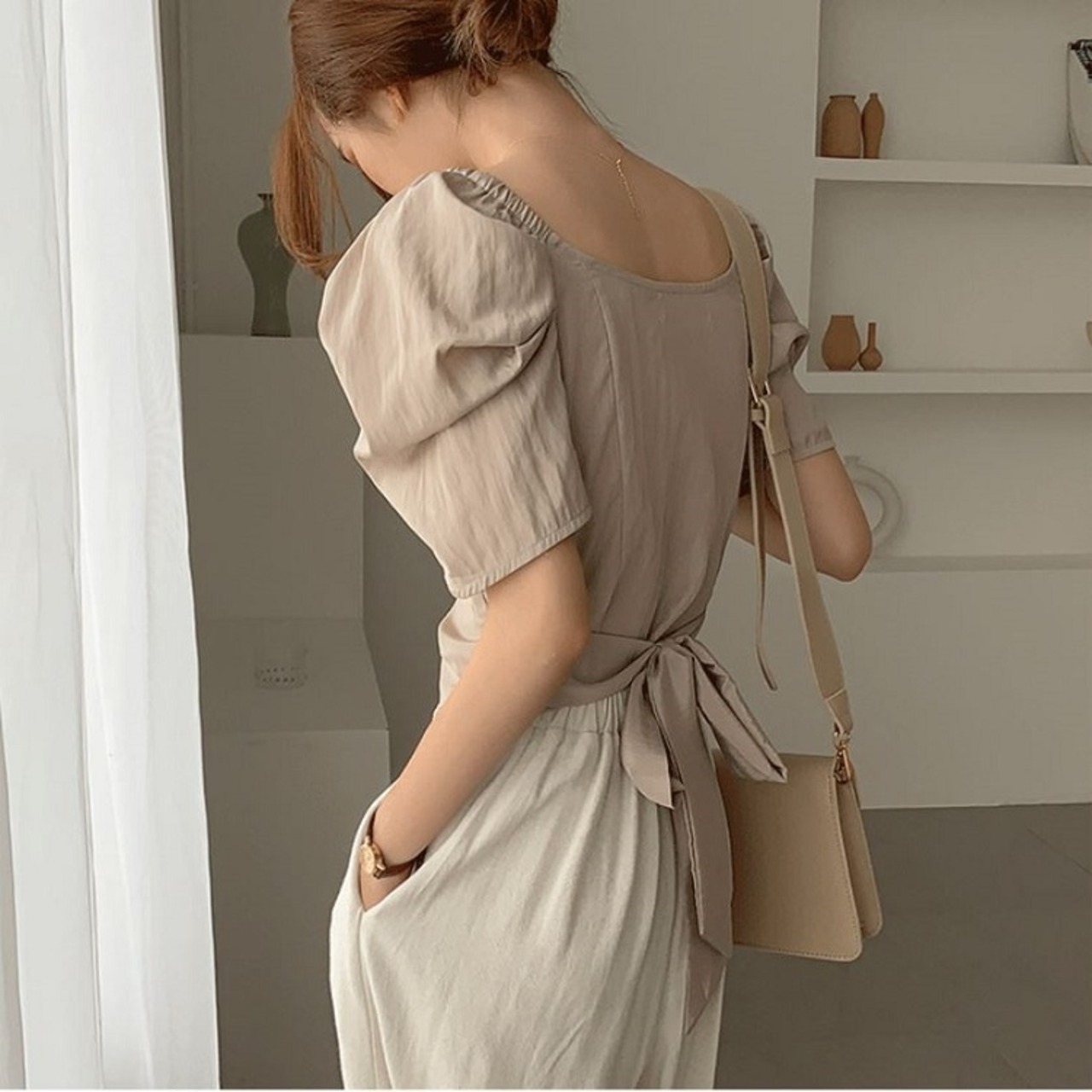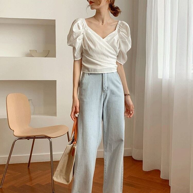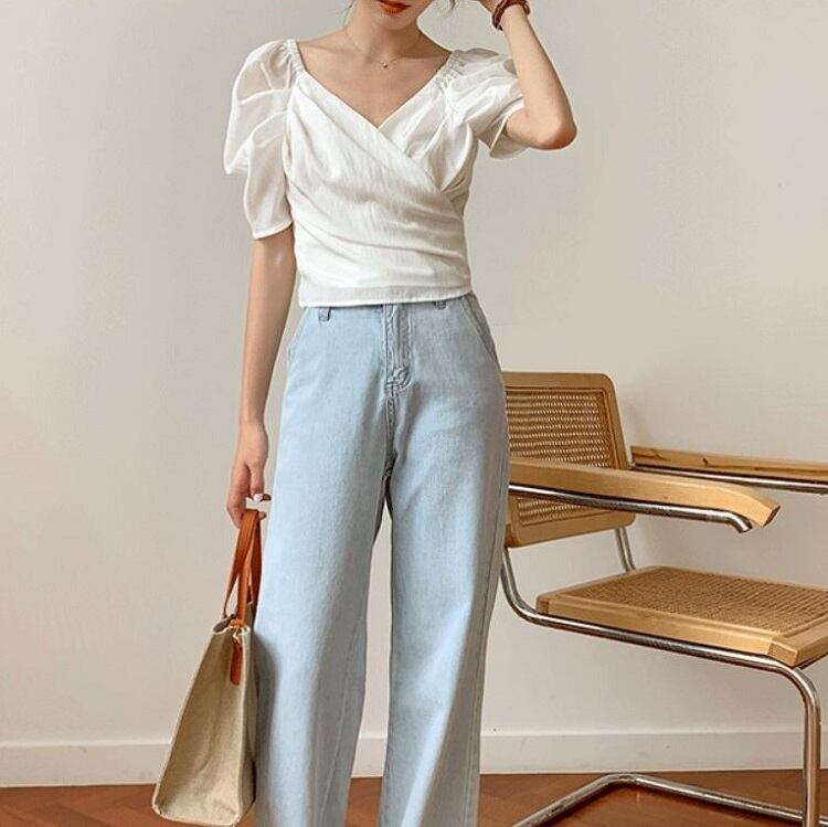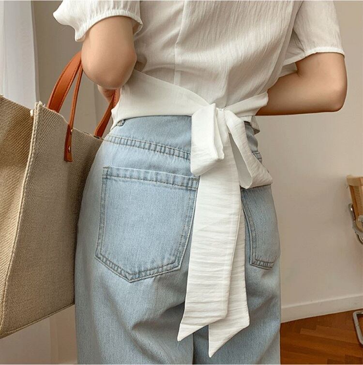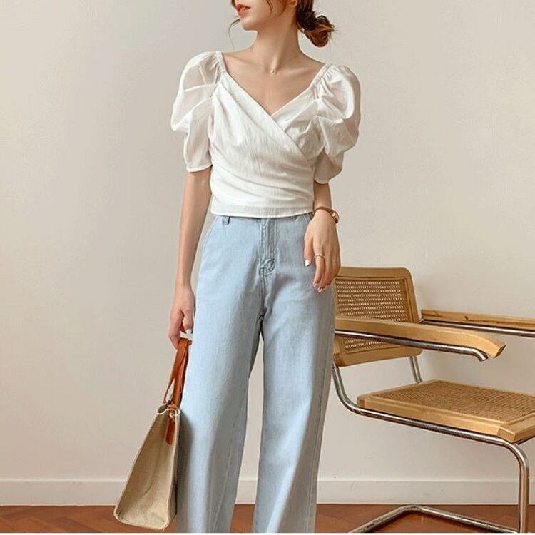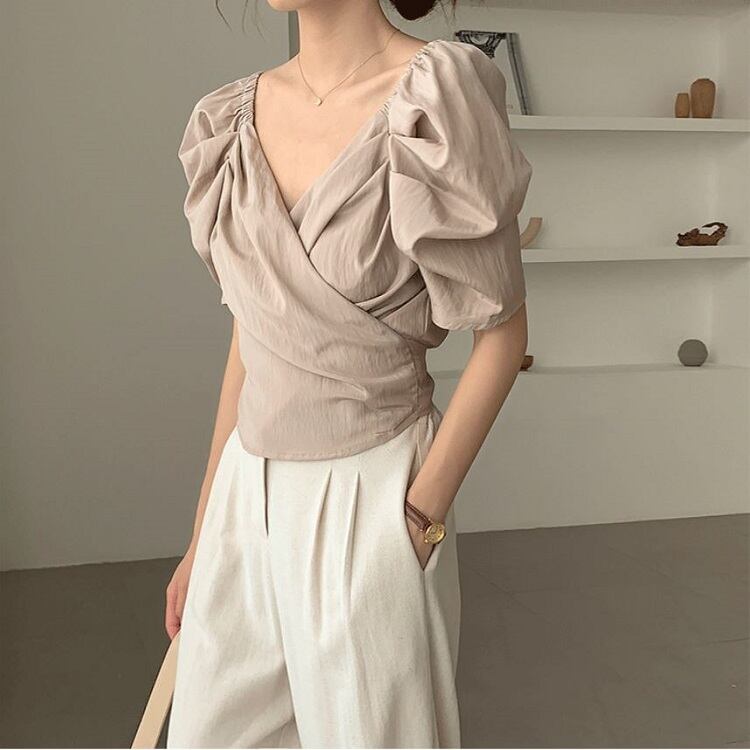 全2色 シフォンブラウス ショート丈 半袖 パフスリーブ Vネック バックリボン 無地 ハイウエスト きれいめ レトロ カジュアル お出かけ デート ホワイト ブラウン