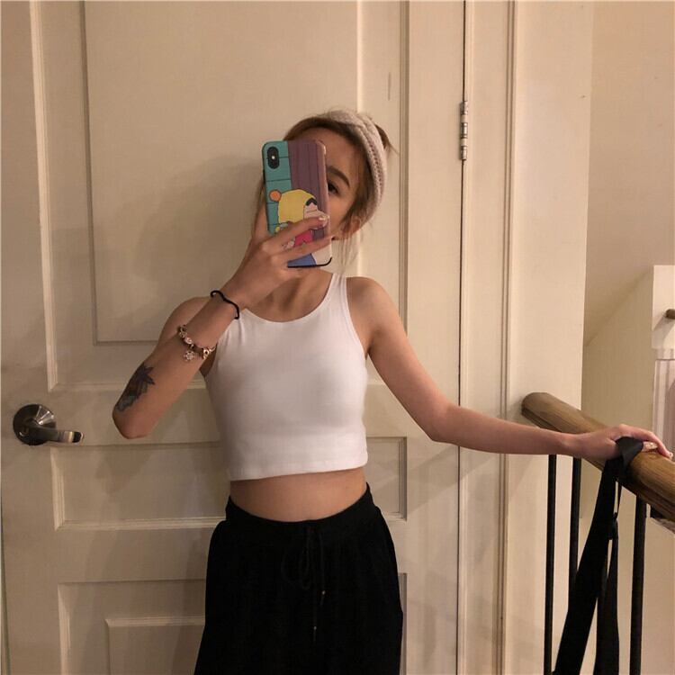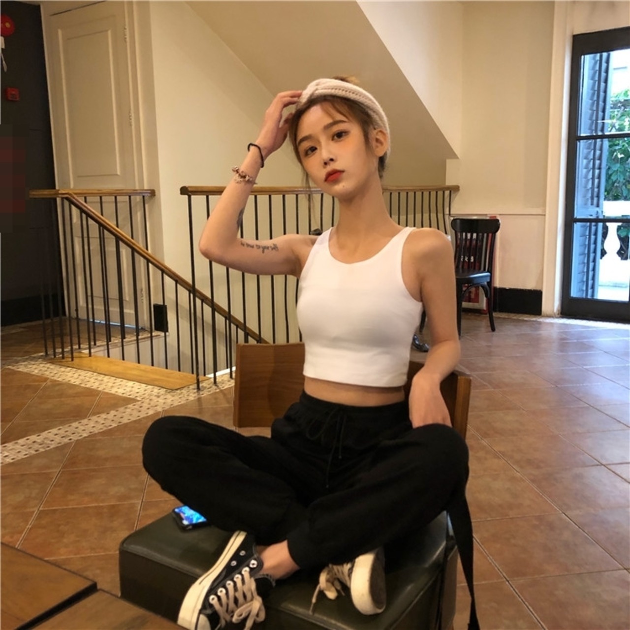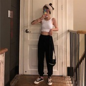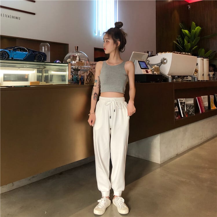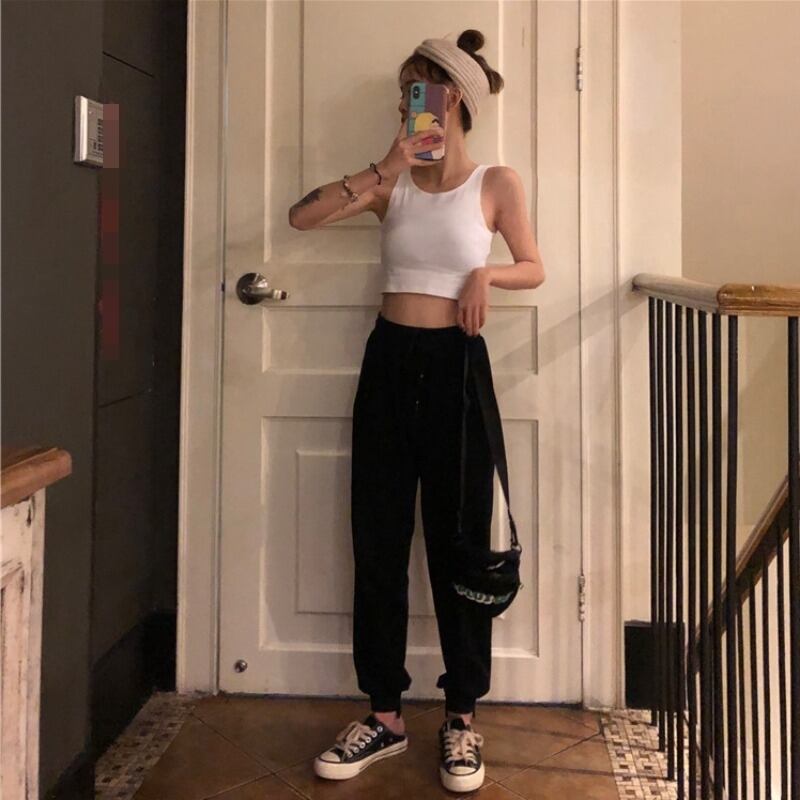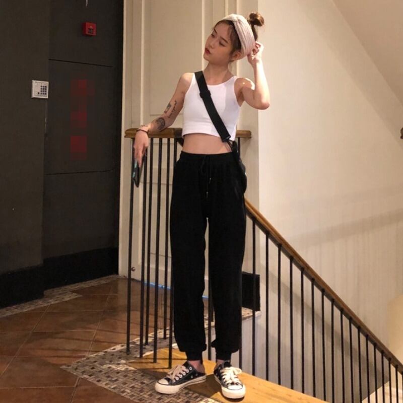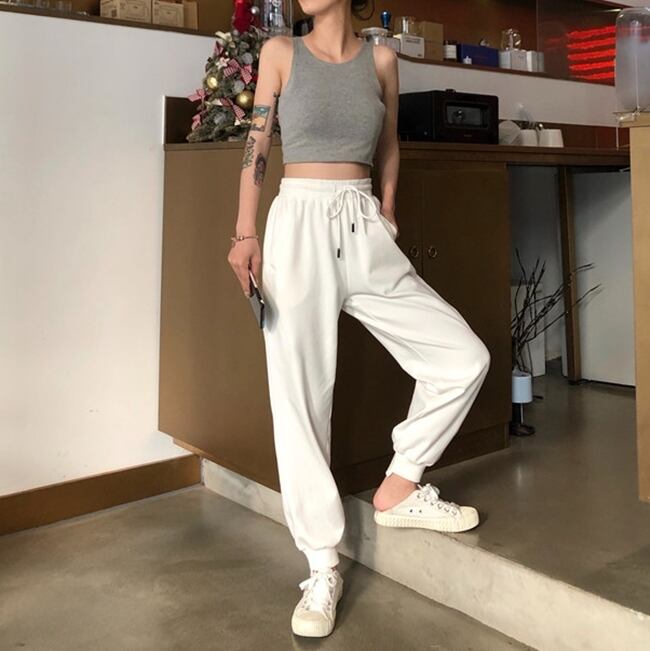 ショートな着丈タンクトップと相性抜群のハイウエストジョガーパンツ。