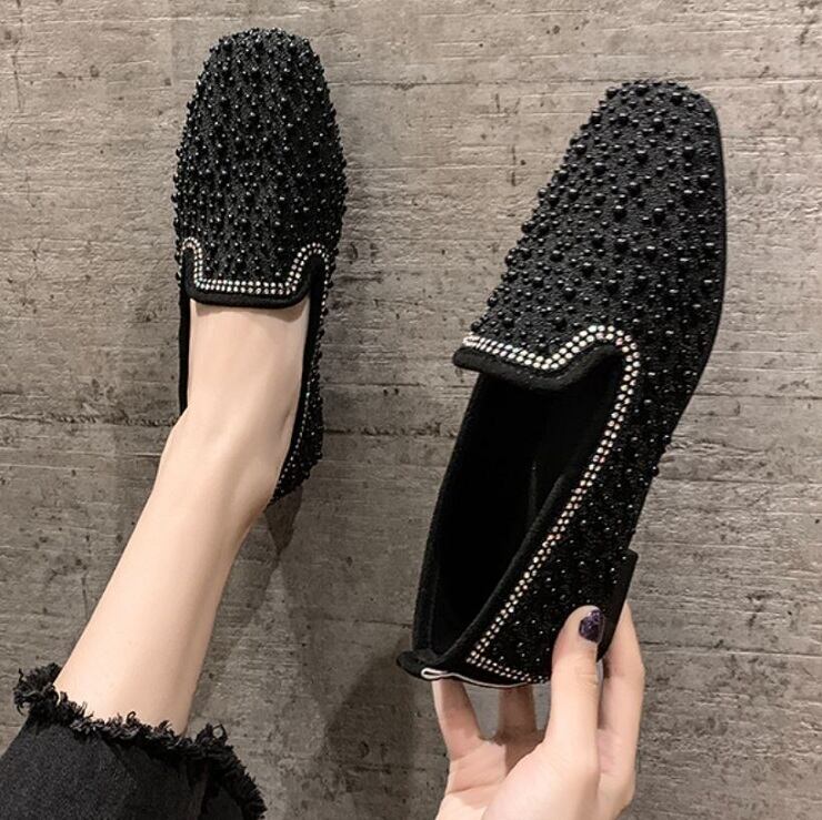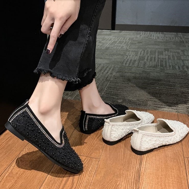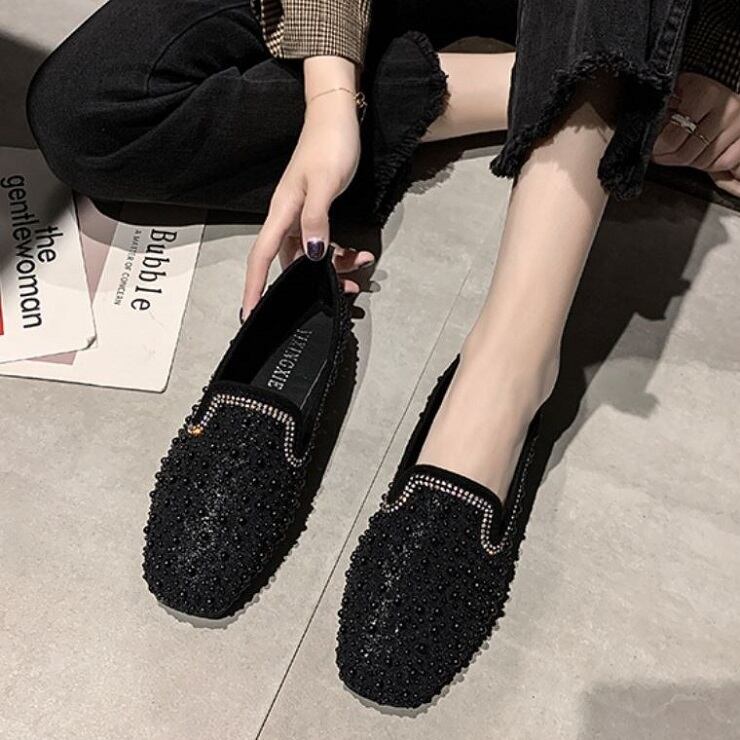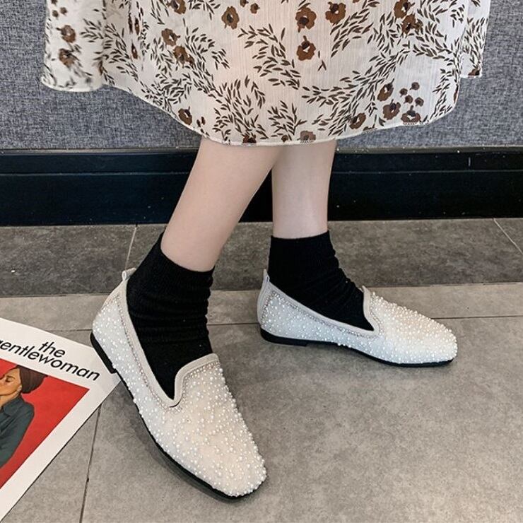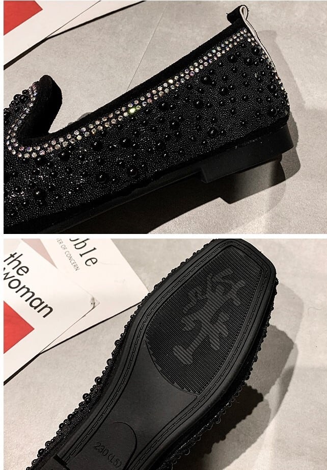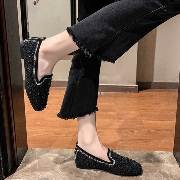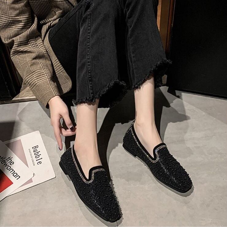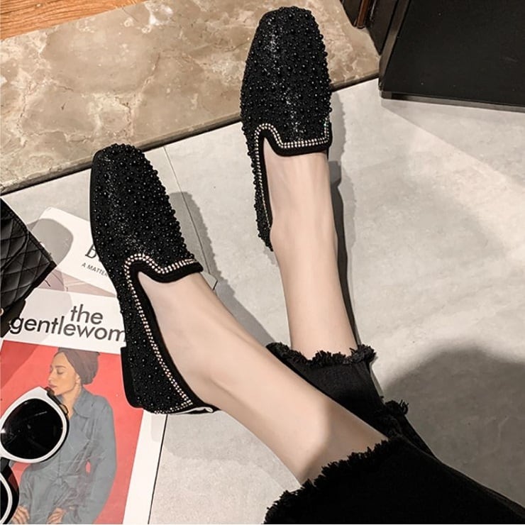全2色 フラットシューズ ローファー ラインストーン スクエアヘッド スリッポン キラキラ きれいめ カジュアル お出かけ ブラック ベージュ