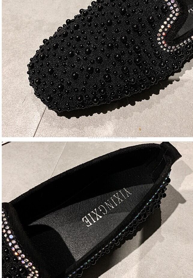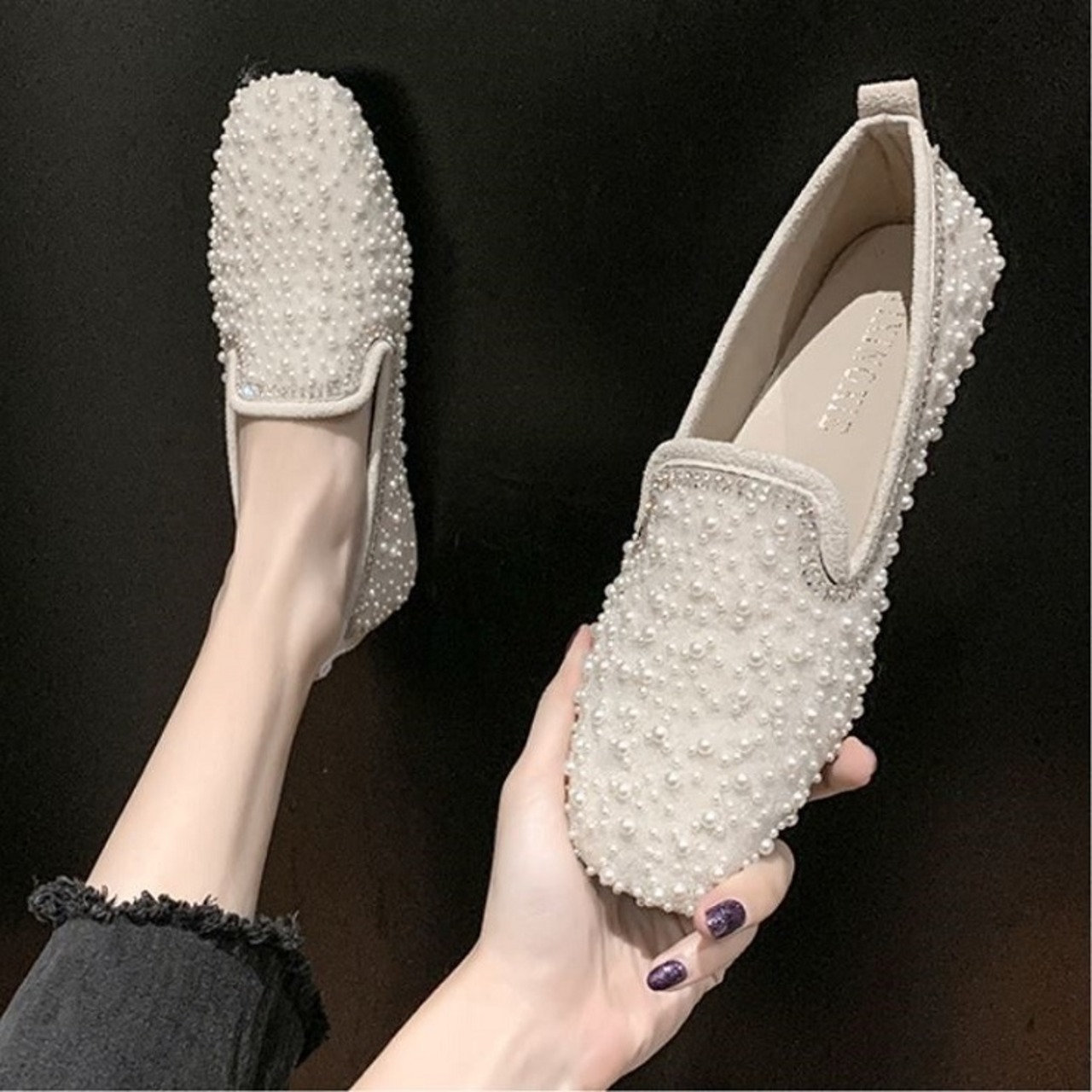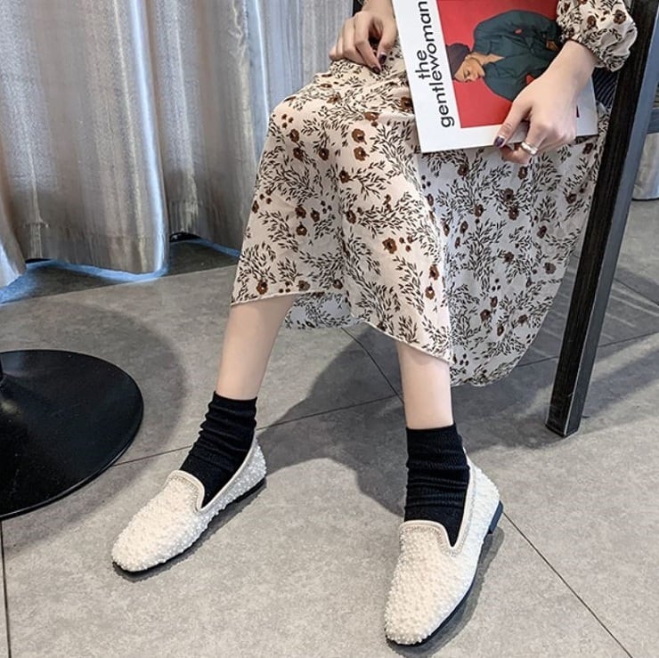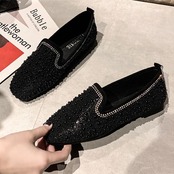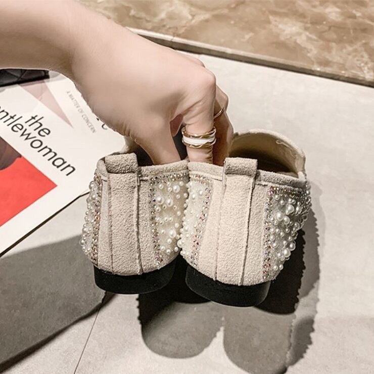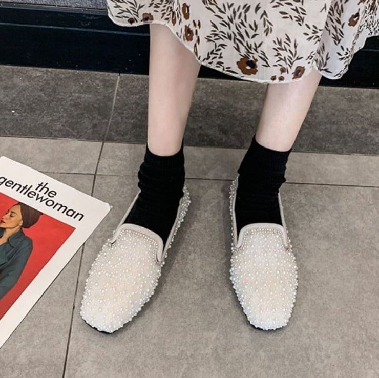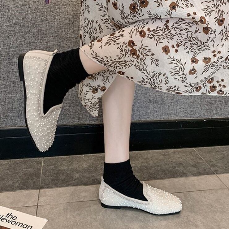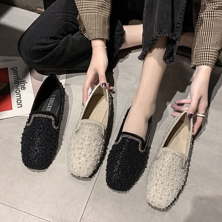 全2色 フラットシューズ ローファー ラインストーン スクエアヘッド スリッポン キラキラ きれいめ カジュアル お出かけ ブラック ベージュ