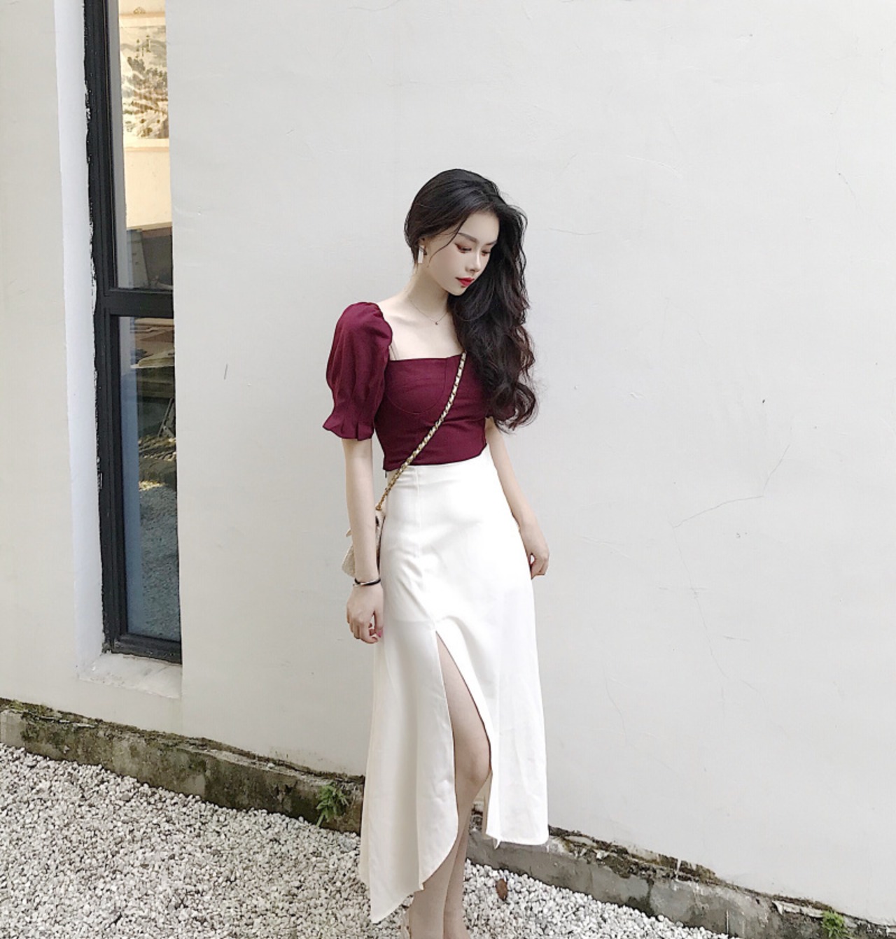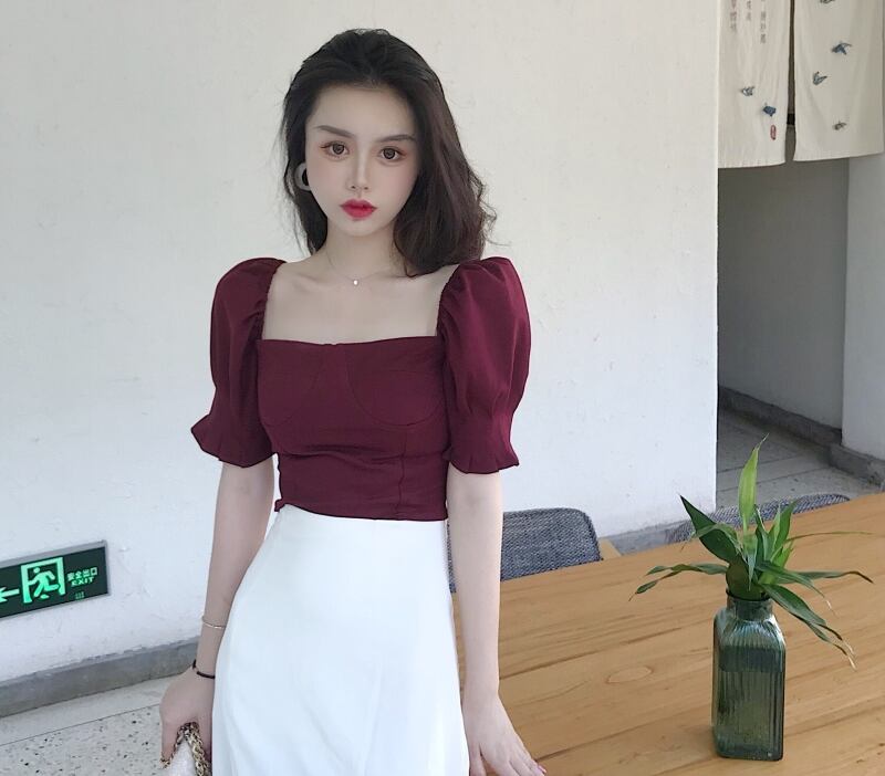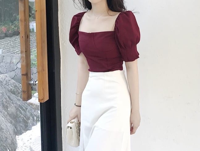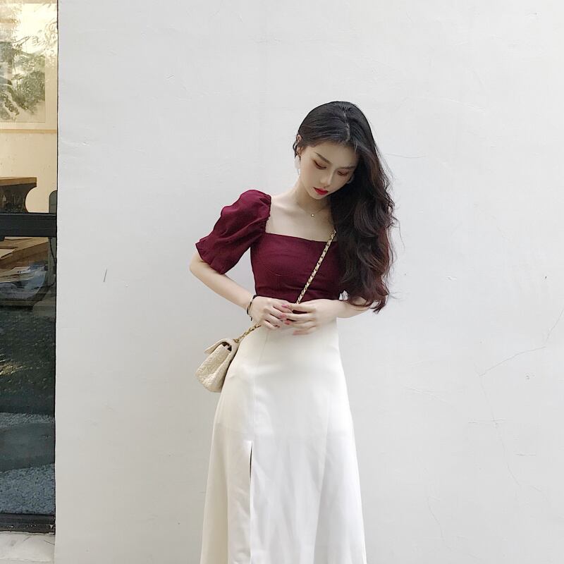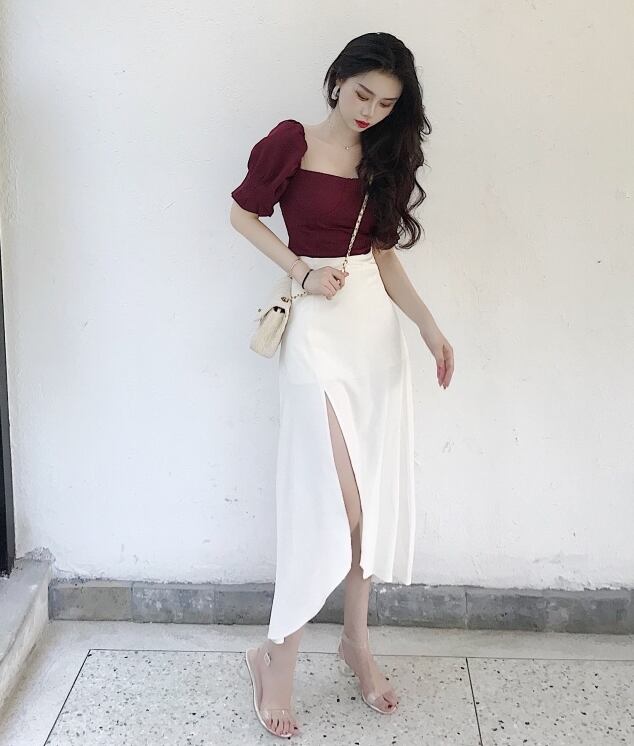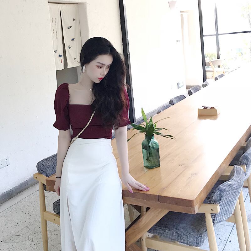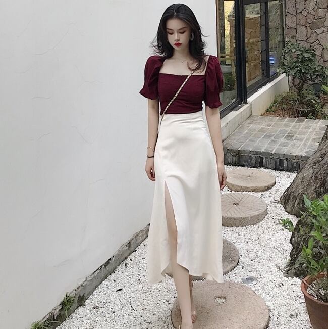 セットアップ ツーピース トップス ブラウス スカート ミモレ丈 アシンメトリー 半袖 袖コンシャス スリム ハイウエスト ラップスカート スリット スクエアネック カジュアル きれいめ 女子会 上品 夏