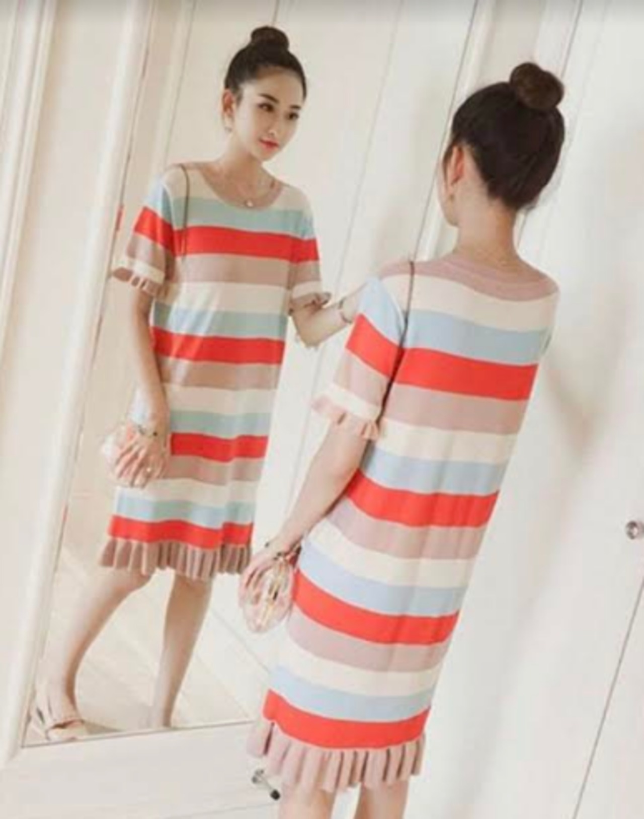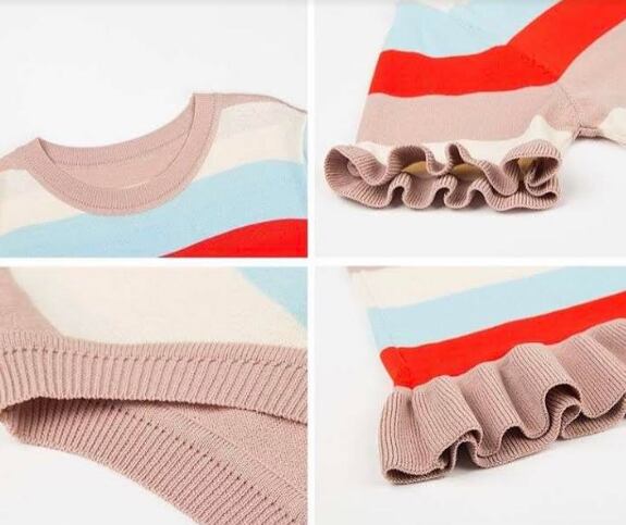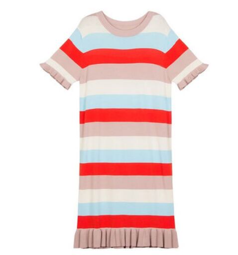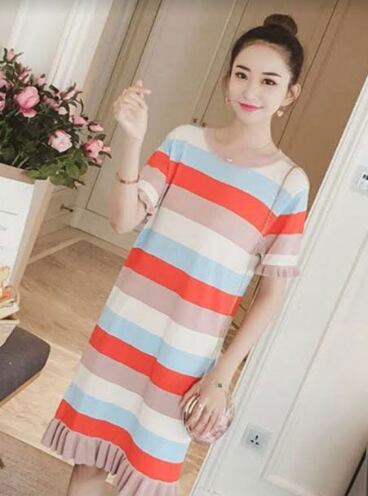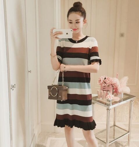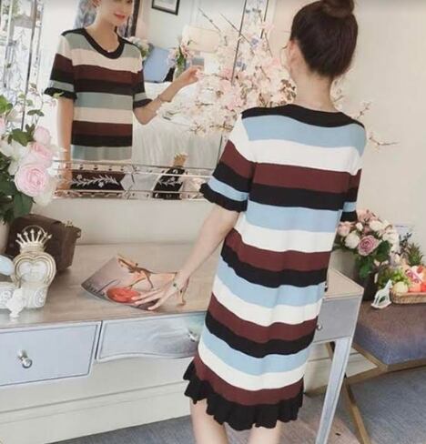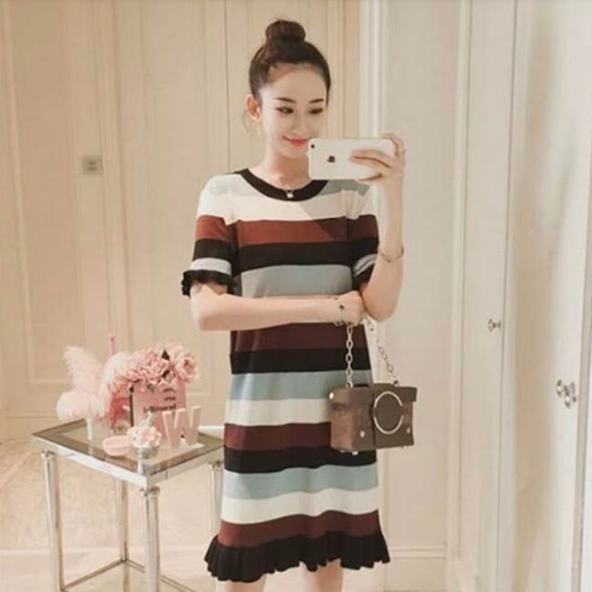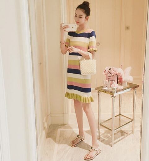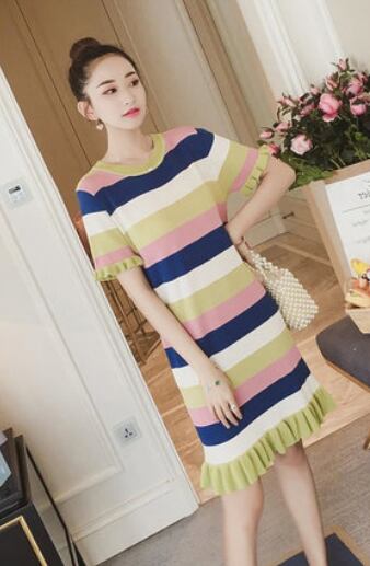 全3色 ワンピース ボーダー フリル サマーニット 半袖 ひざ丈 ショート丈 ラウンドネック スリム 韓国ファッション カジュアル デイリー お出かけ 大人可愛い 上品 春 夏