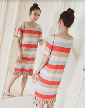 トレンドのボーダー柄がおしゃれで涼しげな印象が暖かい季節にピッタリのひざ丈ワンピースです。