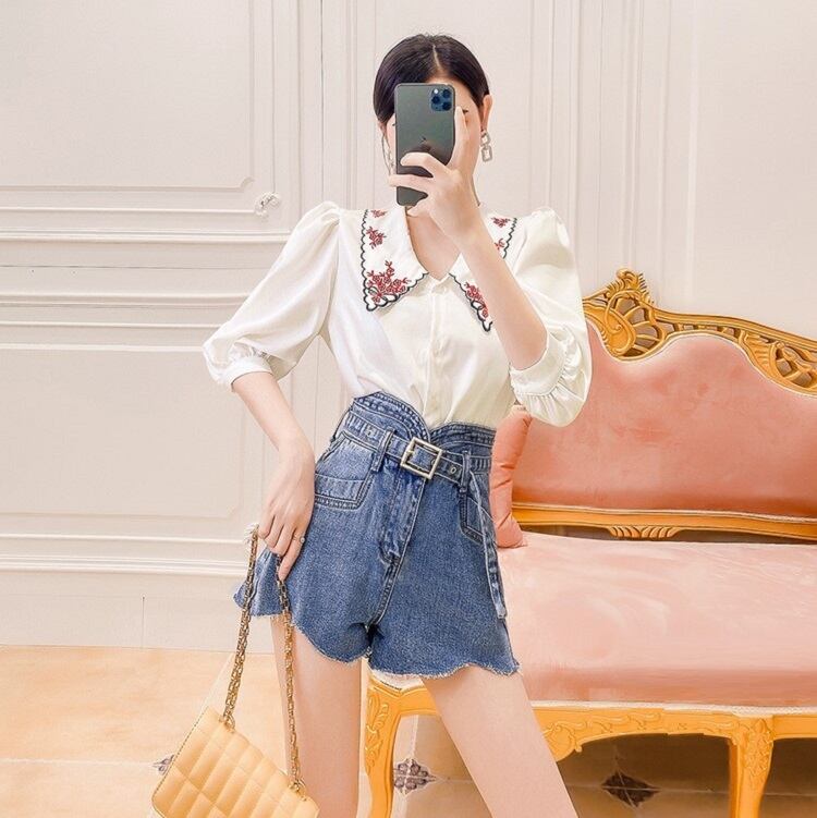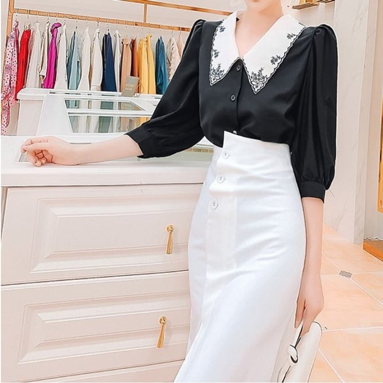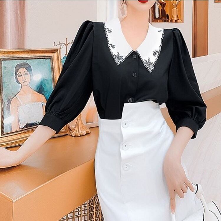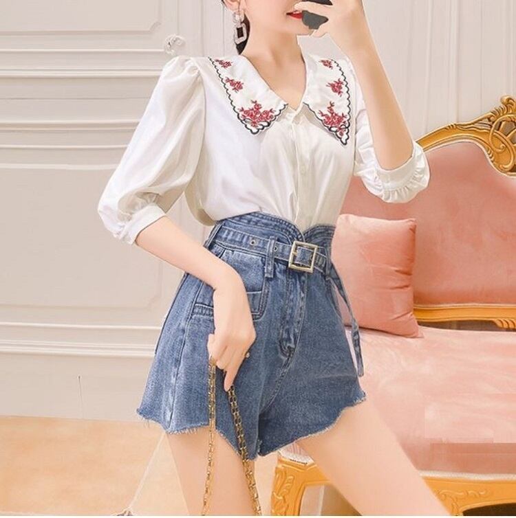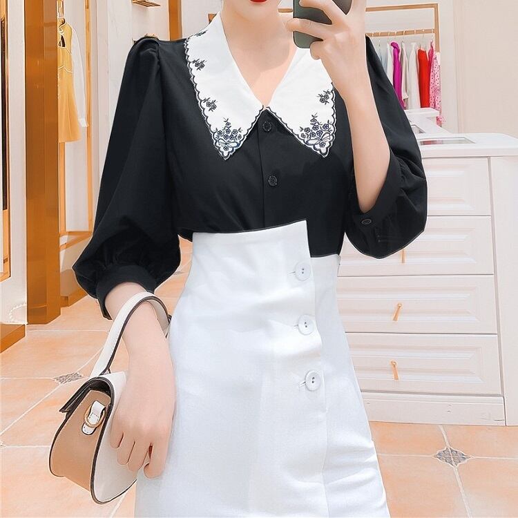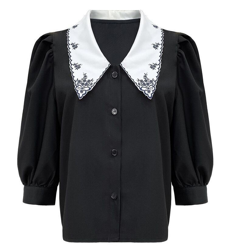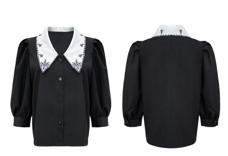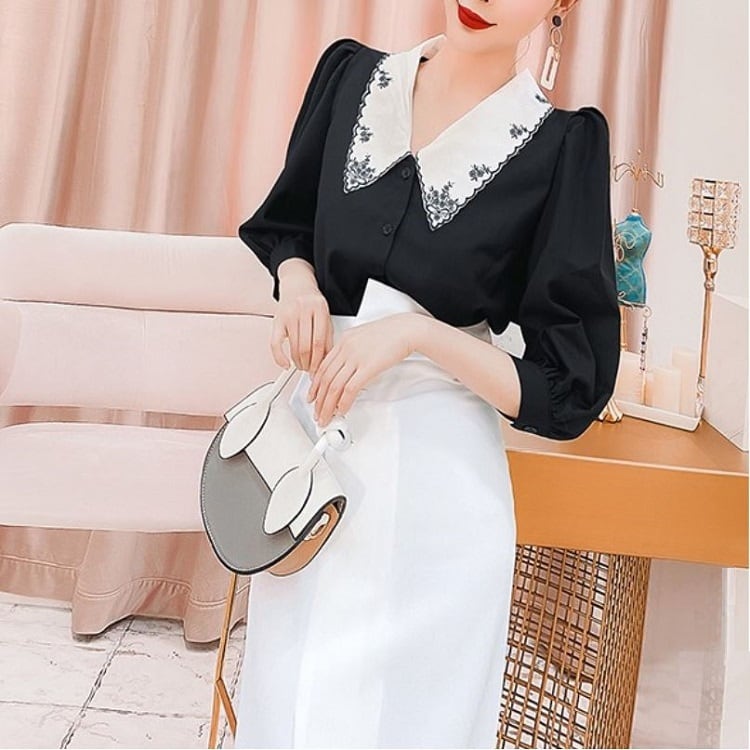 大きなエリと繊細な刺繍が印象的なブラウス。