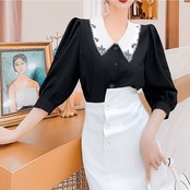 全2色 ブラウス Vネック バルーンスリーブ 七分袖 大きい襟 レトロ きれいめ カジュアル お出かけ お呼ばれ オフィス ホワイト ブラック