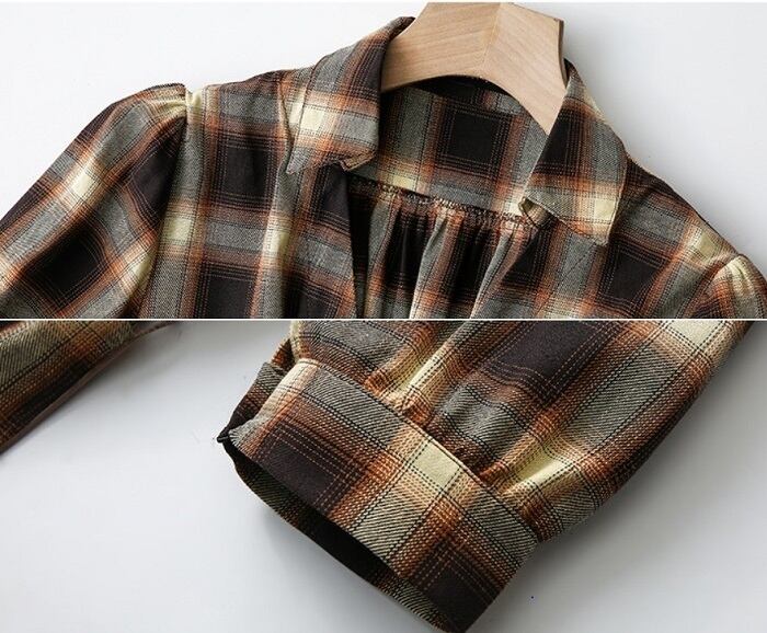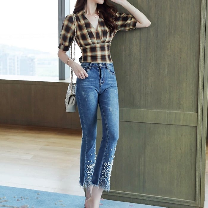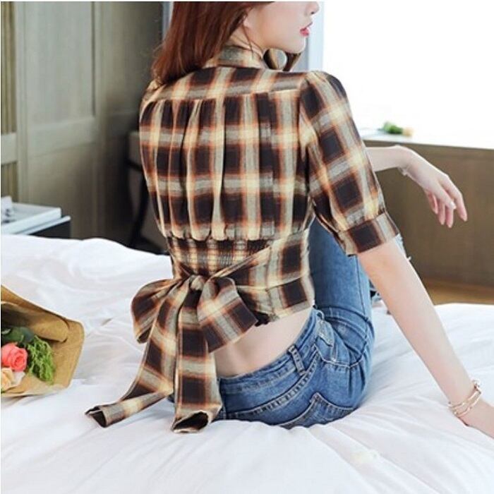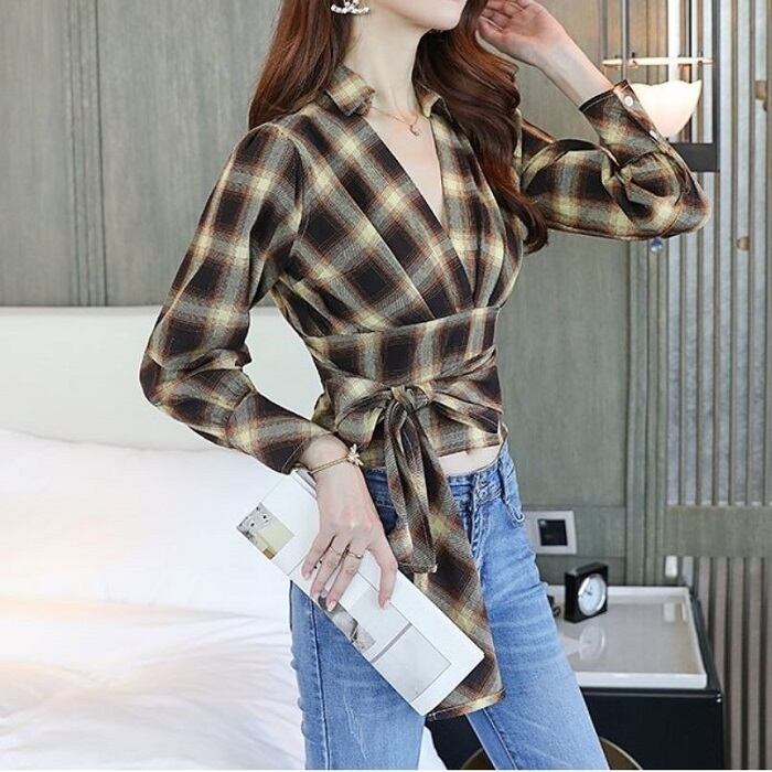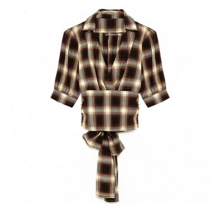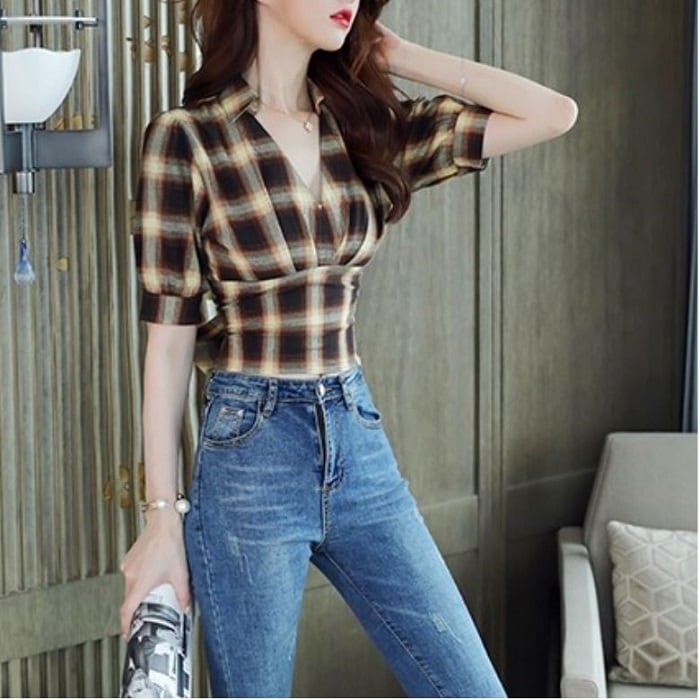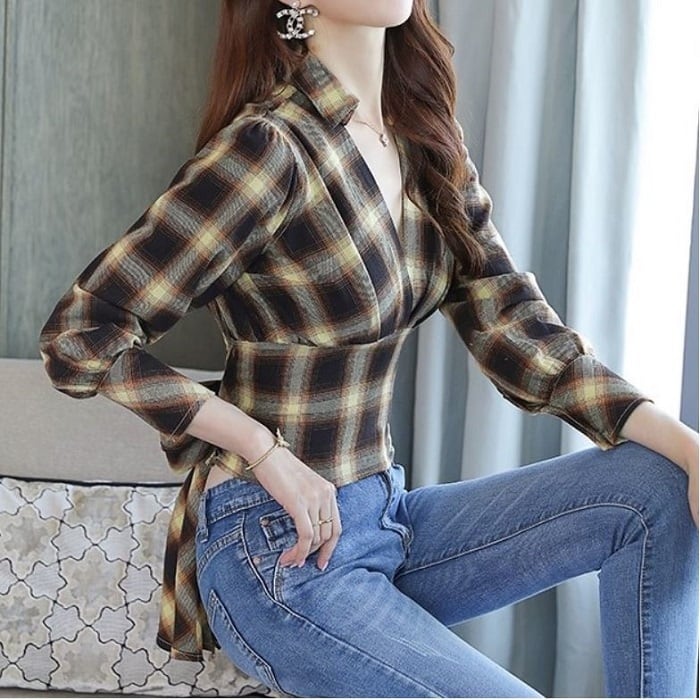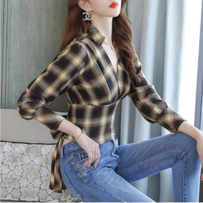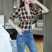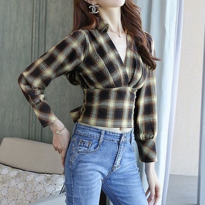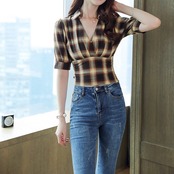 深めのVネックとショート丈がセクシーなチェックブラウス。