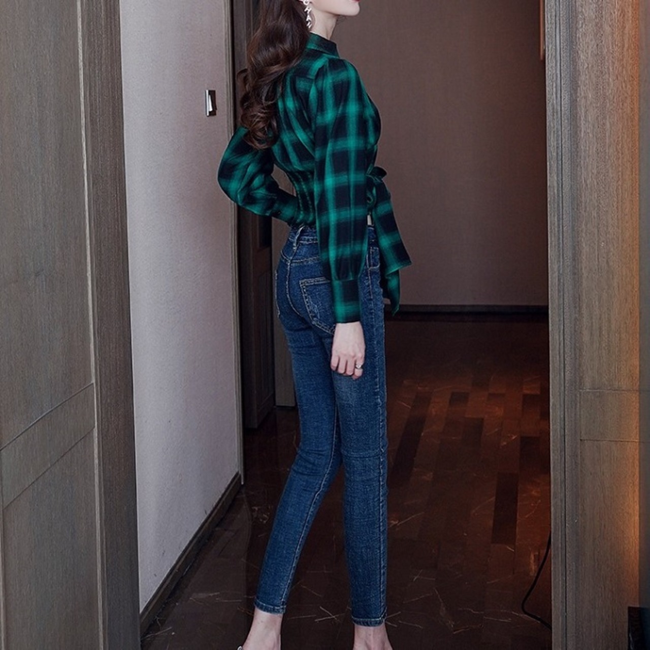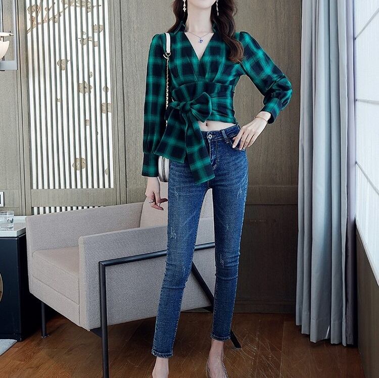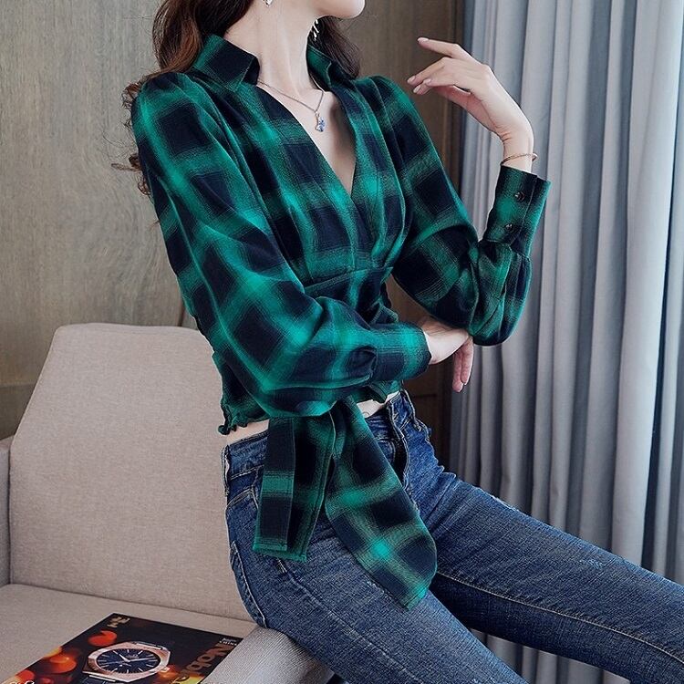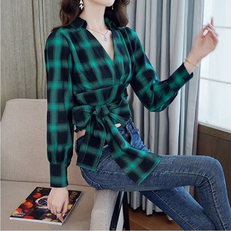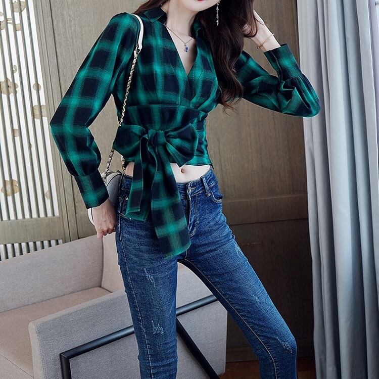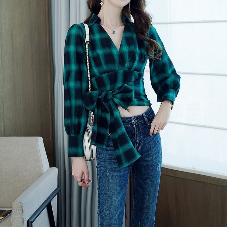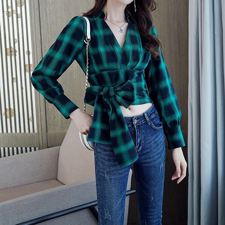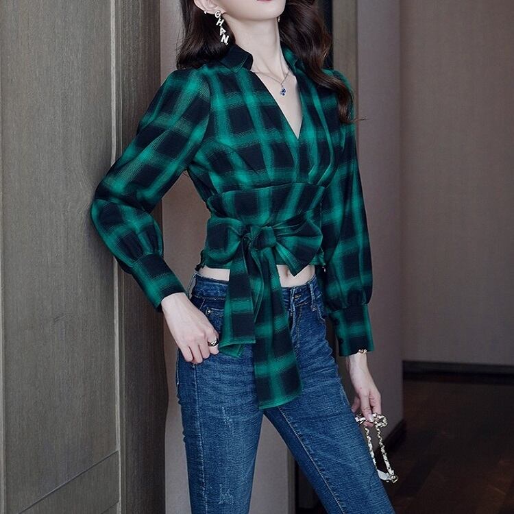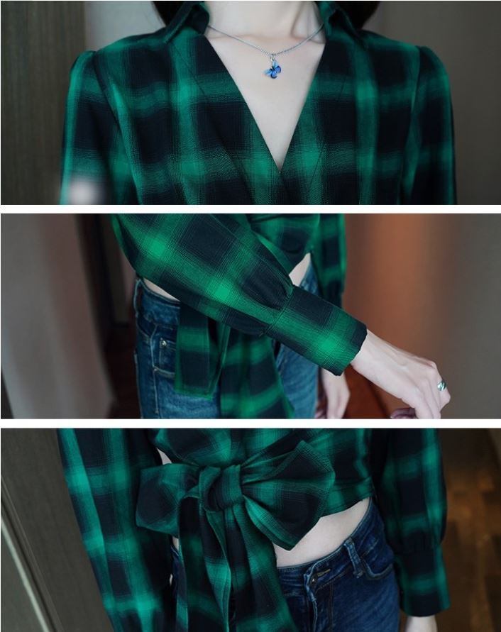チェックシャツ 長袖 Vネック ウエストリボン レトロ きれいめ カジュアル お出かけ デート グリーン
