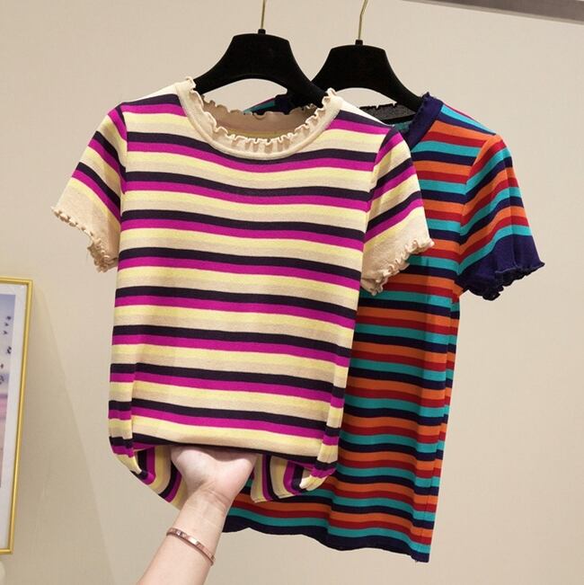 全3色 トップス Tシャツ サマーニット ボーダー ブラウス ラウンドネック スリム フリル 半袖 フェミニン 大人可愛い デート カジュアル シンプル デイリー 夏