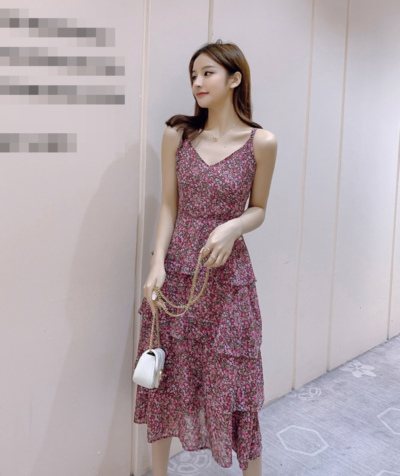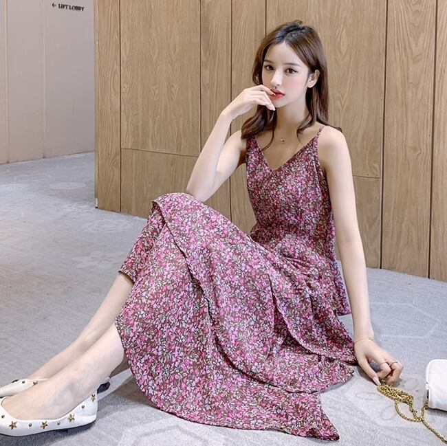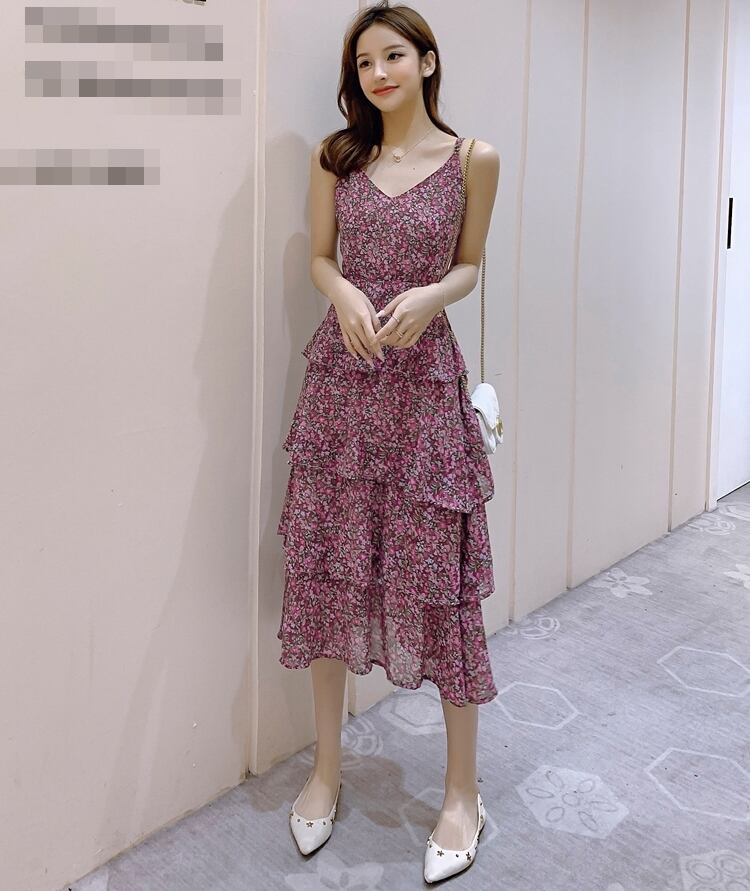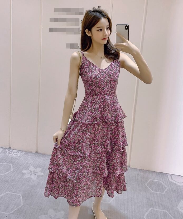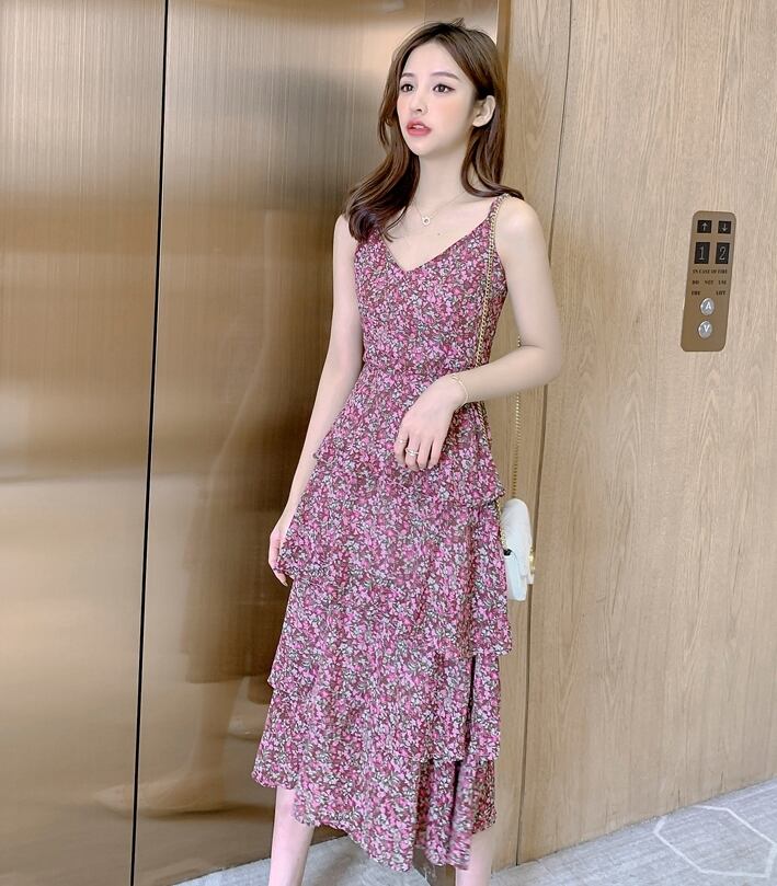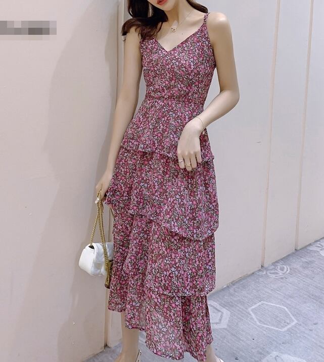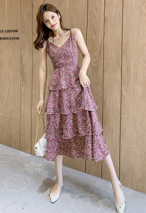 ワンピース キャミソールワンピ ミモレ丈 ロング丈 小花柄 ティアード フレア ハイウエスト Vネック ガーリー スリム フェミニン 大人可愛い カジュアル お出かけ リゾート 夏