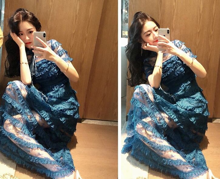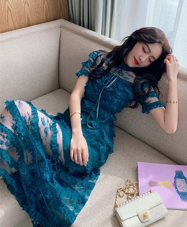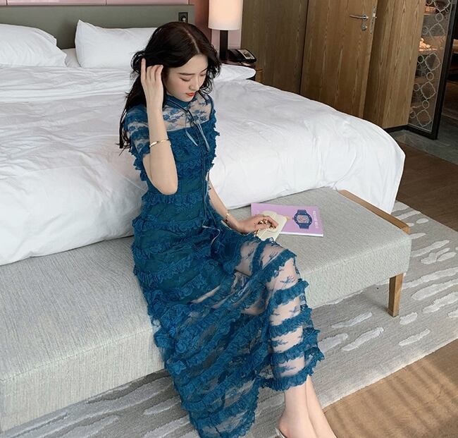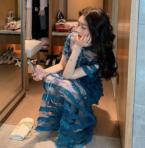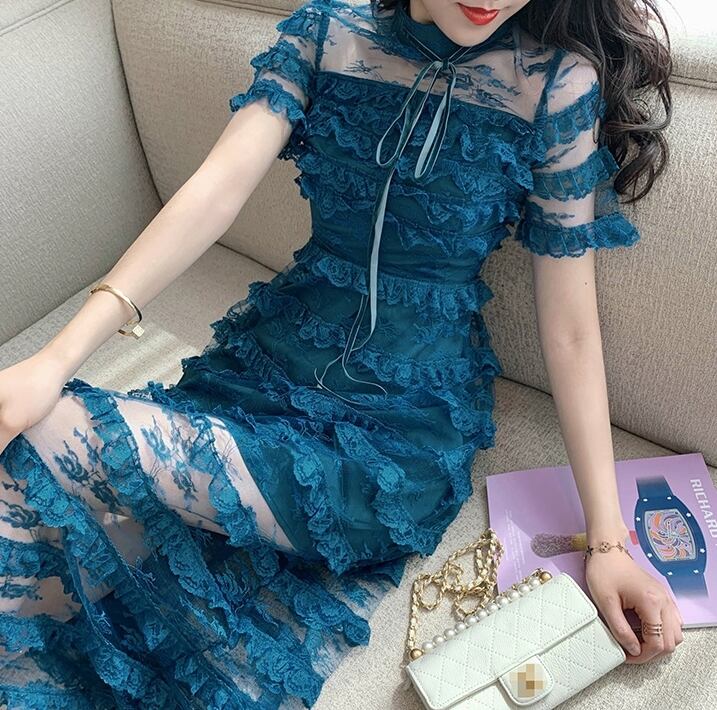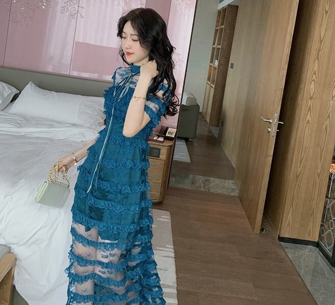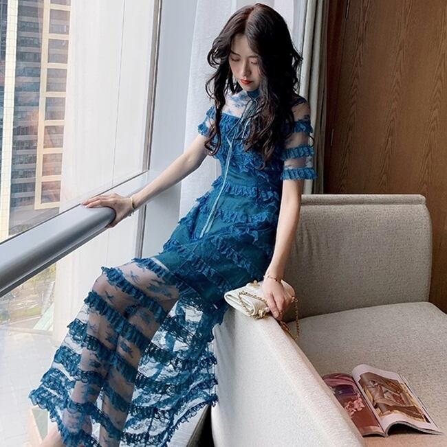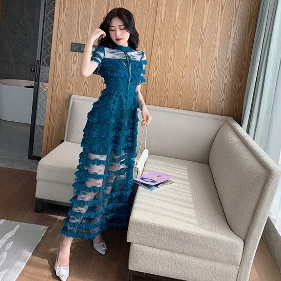 ワンピース ドレス スリム ティアード ロング丈 シースルー 上品 ボーダー 半袖 ハイネック エレガント パーティー ナイト お呼ばれ ディナー フリル セクシー フェミニン 春 夏