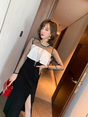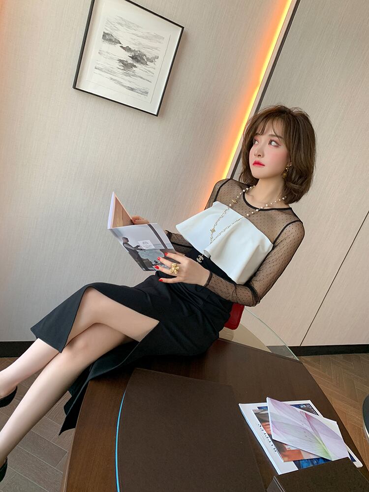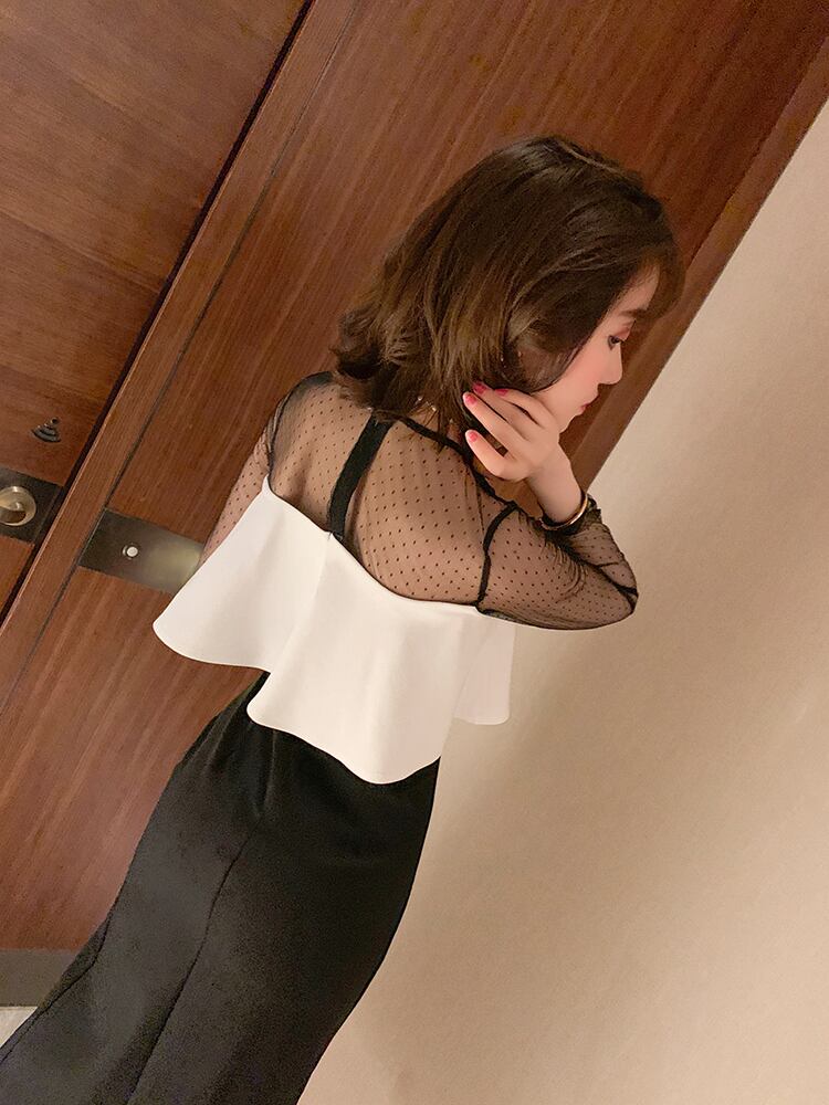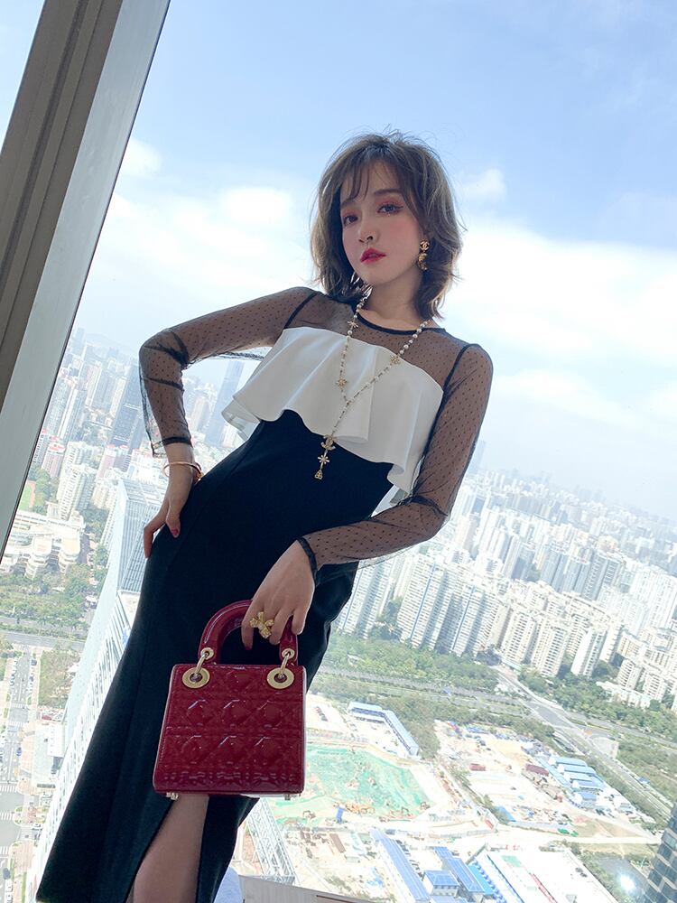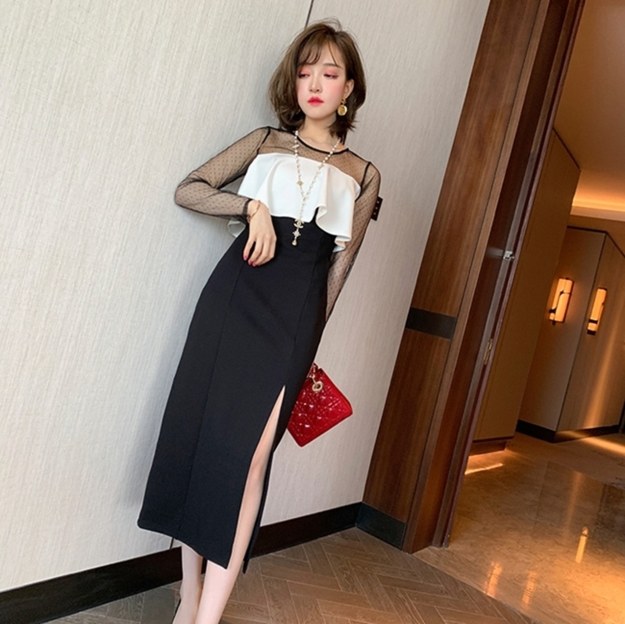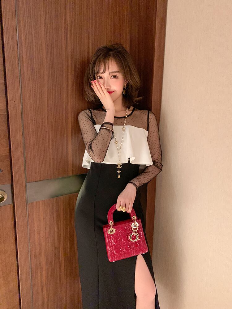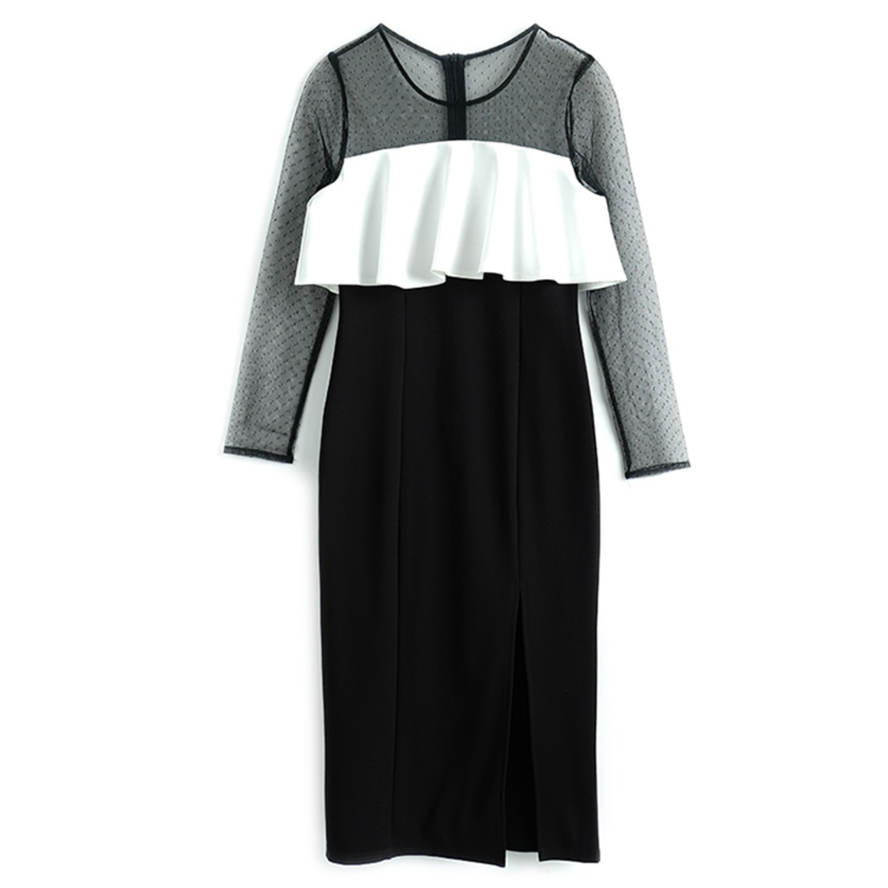 ワンピース ドレス ミモレ丈 スリット スリム シースルー レース バイカラー きれいめ 上品 お呼ばれ パーティー フェミニン ナイト エレガント 大人 長袖 春 夏