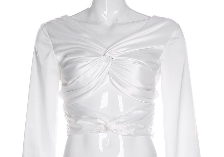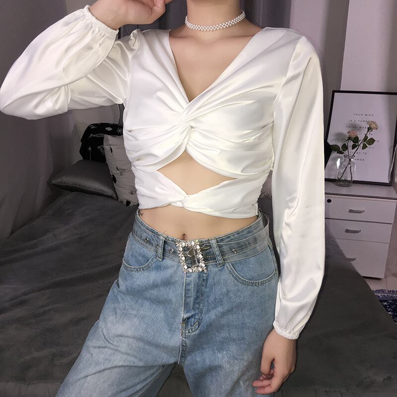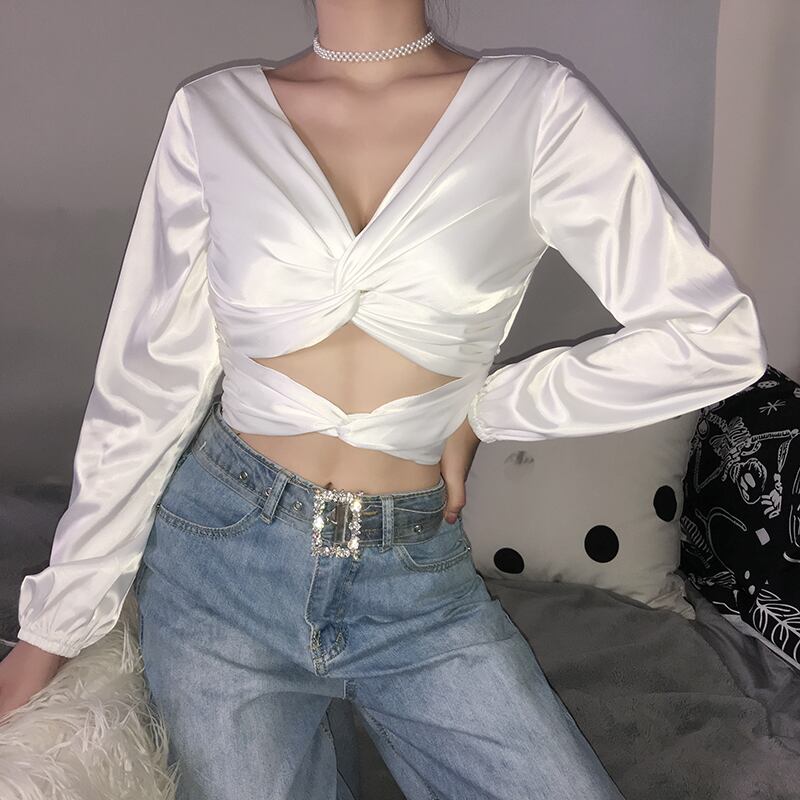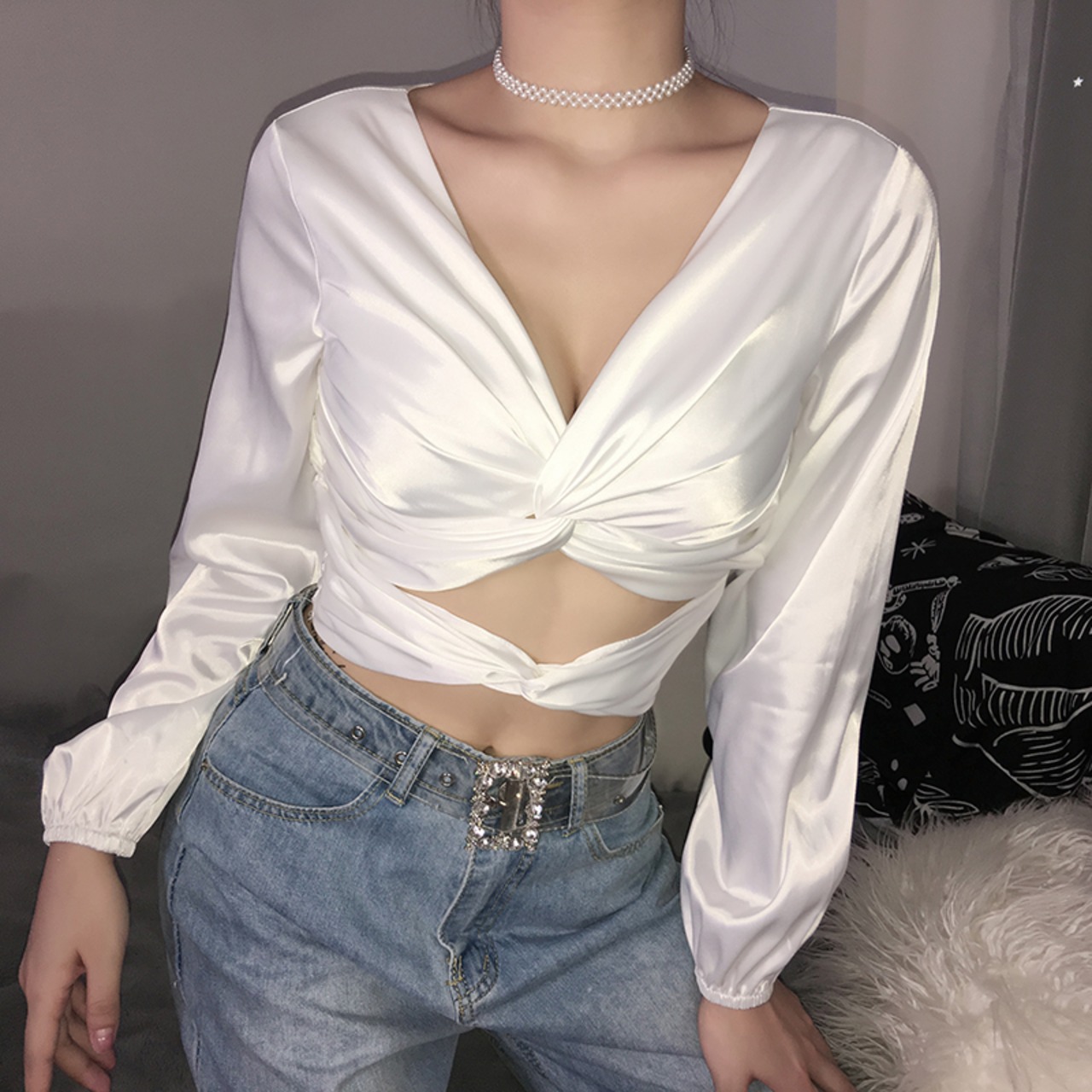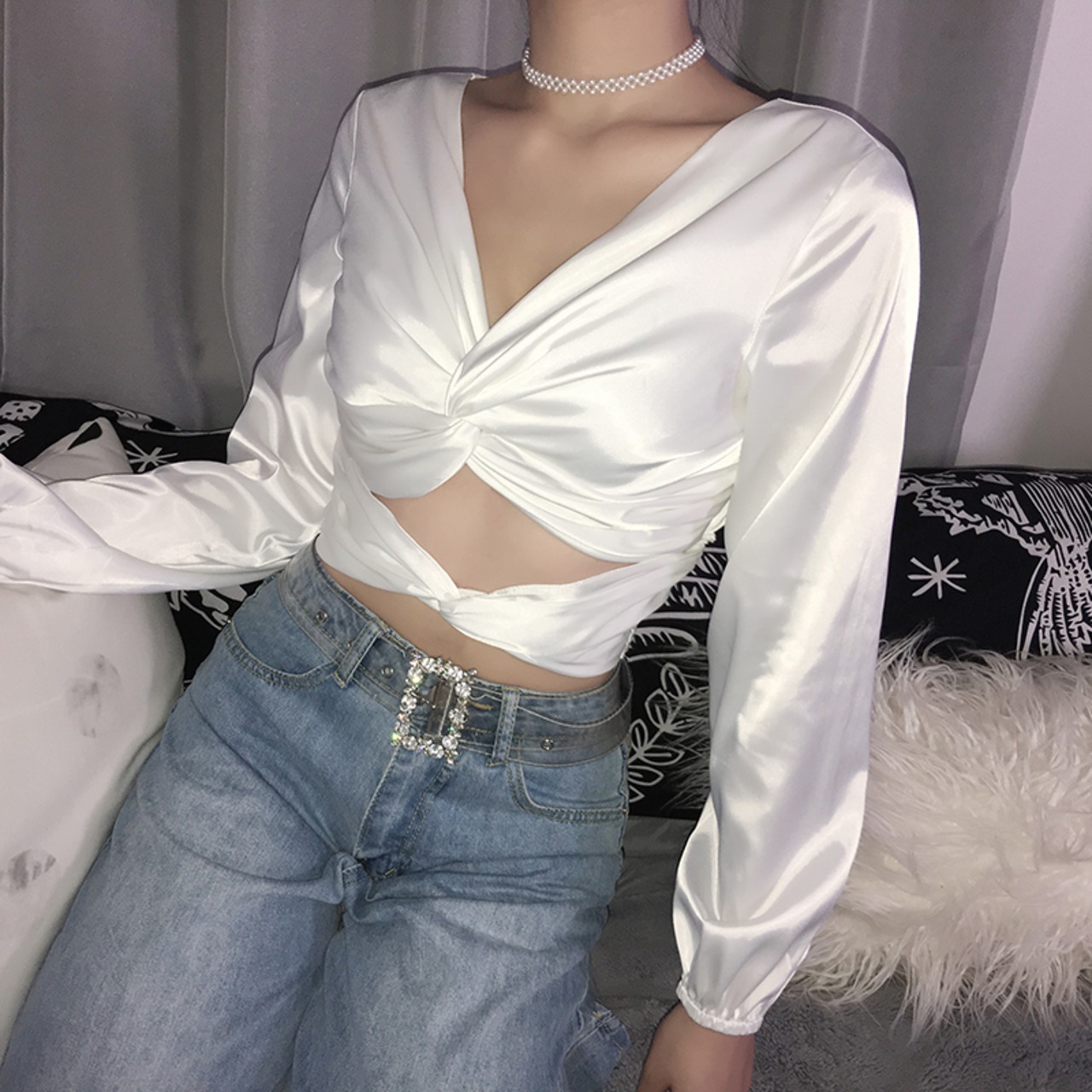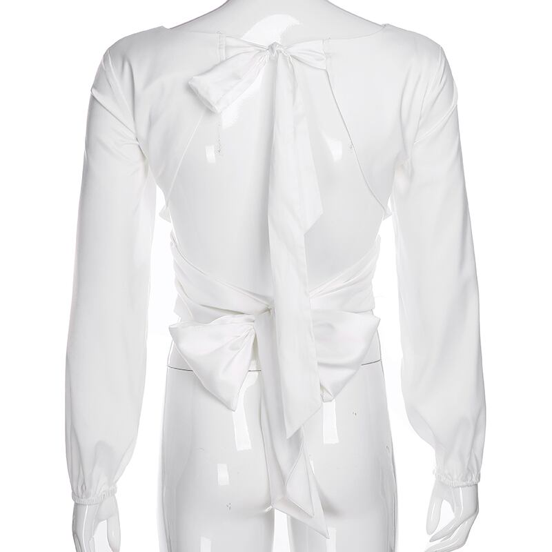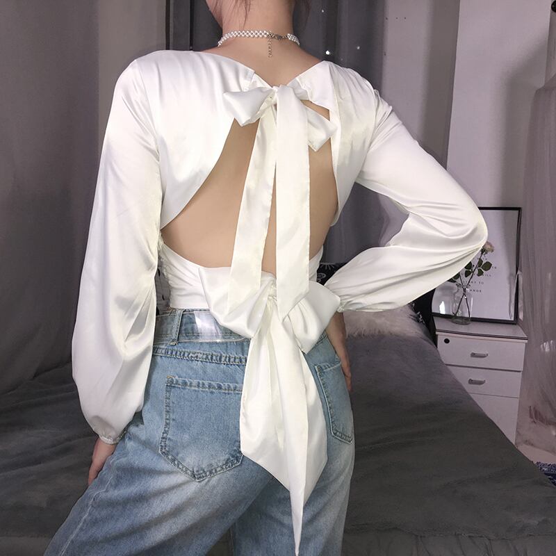 バックコンシャス トップス ブラウス フロントコンシャス バックシャン バックリボン 光沢 フロント結び スリム セクシー 背中見せ 長袖 Vネック ショート丈 カジュアル 春 夏