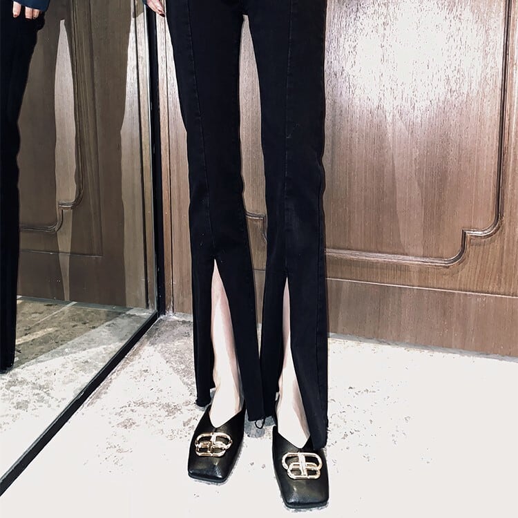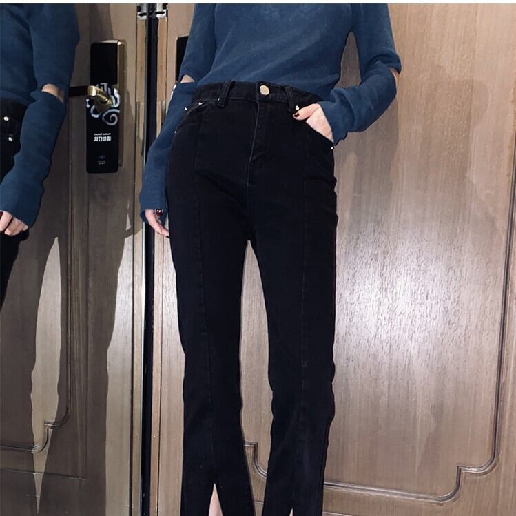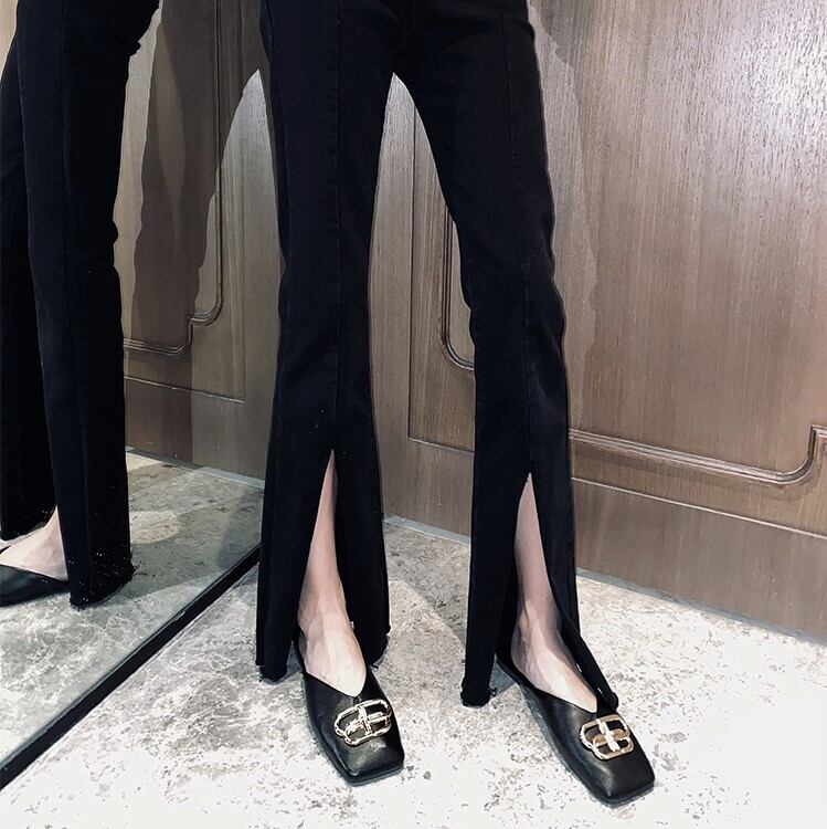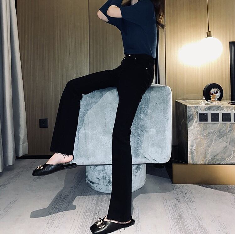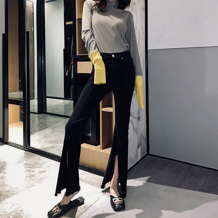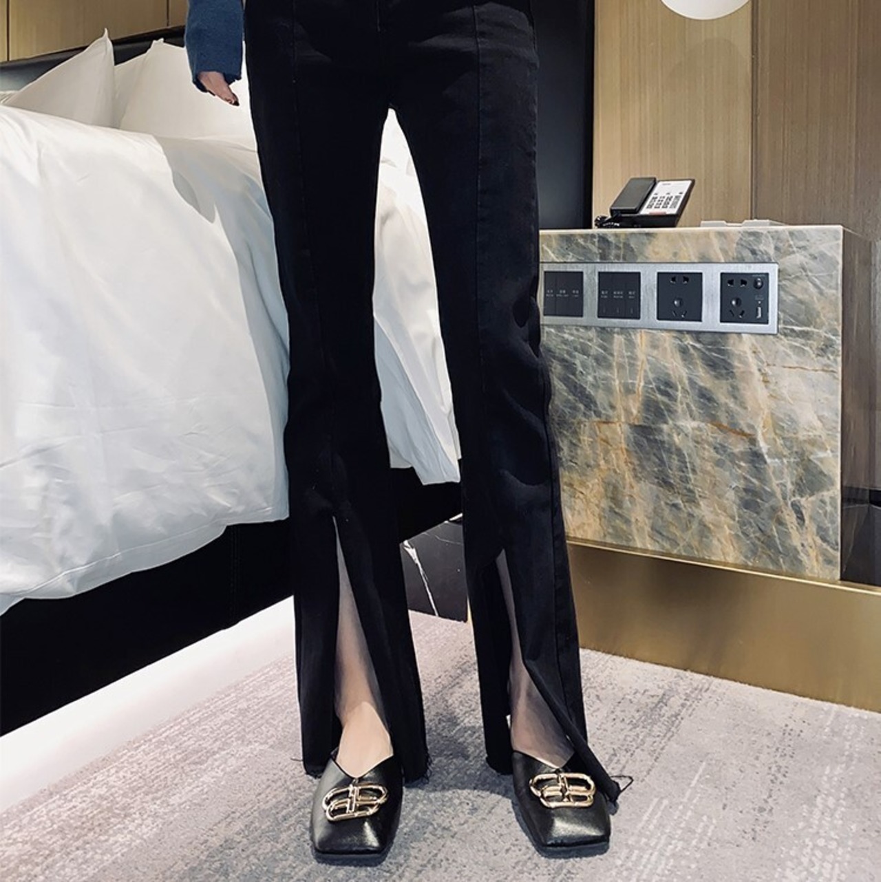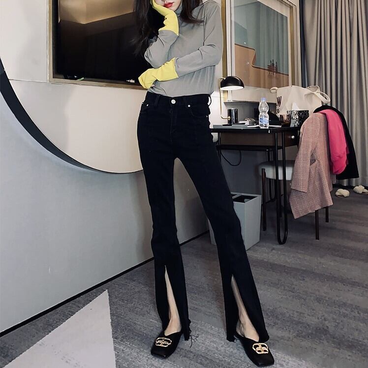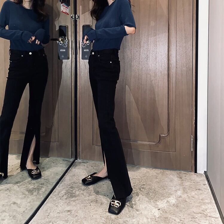 フレアジーンズ ハイウエスト ブラックジーンズ スリット 美脚 無地 カジュアル リゾート お出かけ デート ブラック