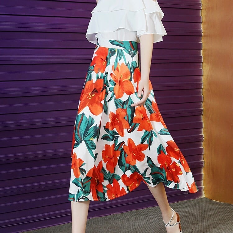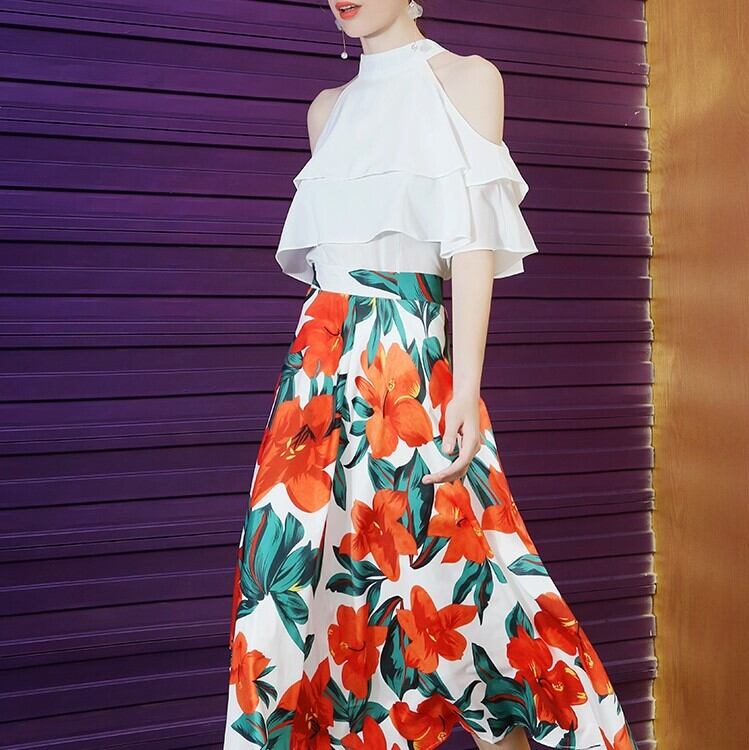 セットアップ 上下セット ブラウス オープンショルダー フリル フレアスカート 花柄 ミディ丈 きれいめ カジュアル リゾート お出かけ デート ホワイト