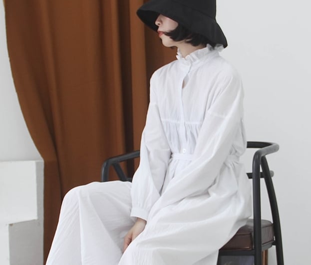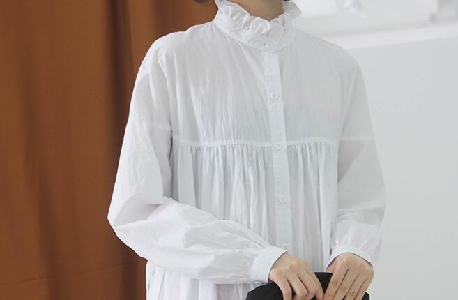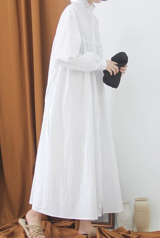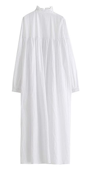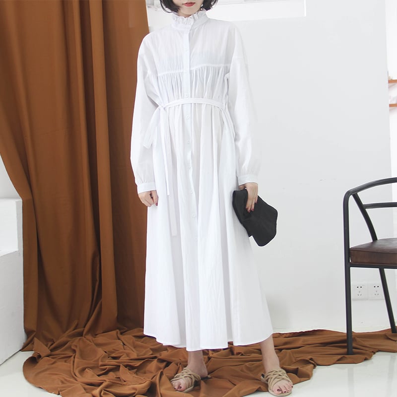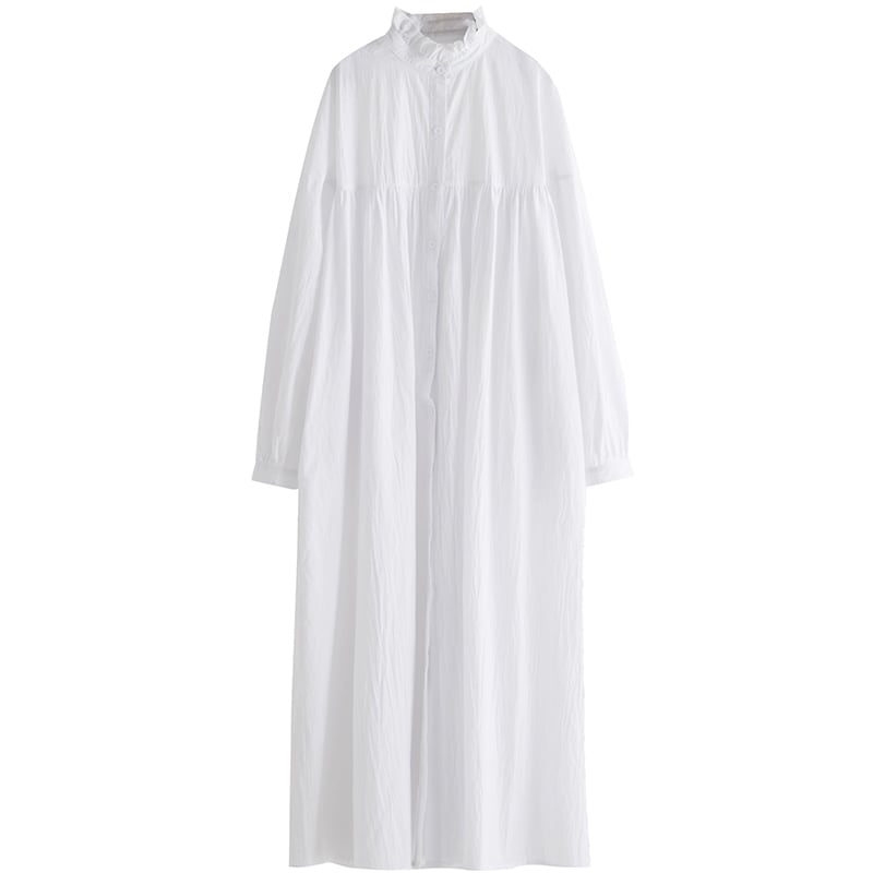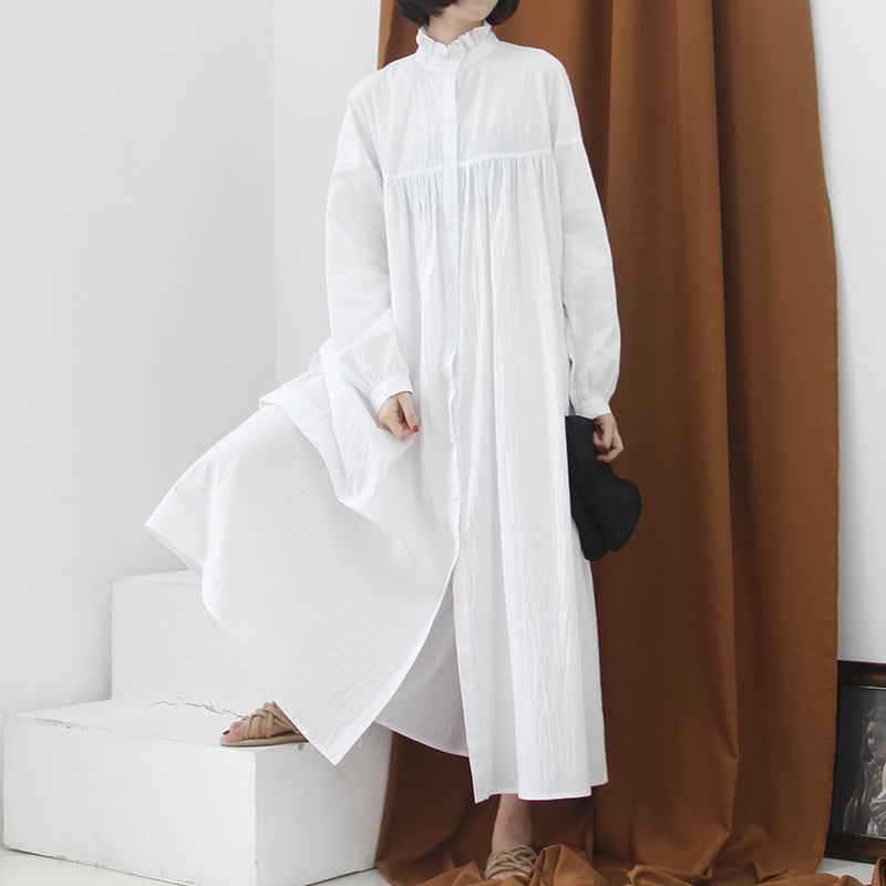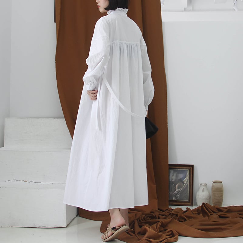 ワンピース シャツワンピース オーバーサイズ 体型カバー ゆったり ロング丈 ハイネック フロントボタン 長袖 パフスリーブ フレア ビッグシルエット 無地 カジュアル 大人 シンプル 春 夏