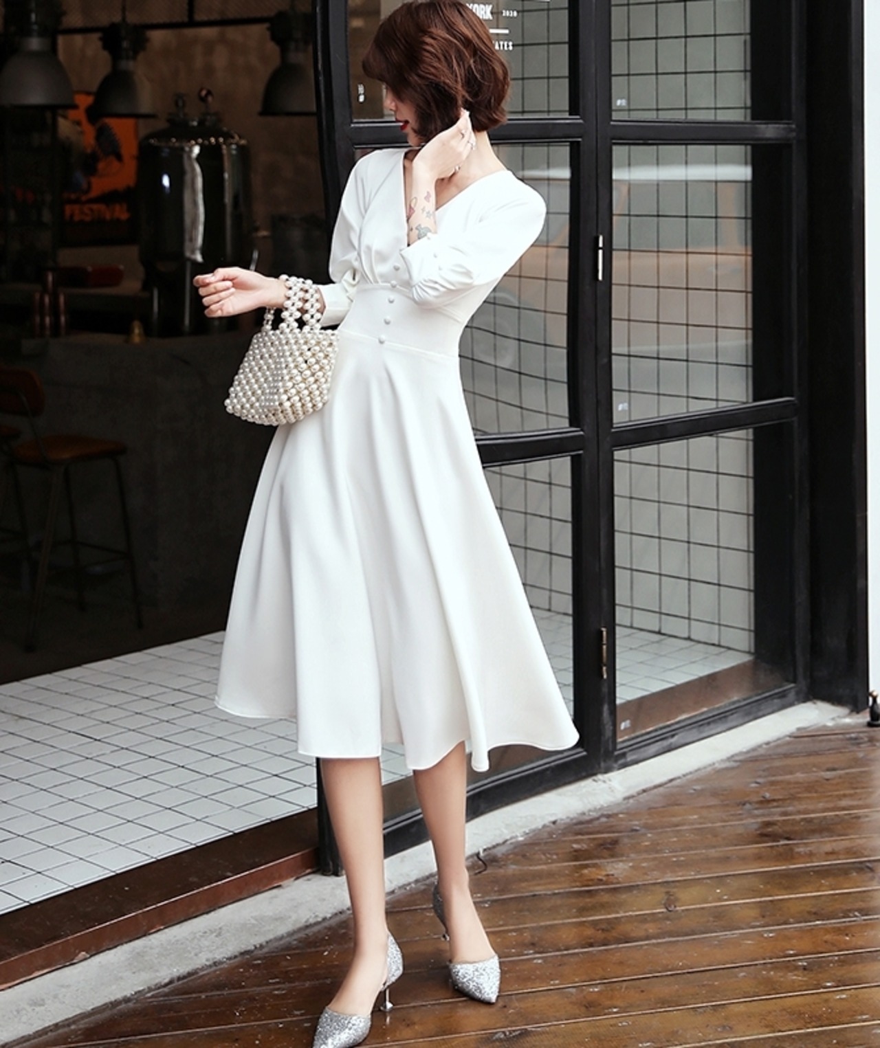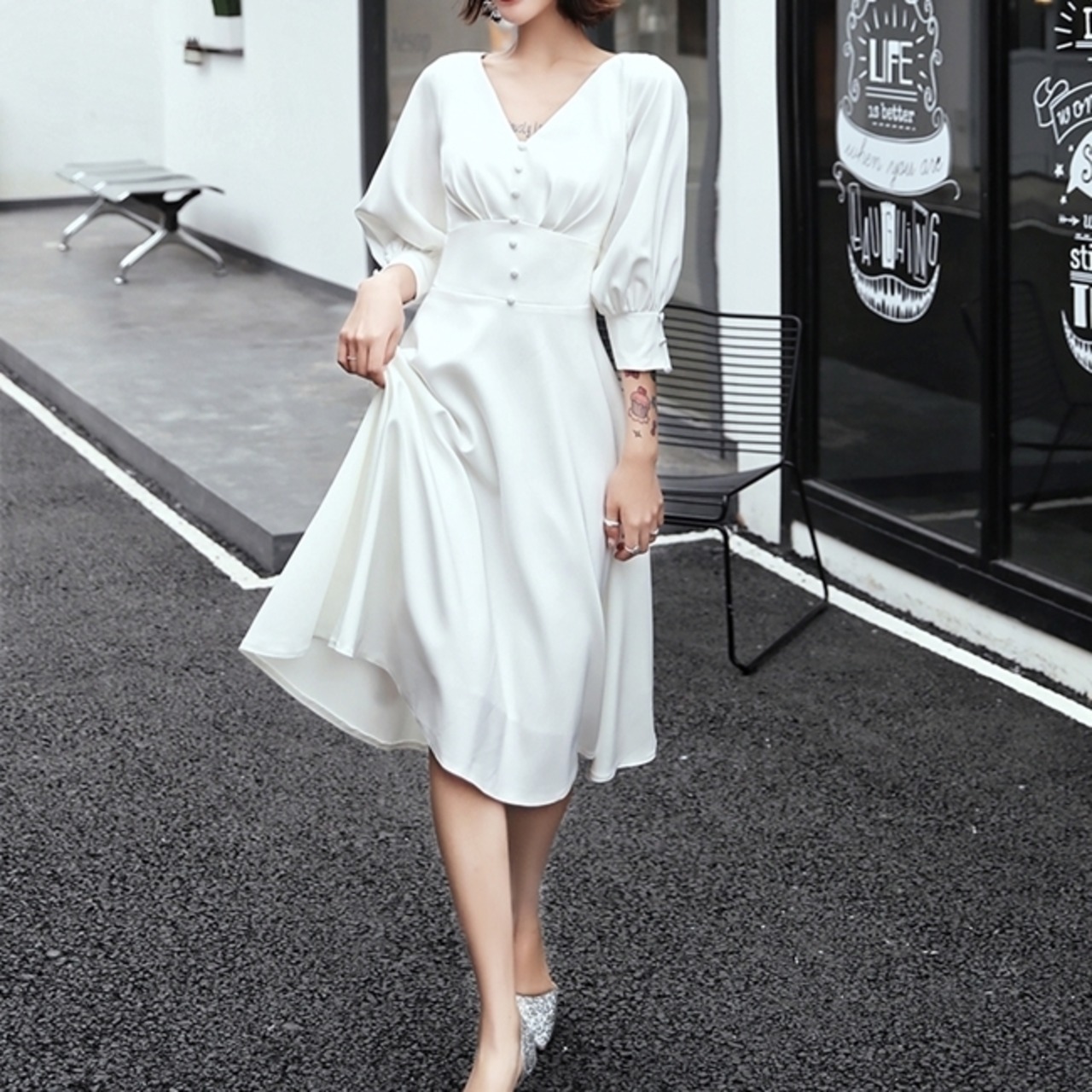 全3色 ワンピース ドレス 7分袖 ハイウエスト フレア スリム フロントボタン Vネック パフスリーブ ミディ丈 大人 カジュアル きれいめ 無地 お呼ばれ ディナー 春 夏 大きいサイズ