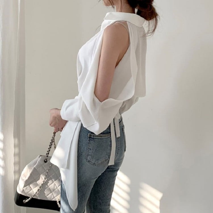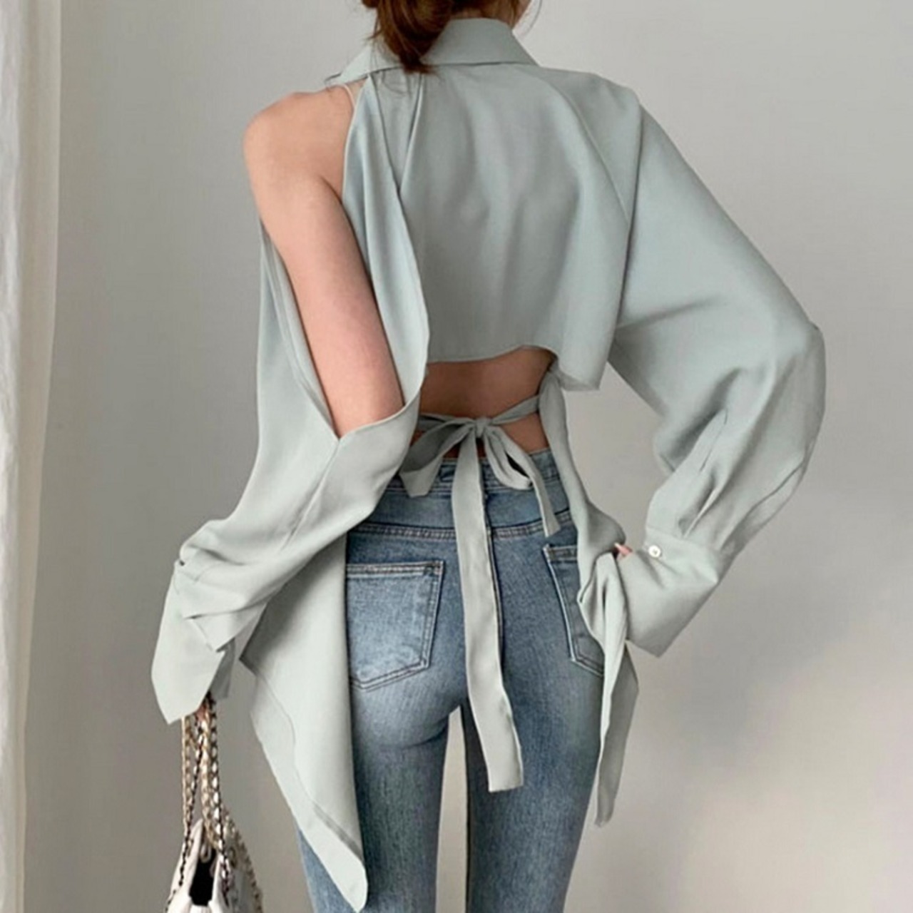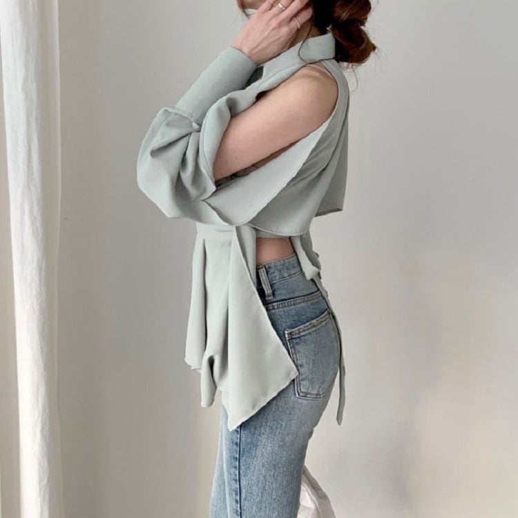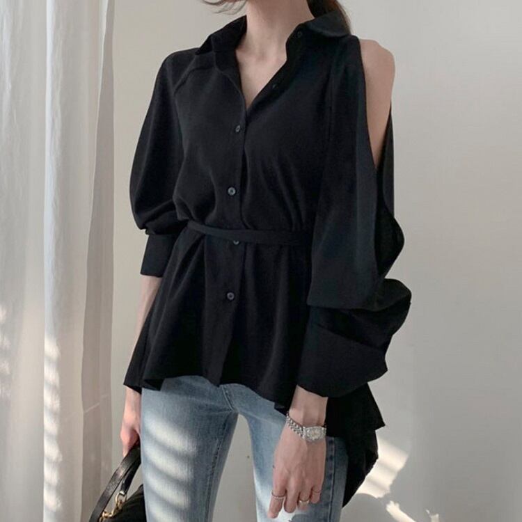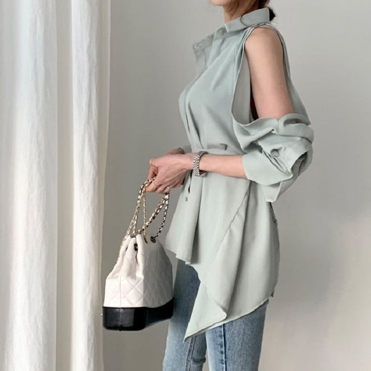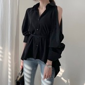 アシンメトリーデザインがセクシーさを際立たせるブラウス。