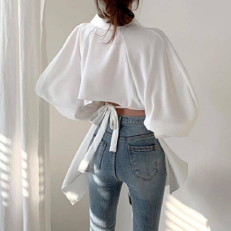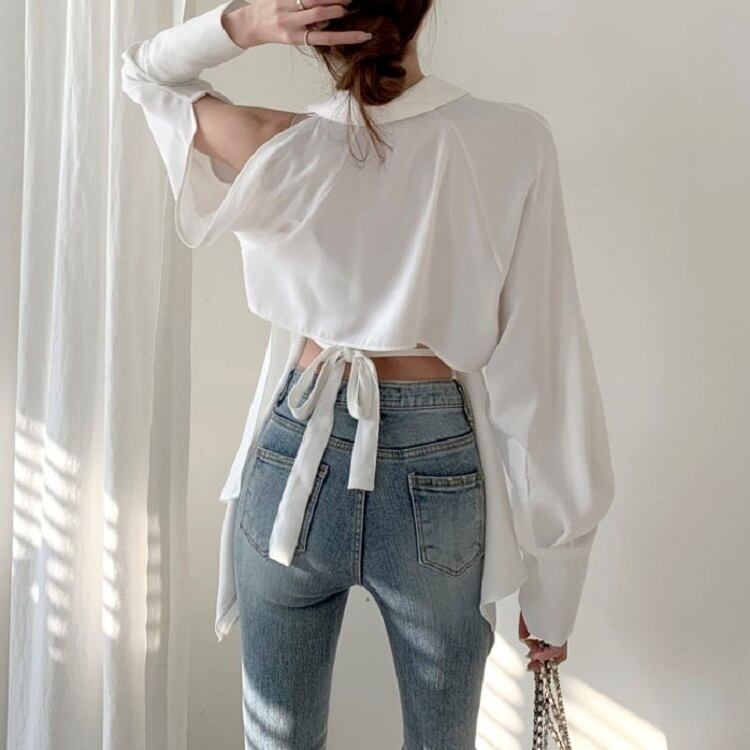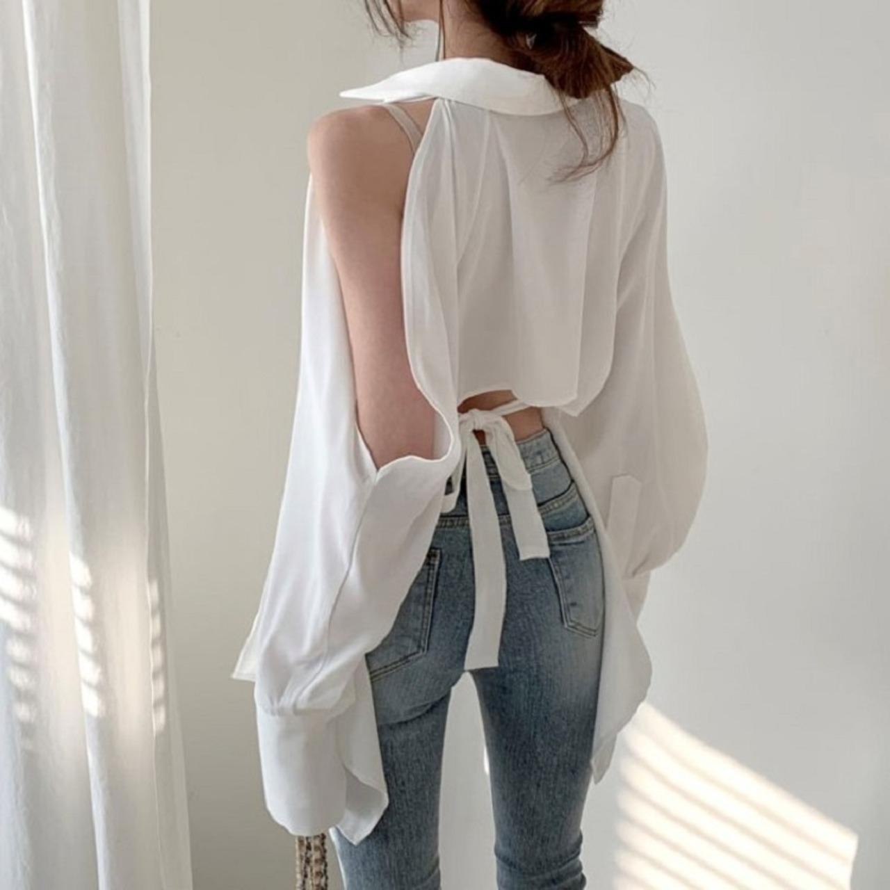 全3色 長袖ブラウス オープンショルダー 肌見せ アシンメトリー バックコンシャス リボン ゆったり 無地 カジュアル セクシー リゾート お出かけ デート ブラック グリーン ホワイト