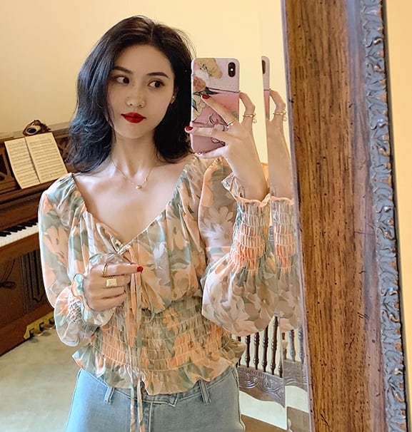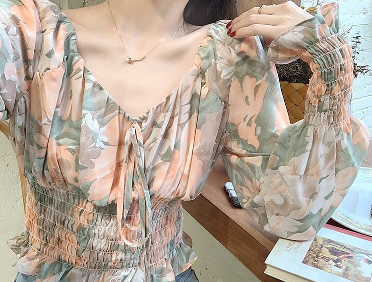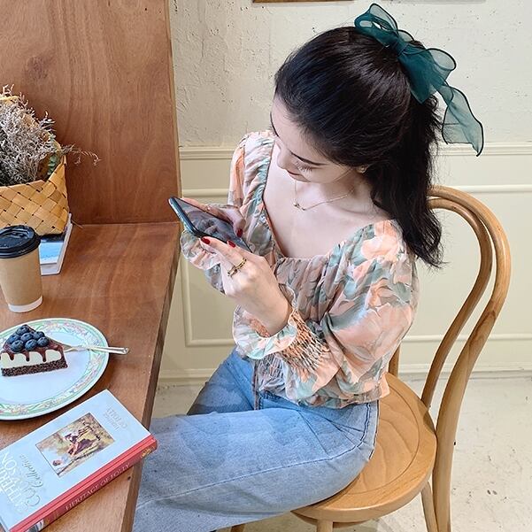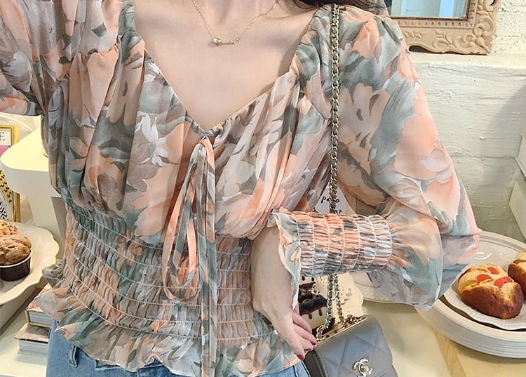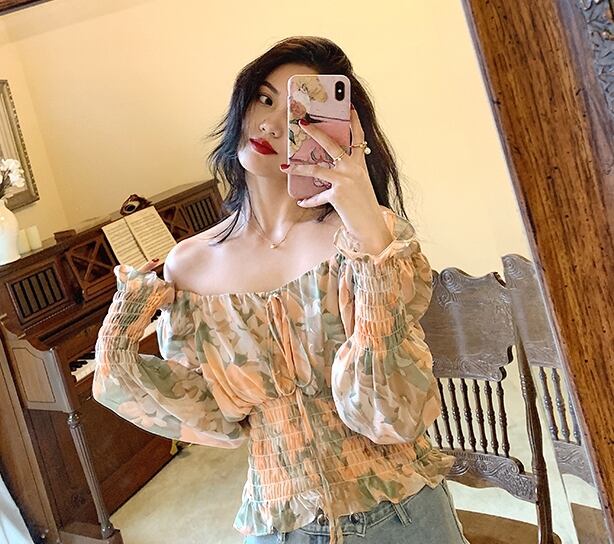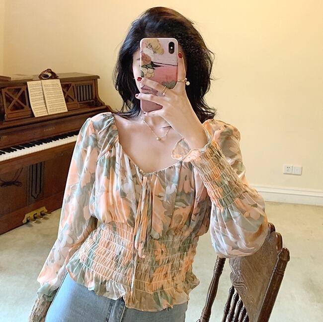 トップス ブラウス 花柄 オフショルダー リボン フロントコンシャス 長袖 シフォン パフスリーブ Vネック フリル 大人可愛い カジュアル きれいめ 春 夏