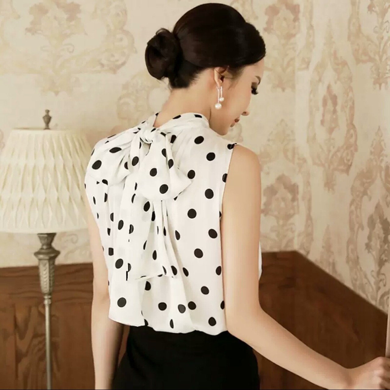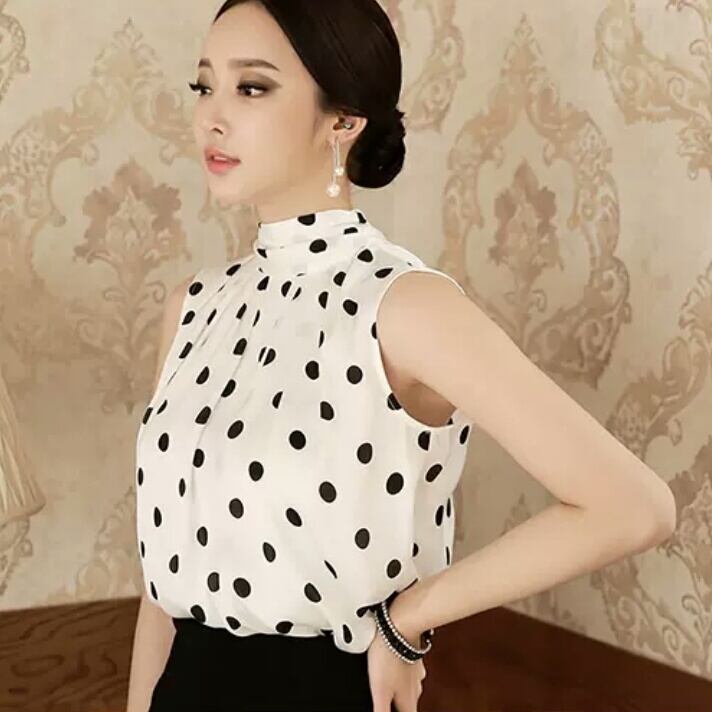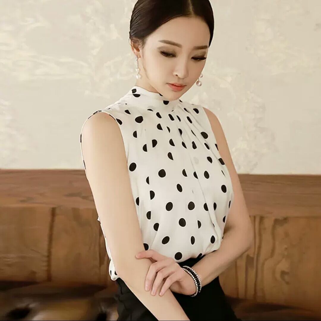 ポルカドット柄 ノースリーブ シフォン シャツ トップス 大人 カジュアル キレイめ 上品 エレガント お出かけ お買い物 デート 女子会 通学 学生 通勤 韓国ファッション