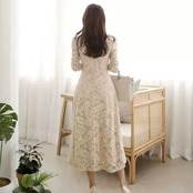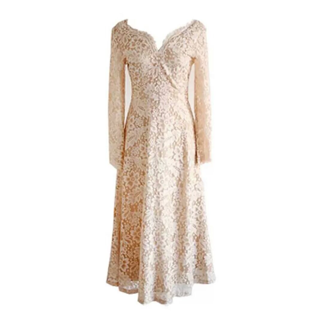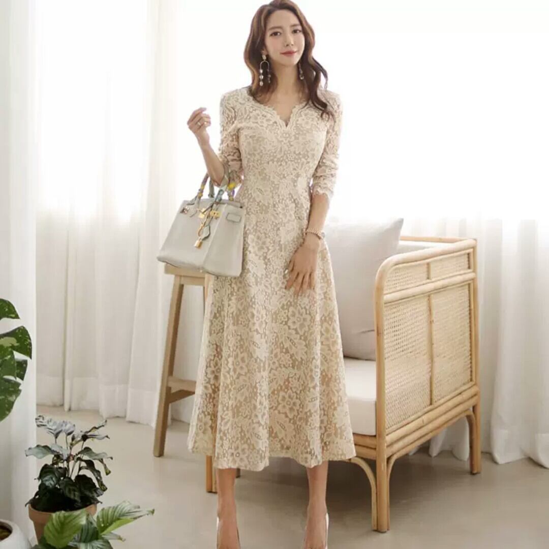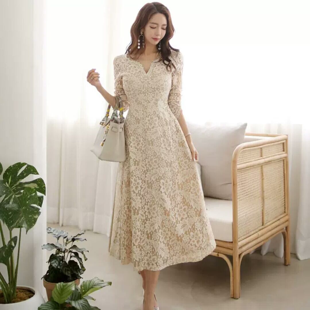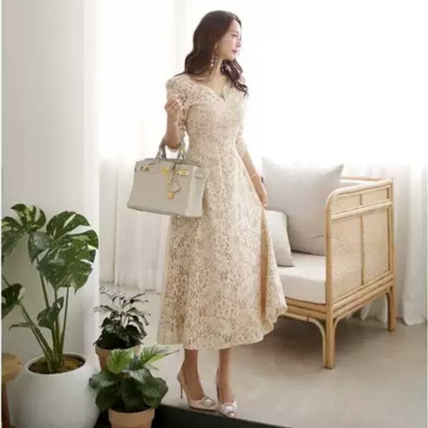 Vネック レース ワンピース ドレス ミモレ丈 大人 エレガント 上品 キレイめ お呼ばれ お出かけ お買い物 デート 女子会 通学 学生 通勤 韓国ファッション