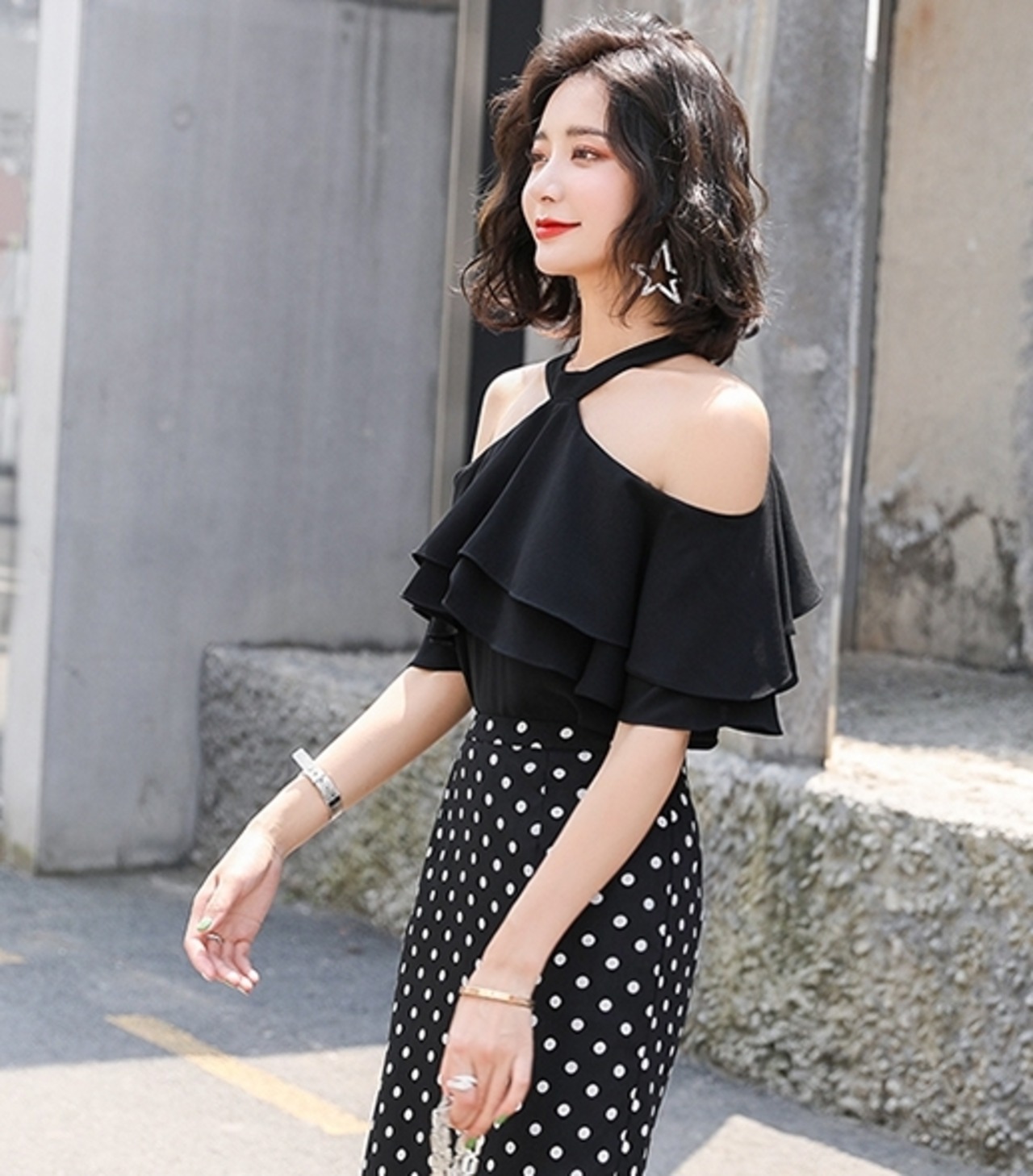 全2色 トップス ブラウス フリル ホルターネック オフショルダー 大人可愛い 5分袖 カジュアル きれいめ 上品 春 夏