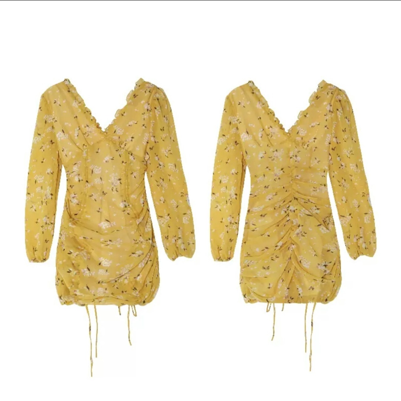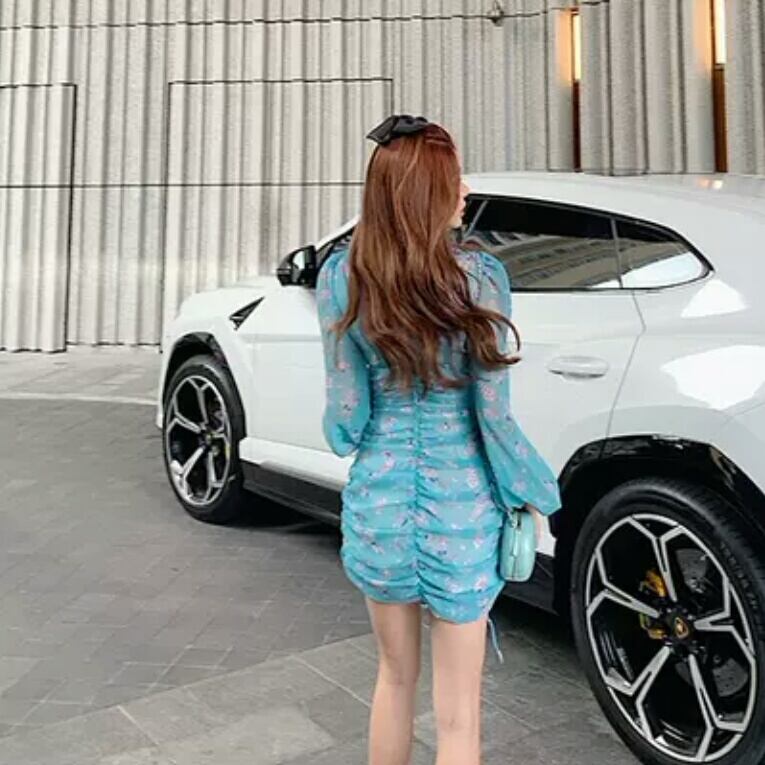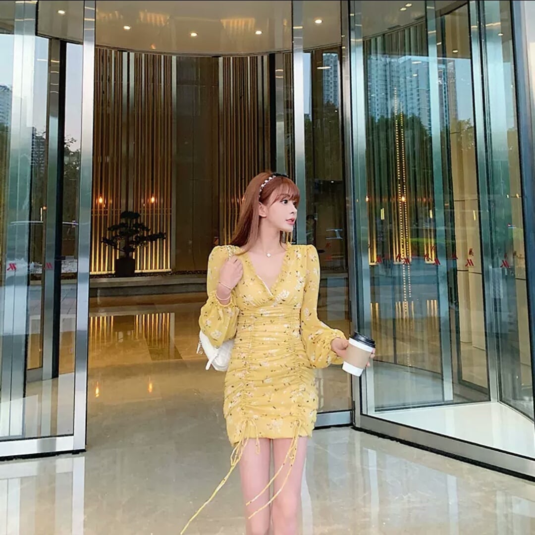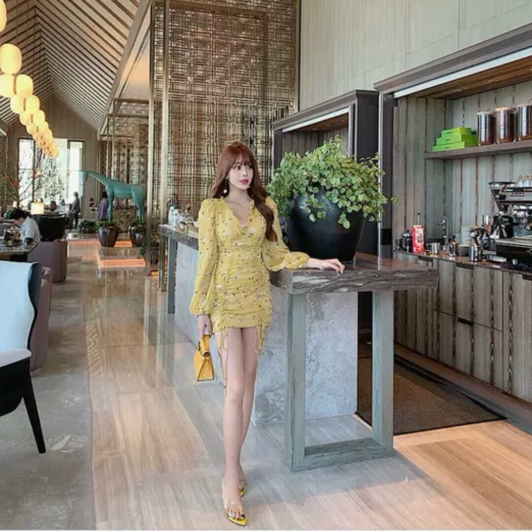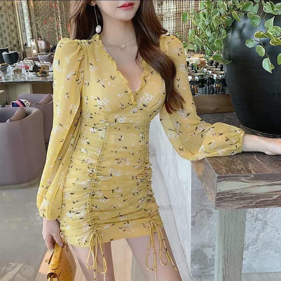 全2色 花柄 Vネック ショート丈 ワンピース ドレス タイト スリム 大人 カジュアル キレイめ エレガント 上品 可愛い お出かけ お買い物 デート 女子会 通学 学生 通勤 韓国ファッション