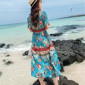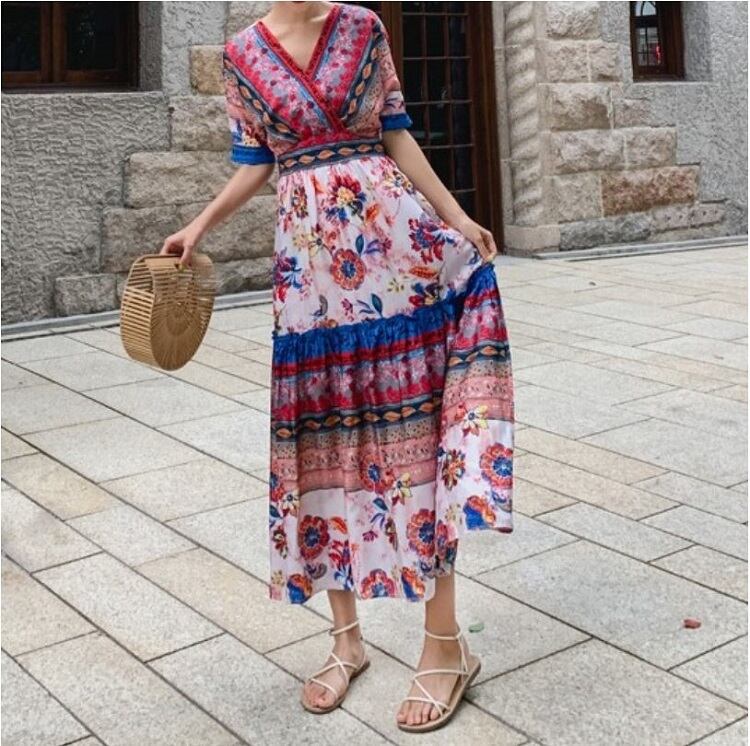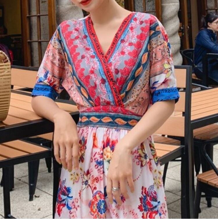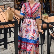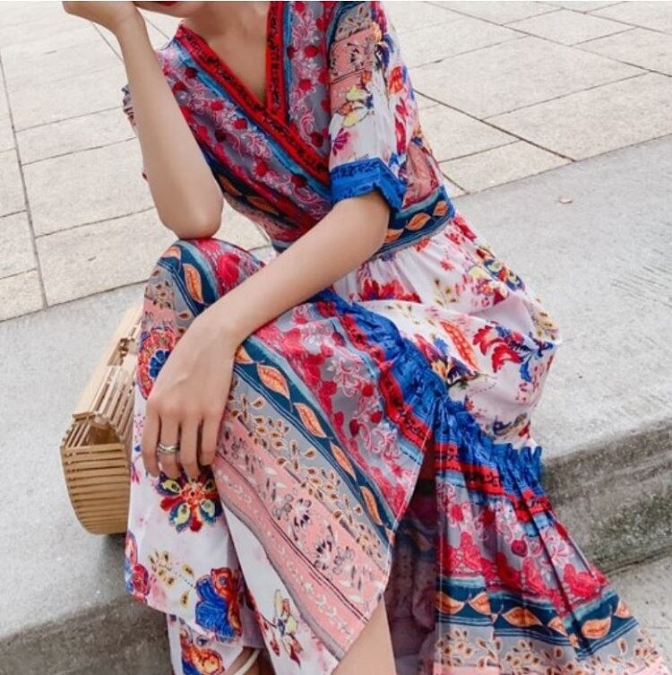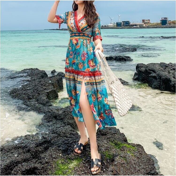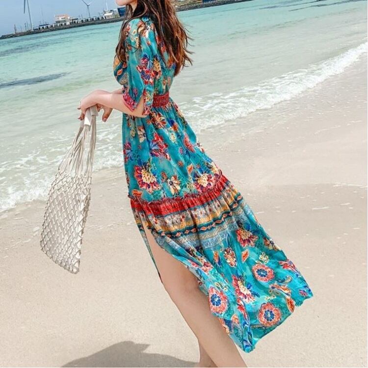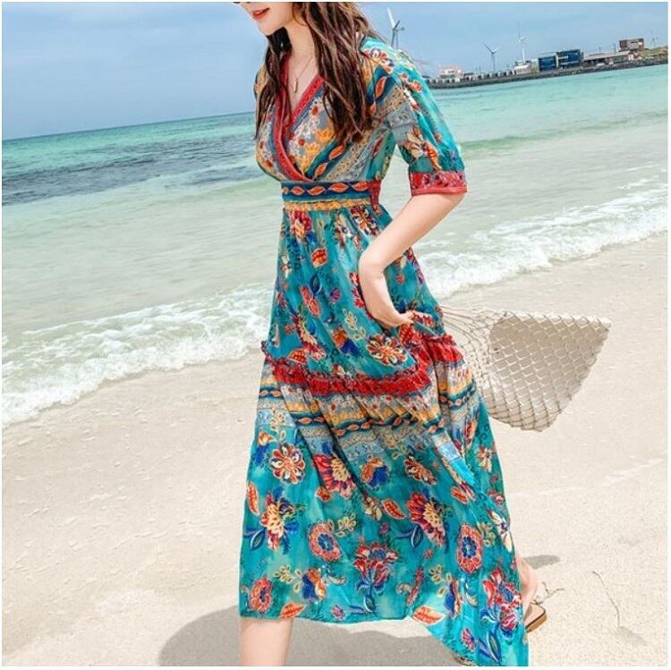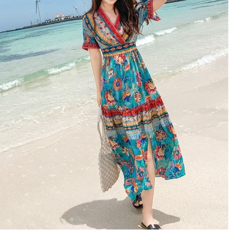 全2色 シフォンワンピース カシュクール ドレス ロング丈 花柄 Vネック 半袖 ボヘミアン スリット レトロ ゆったり きれいめ カジュアル セクシー フェミニン リゾート ビーチ 夏 ブルー ピンク