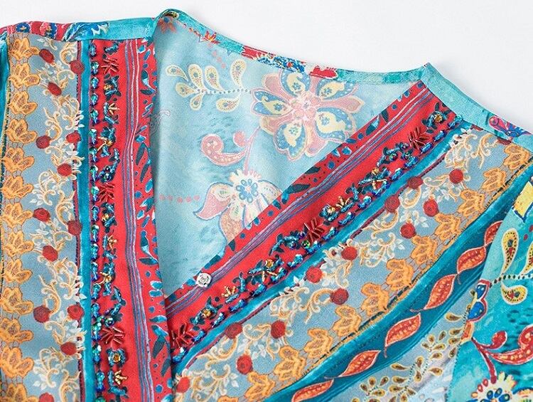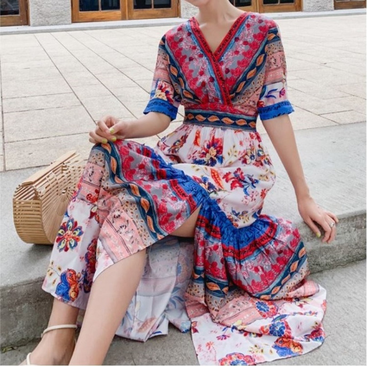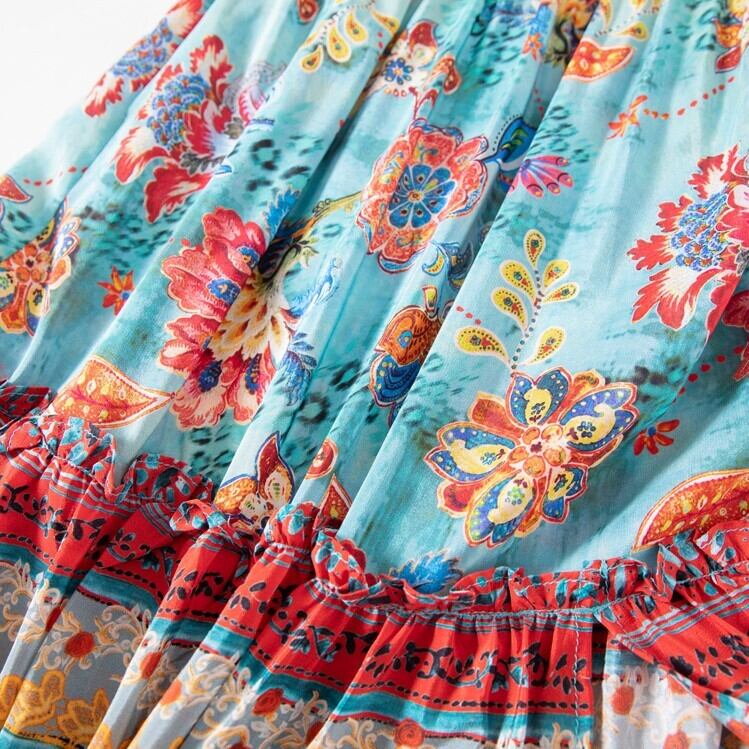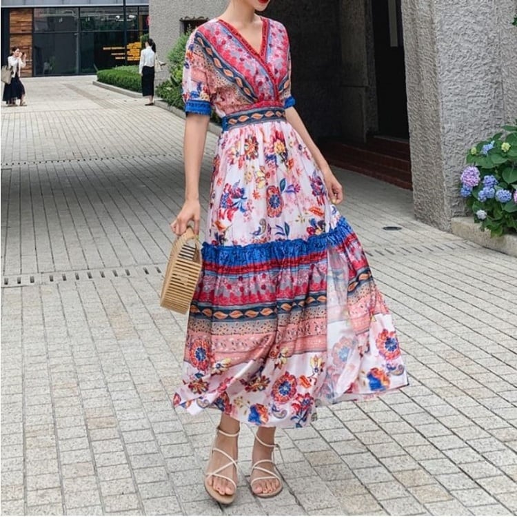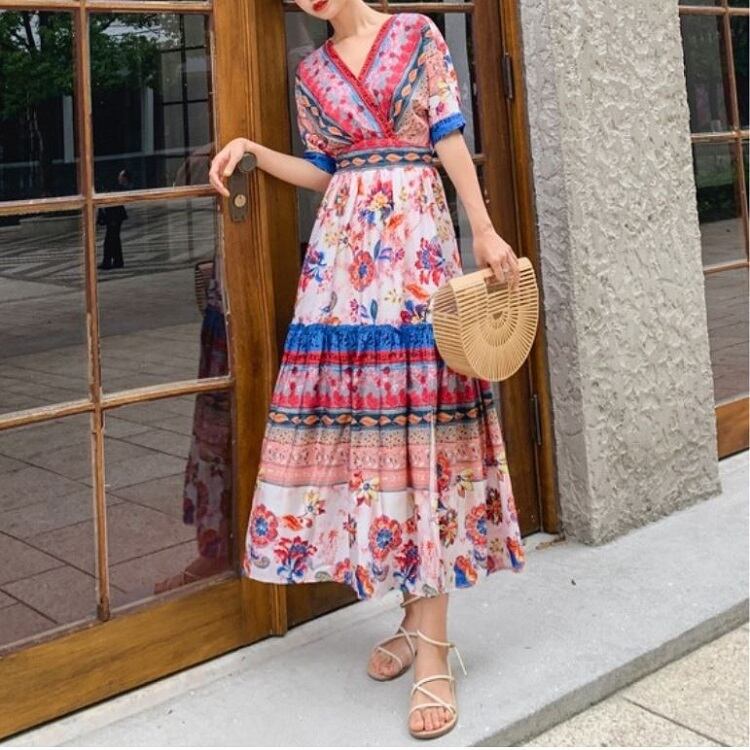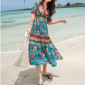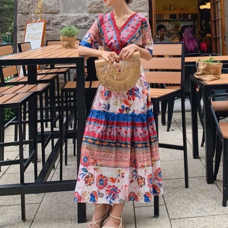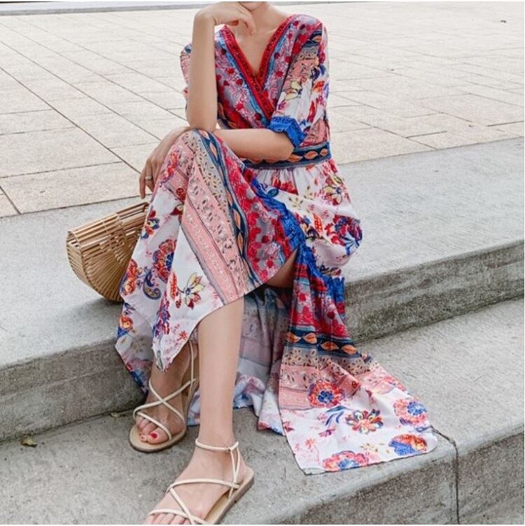 全2色 シフォンワンピース カシュクール ドレス ロング丈 花柄 Vネック 半袖 ボヘミアン スリット レトロ ゆったり きれいめ カジュアル セクシー フェミニン リゾート ビーチ 夏 ブルー ピンク