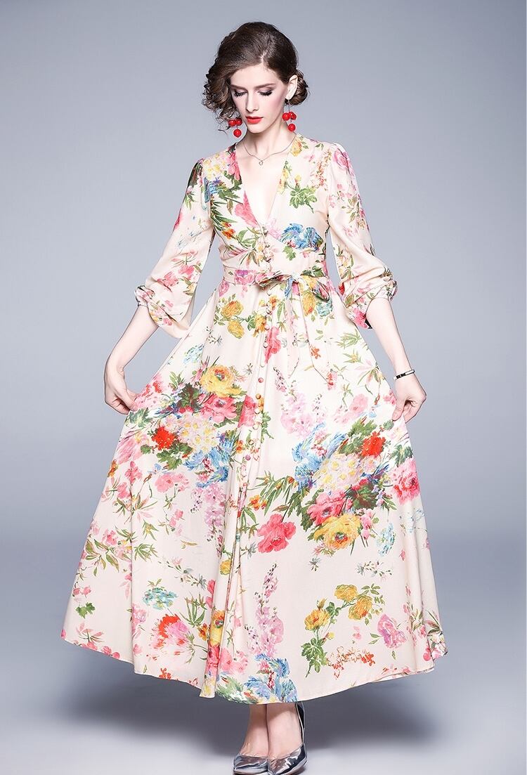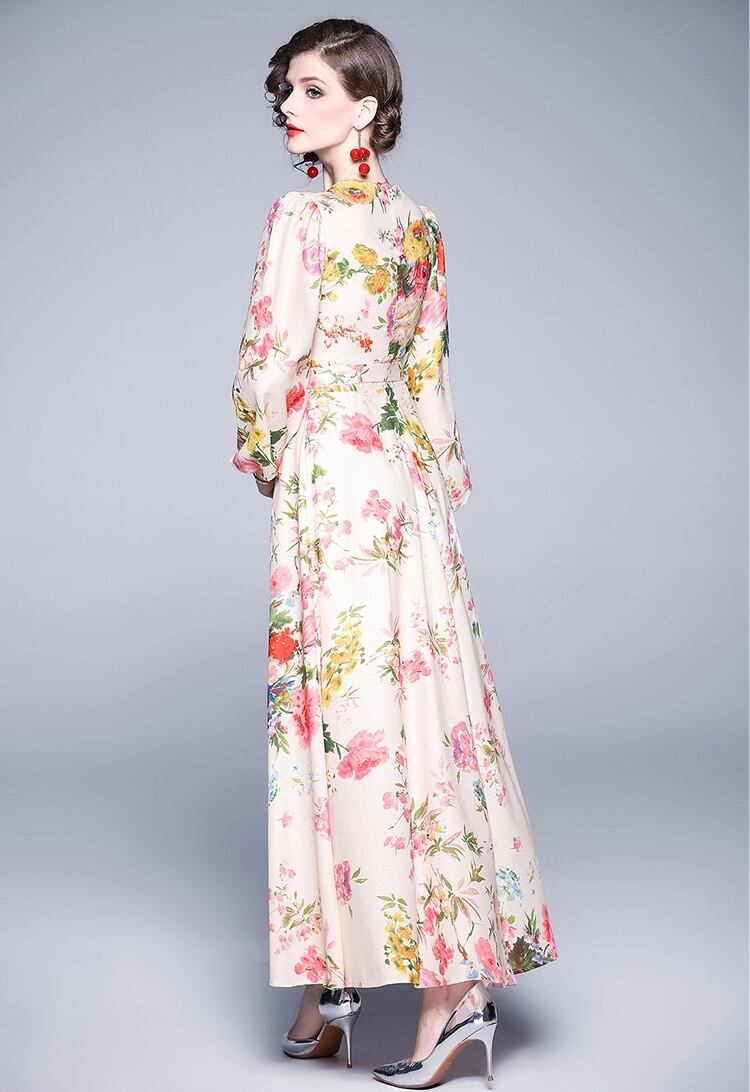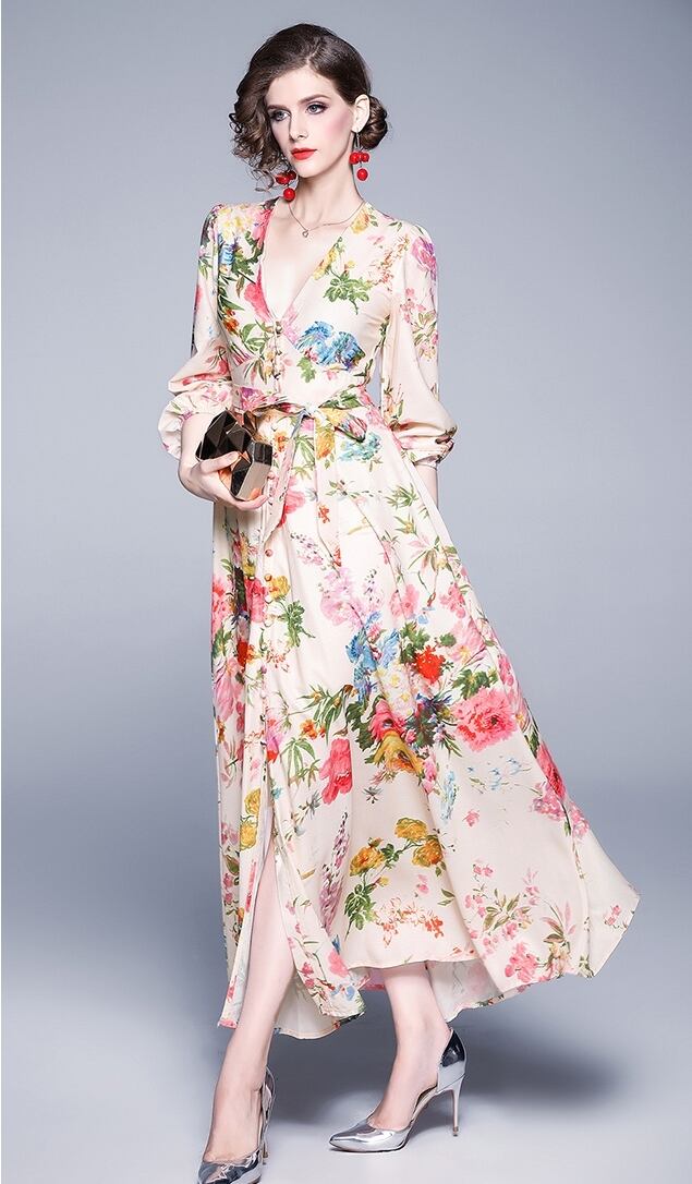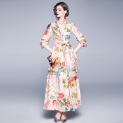 花柄 ワンピース Vネック ロング丈 ウエストリボン Aライン フレア 長袖 マキシ丈 カジュアル リゾート 華やか 大人 フェミニン 春 夏