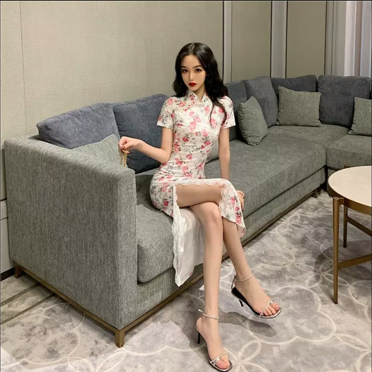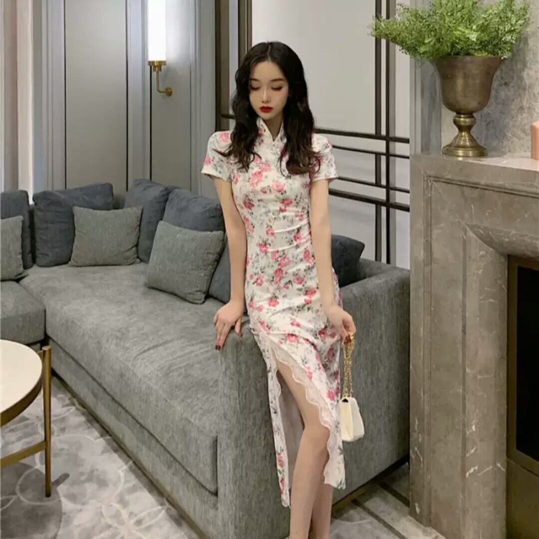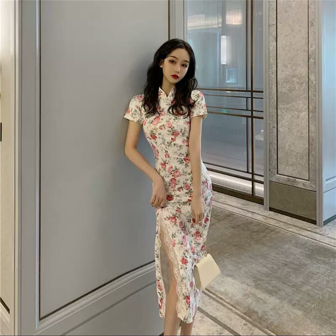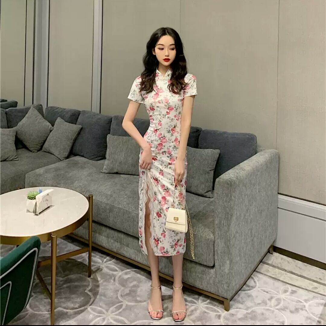 花柄 レトロ チャイナドレス風 ワンピース スリット ロング丈 大人 エレガント 上品 可愛い キレイめ お出かけ お買い物 デート 女子会 通学 学生 通勤 韓国ファッション 春 夏