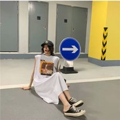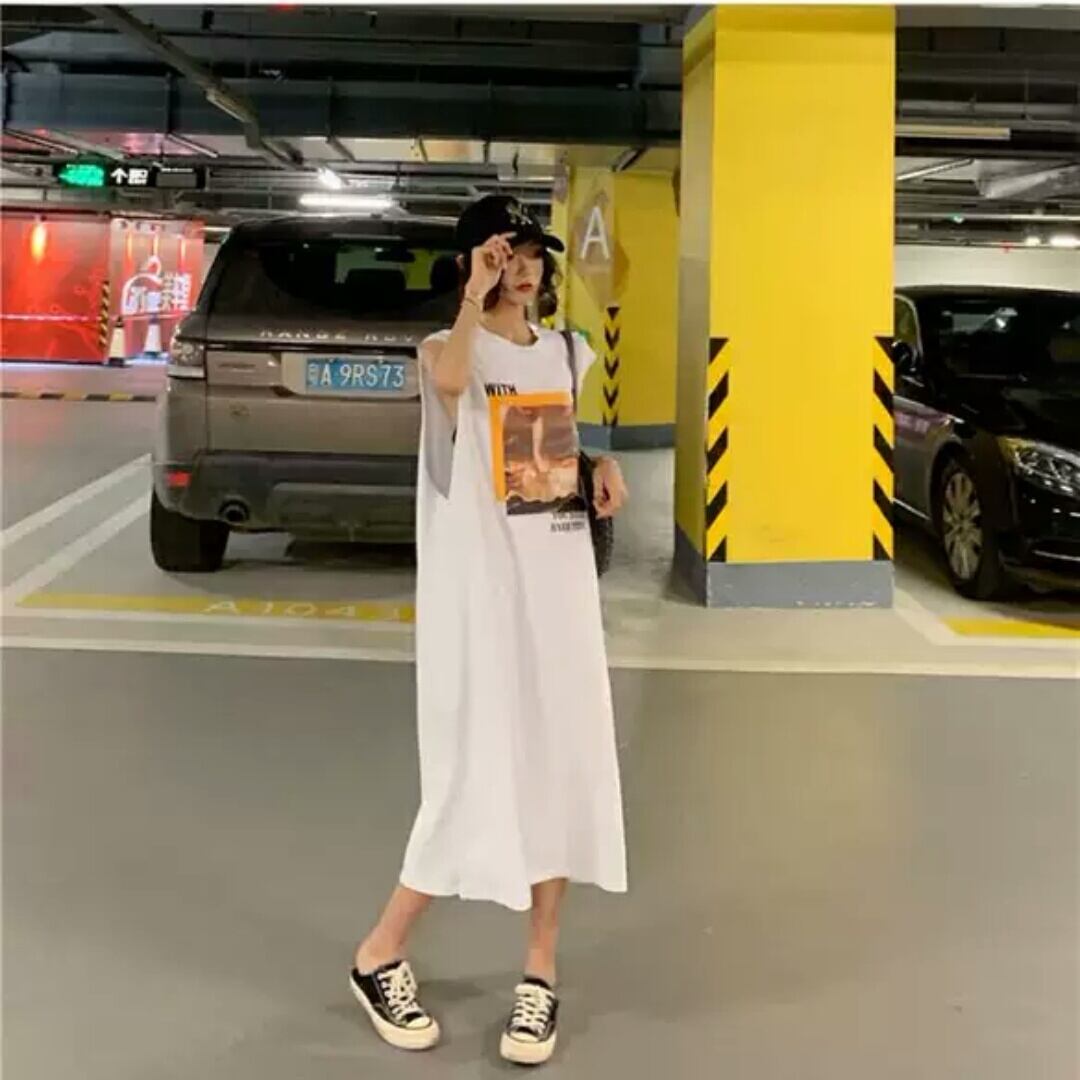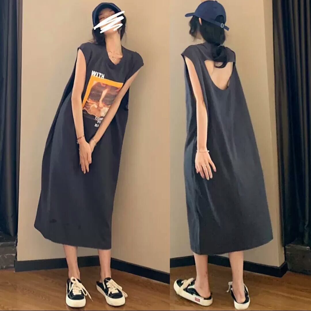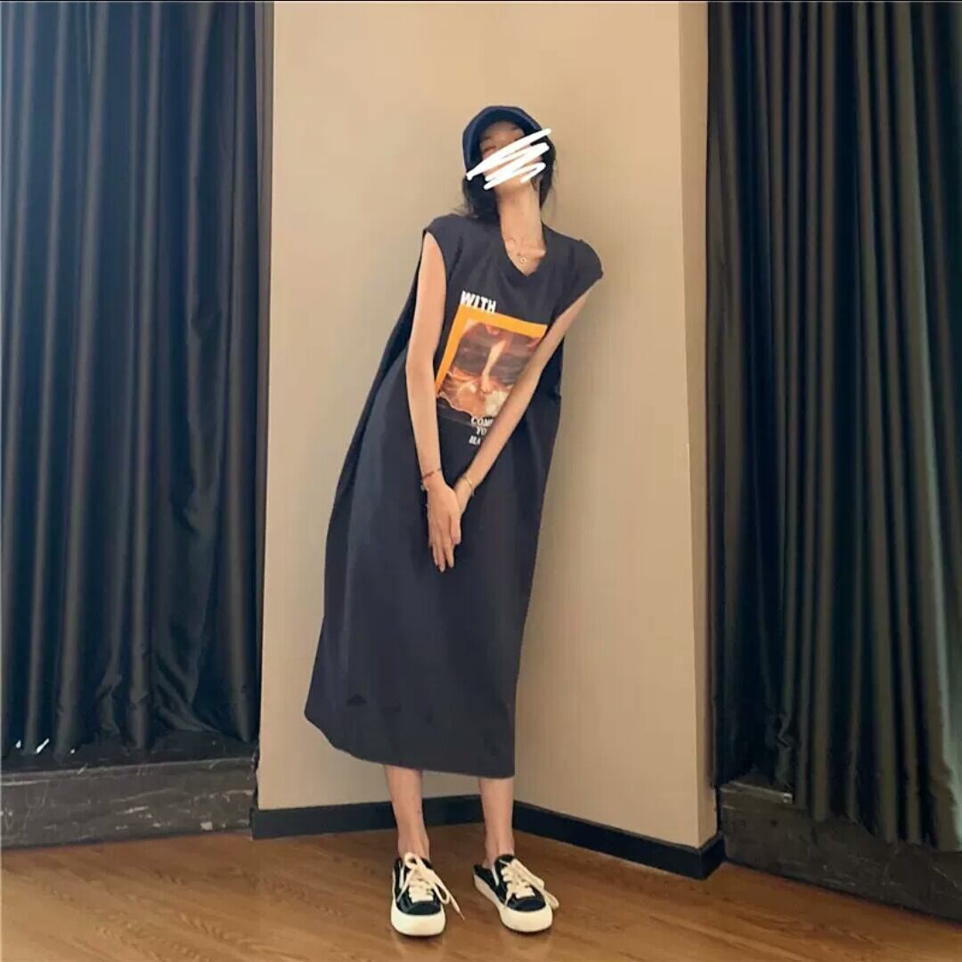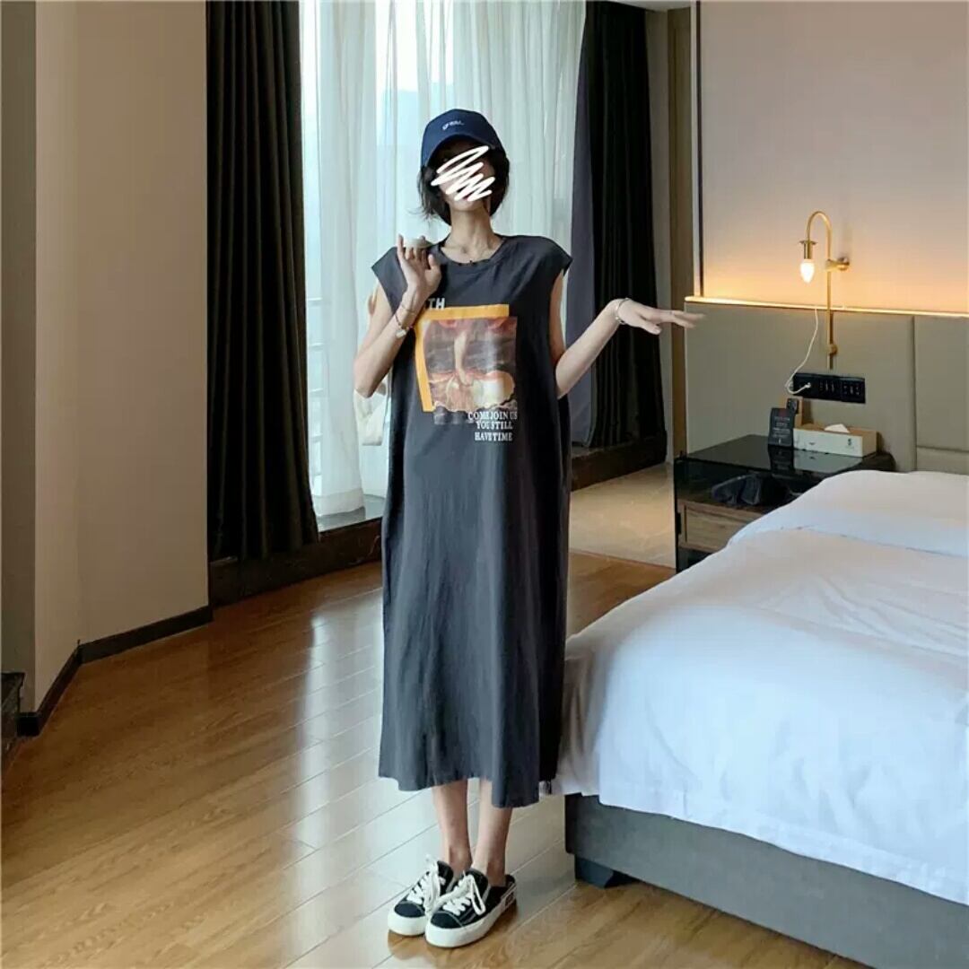 全2色 ノースリーブ プリント Tシャツ ワンピース ロング丈 ゆったり 大人 カジュアル 可愛い 個性的 お出かけ お買い物 デート 女子会 通学 学生 通勤 韓国ファッション 春 夏
