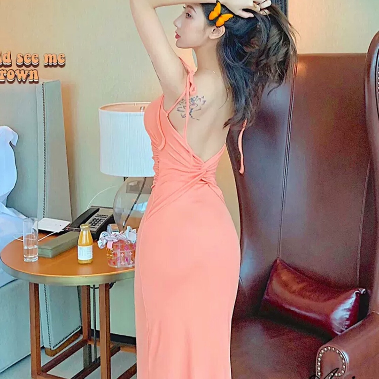 全2色 ストラップ スリム ワンピース タイト 無地 ミモレ丈 シンプル セクシー 大人 キレイめ エレガント お出かけ お買い物 デート 女子会 通学 学生 通勤 韓国ファッション