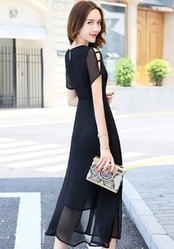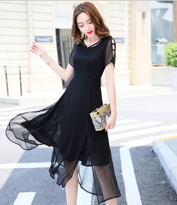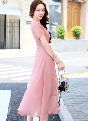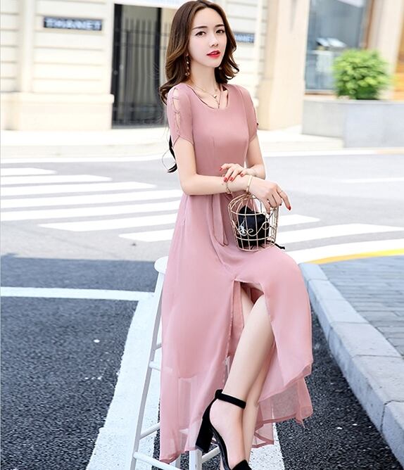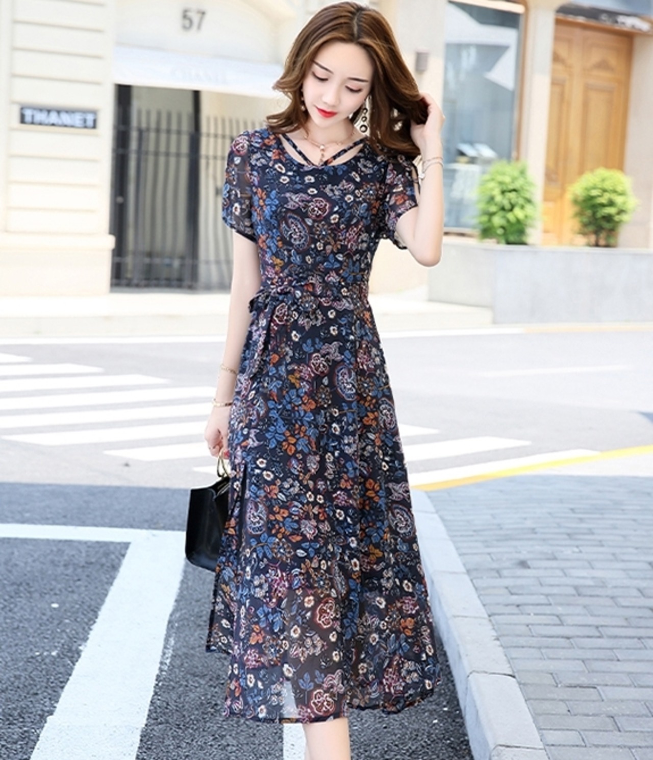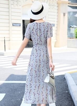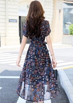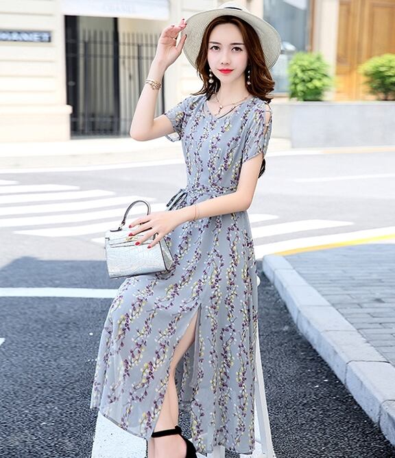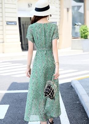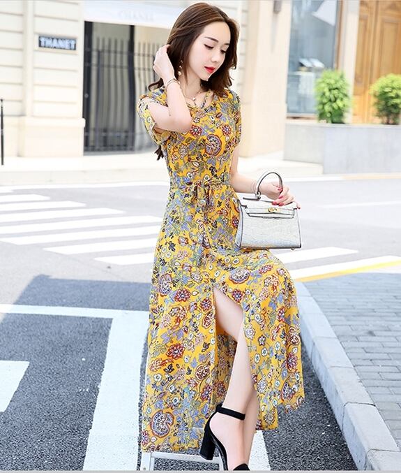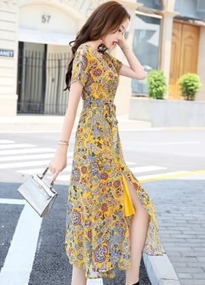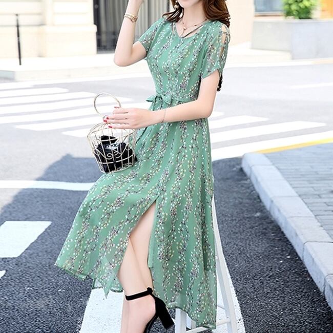 全7色 ワンピース ミモレ丈 花柄 シフォン サイドスリット ウエストリボン 袖コンシャス 半袖 シースルー 上品 カジュアル リゾート きれいめ 大人可愛い フレア 春 夏