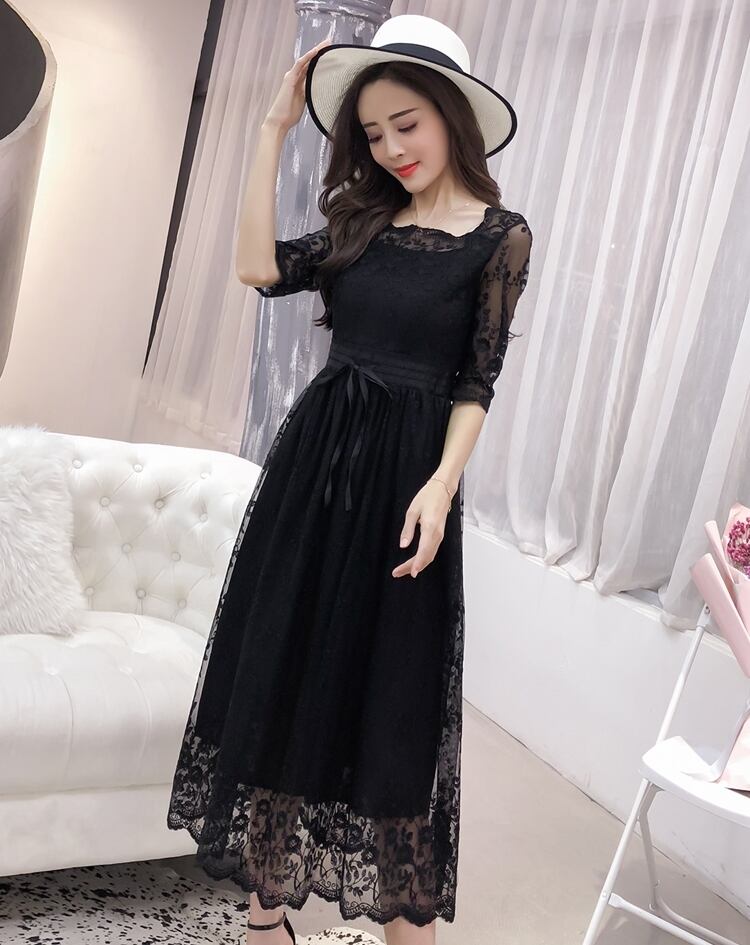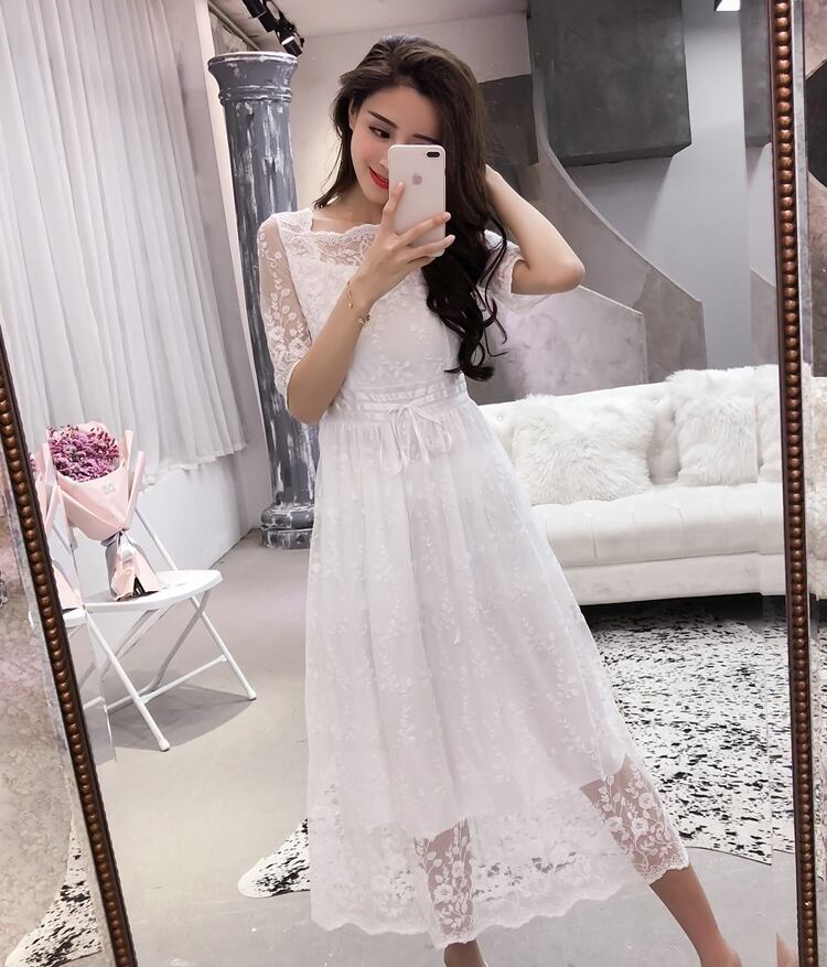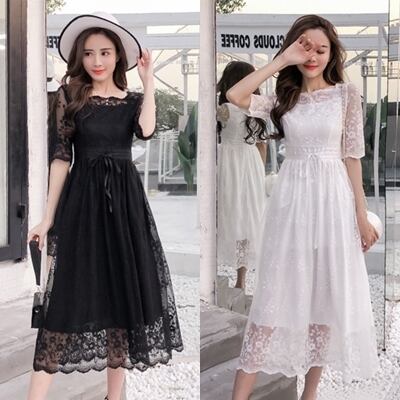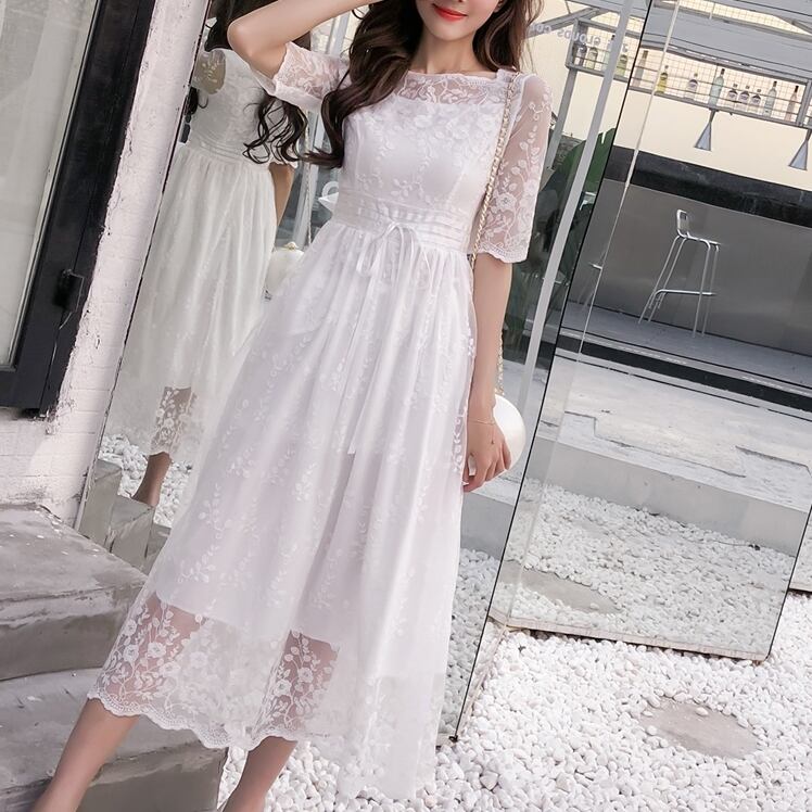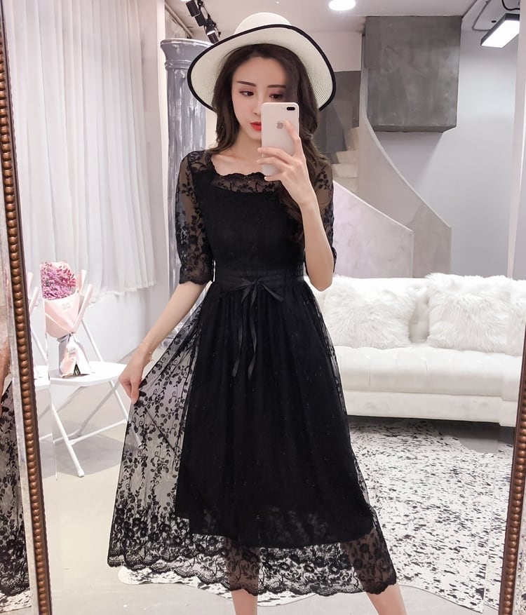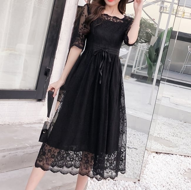 全2色 ワンピース ドレス 総レース シースルー Aライン 5分袖 ミモレ丈 スクエアネック ハイウエスト ウエストリボン フレア 花柄 上品 カジュアル エレガント 大人可愛い オケージョン お呼ばれ パーティー 春 夏