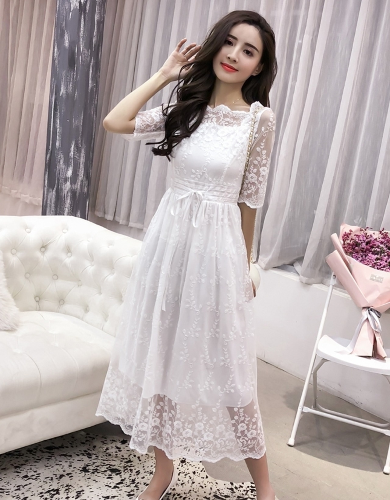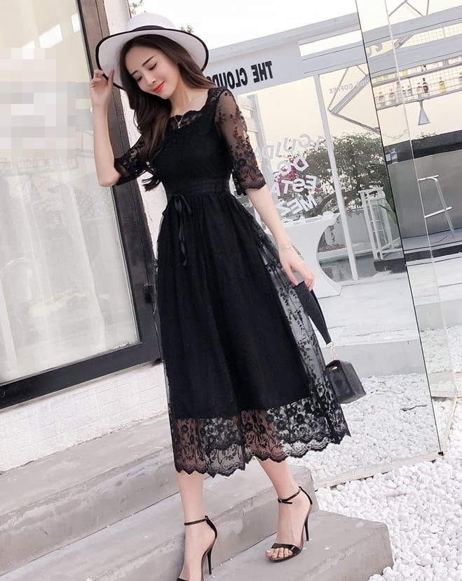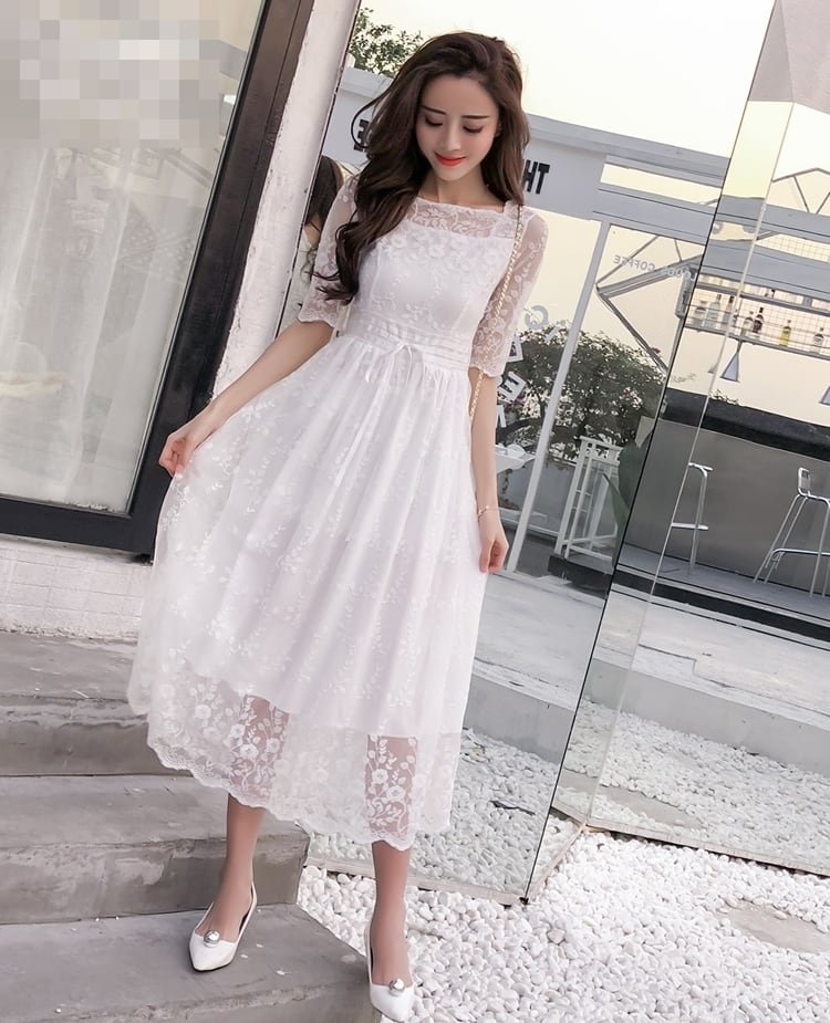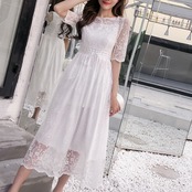 レースのディテールが美しいミモレ丈ワンピースドレスです。