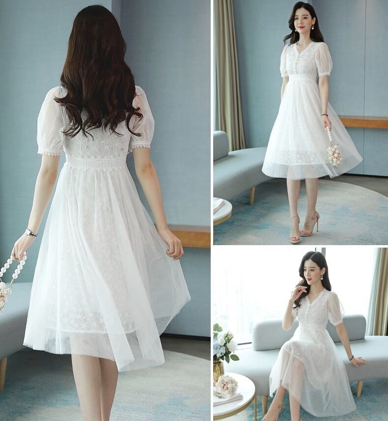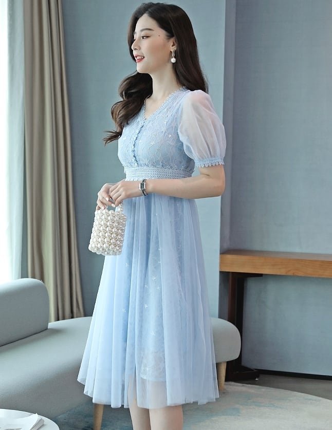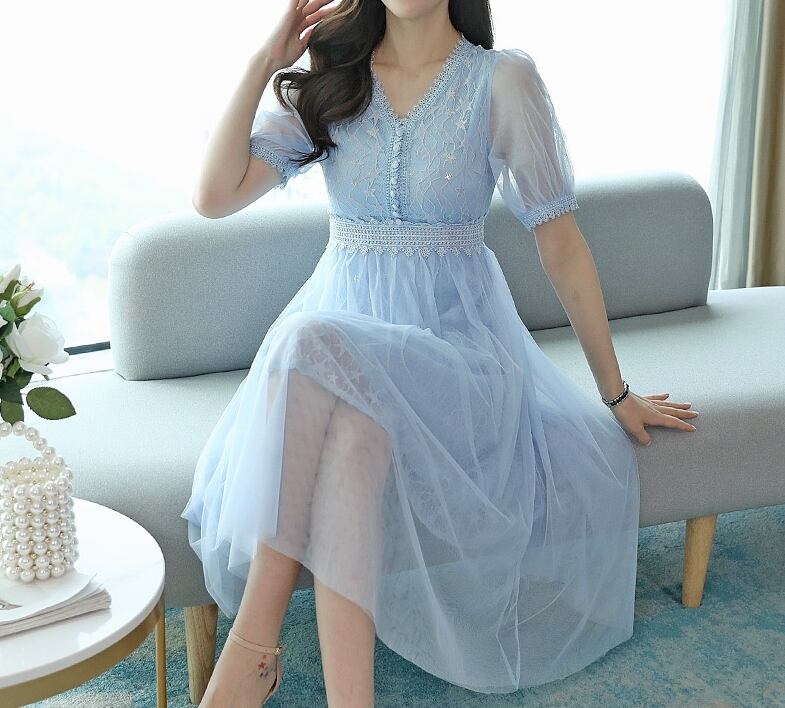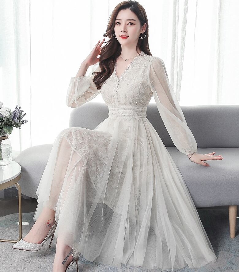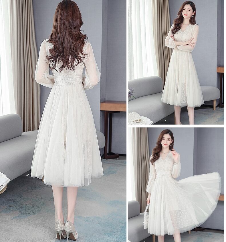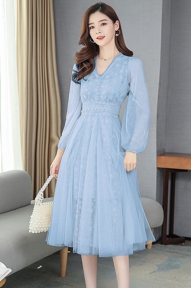 全3色 2種 ワンピース ドレス チュール 星 レース Vネック シースルー 長袖 半袖 ハイウエスト Aライン 上品 エレガント パーティー オケージョン お呼ばれ 可愛い 春 夏