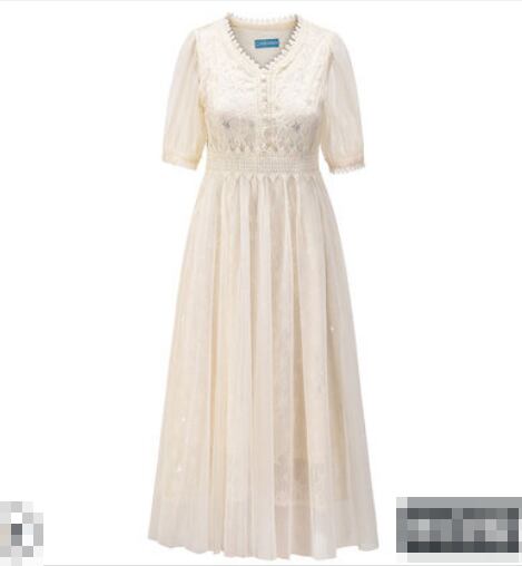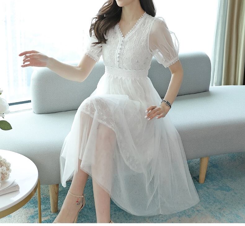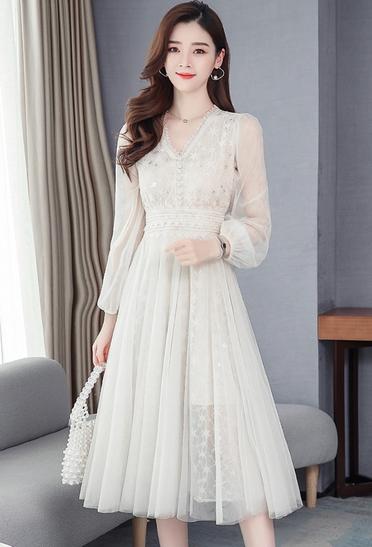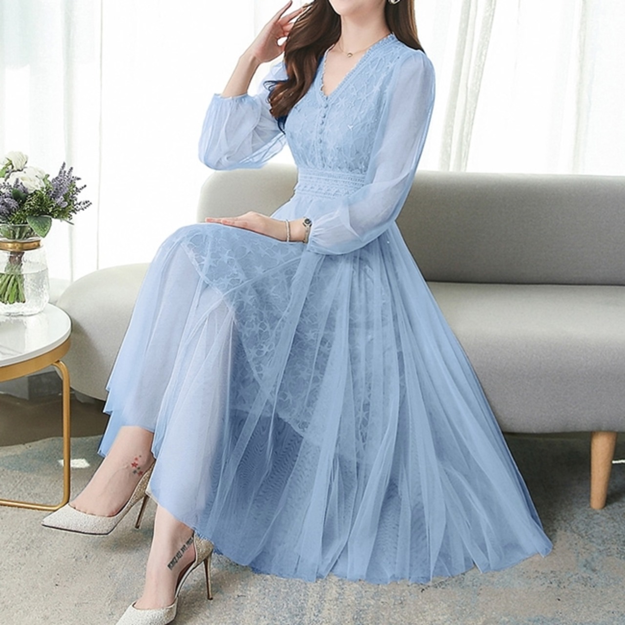 全3色 2種 ワンピース ドレス チュール 星 レース Vネック シースルー 長袖 半袖 ハイウエスト Aライン 上品 エレガント パーティー オケージョン お呼ばれ 可愛い 春 夏