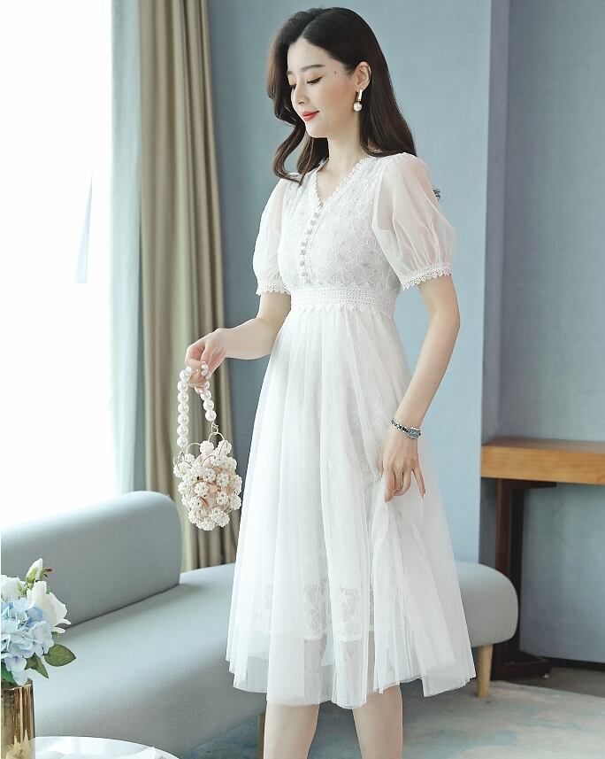 レース切り替えデザインが上品で大人可愛い印象のドレスです。