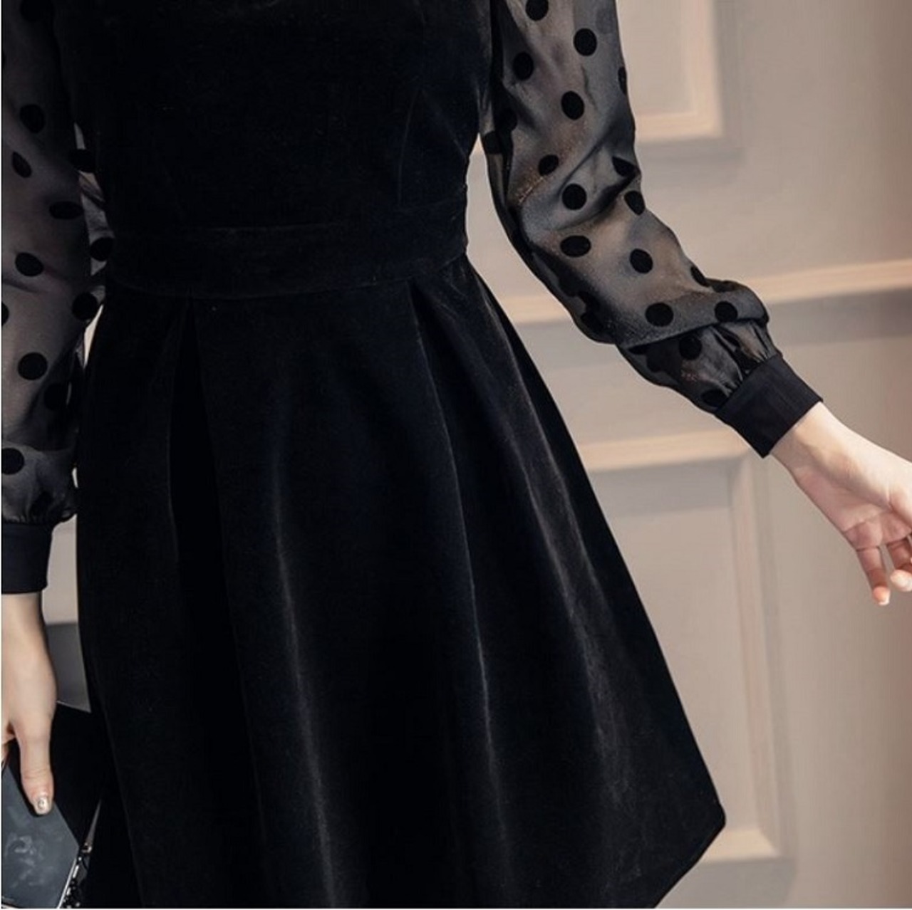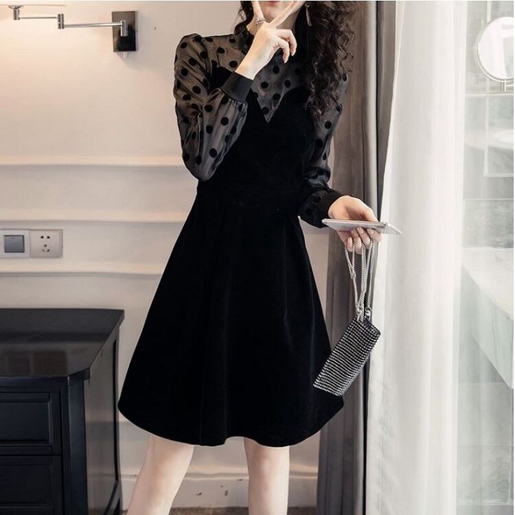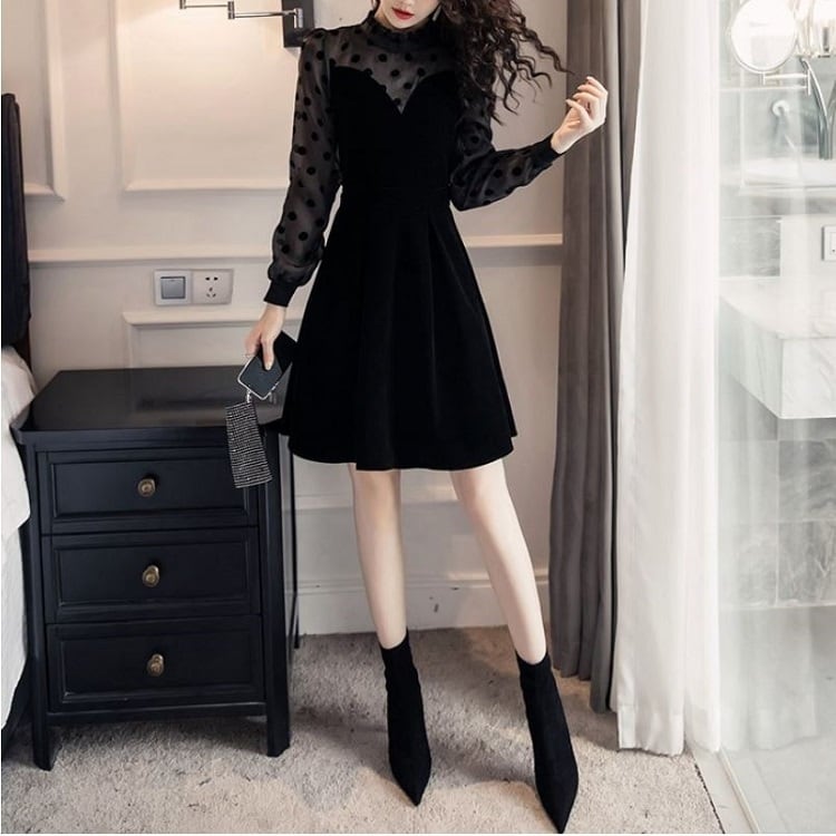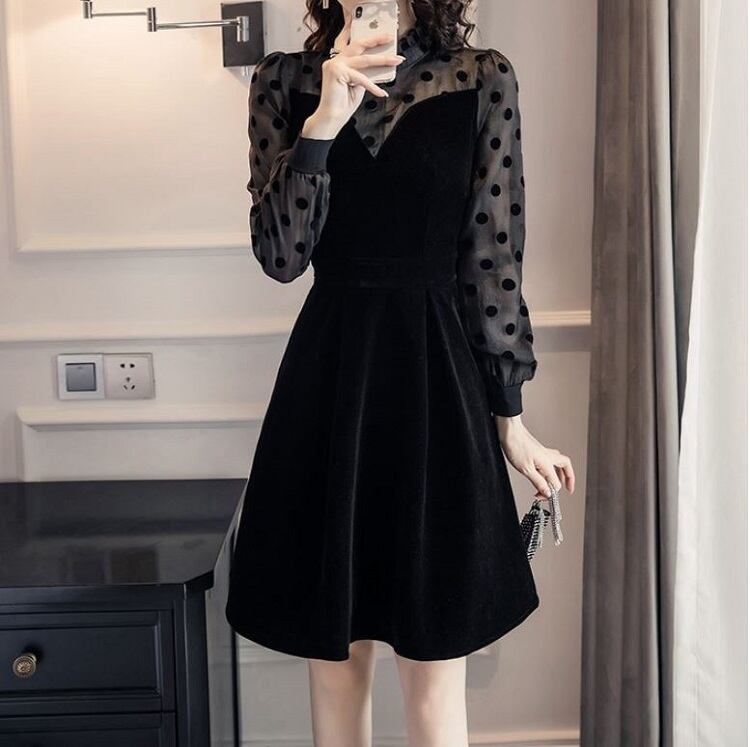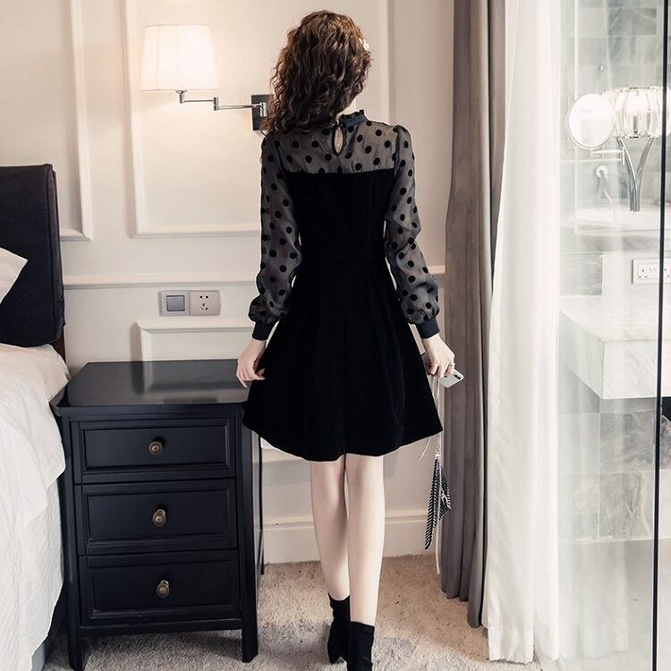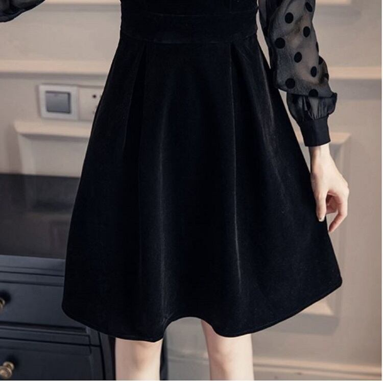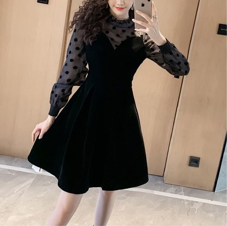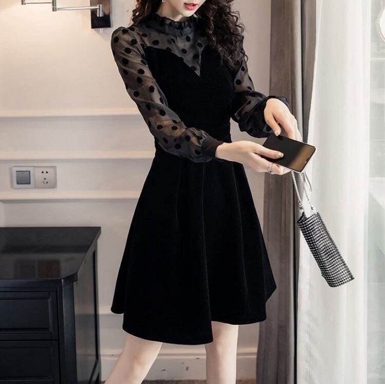 ミニワンピース パーティドレス 長袖 レース ドット フレア ベロア ひざ丈 きれいめ レトロ フォーマル 結婚式 二次会 ブラック