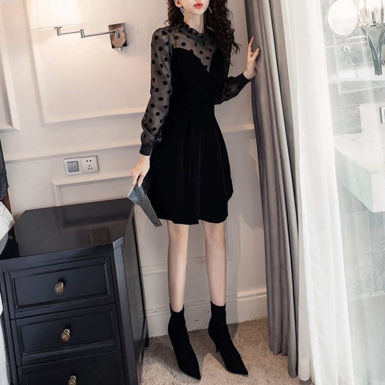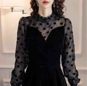 ドット柄レースの透け感がエレガントなベロアドレス。